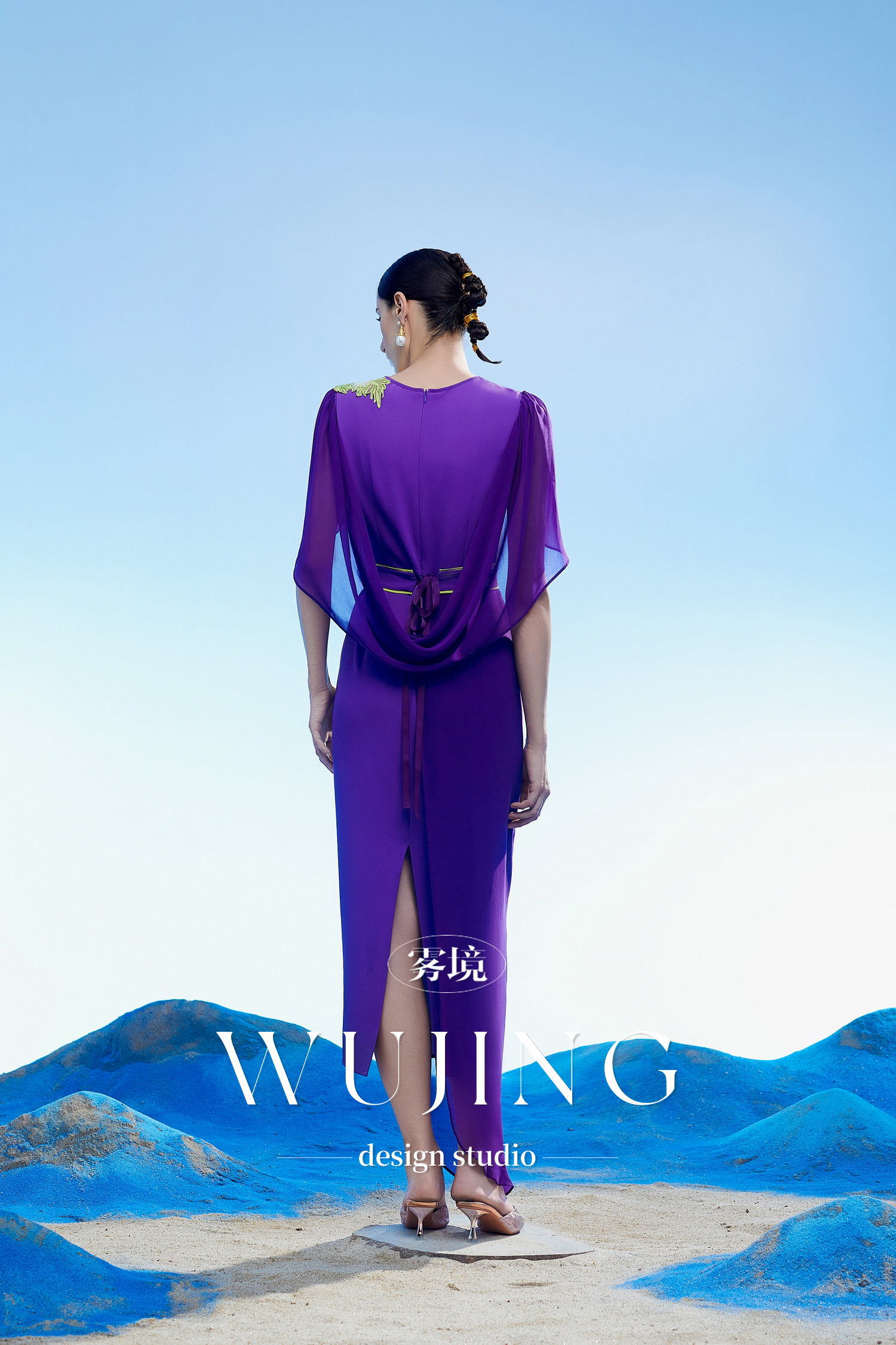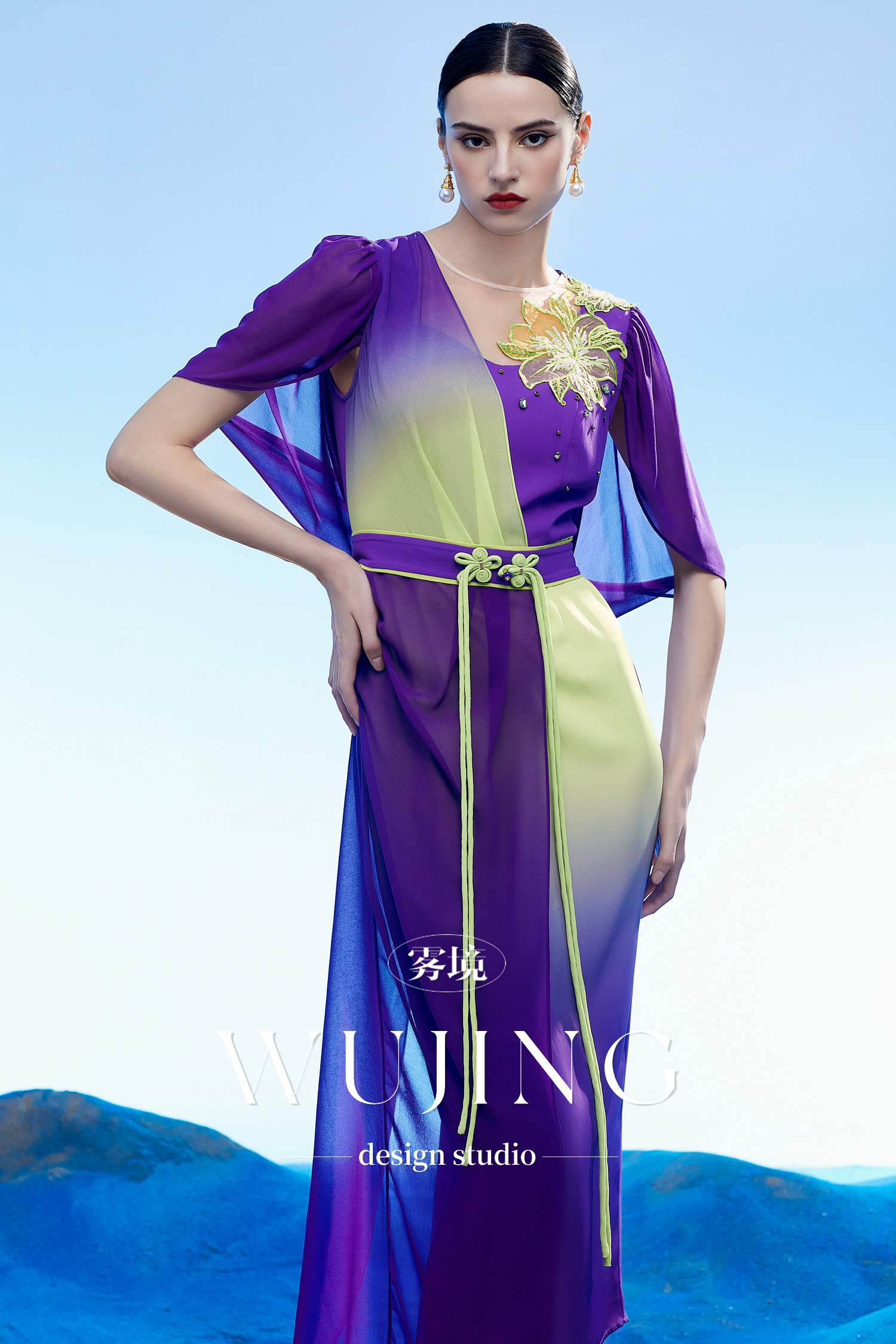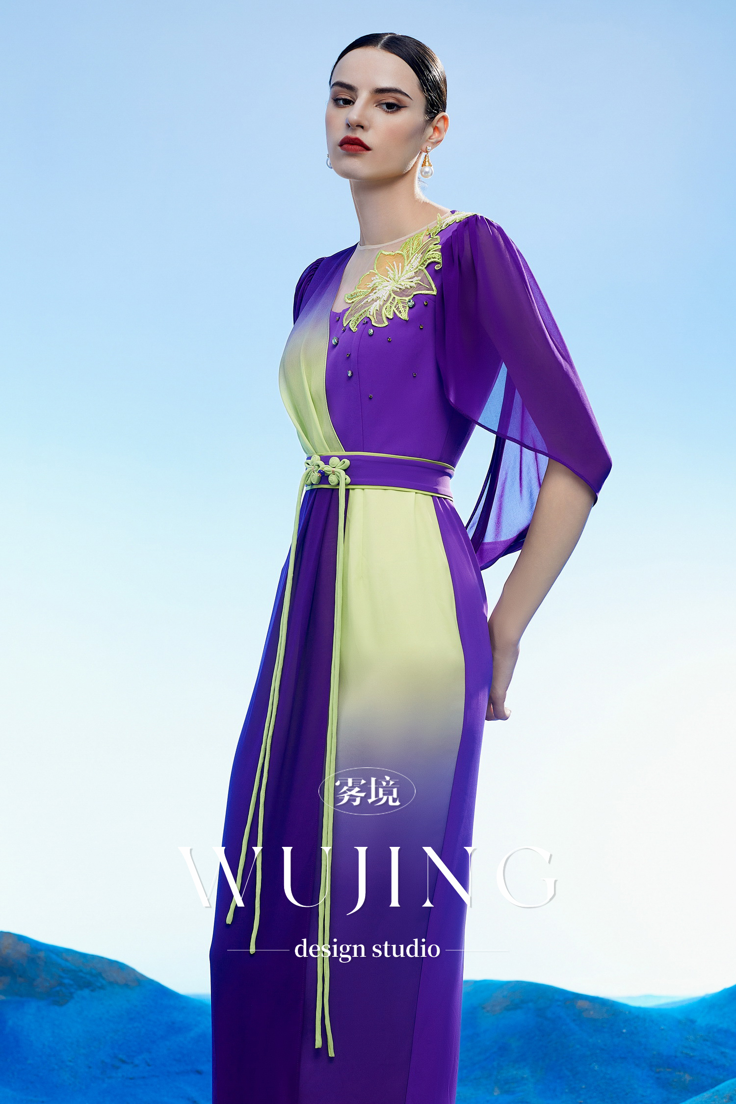3204110 玉碧紫鸾 韩国进口水晶乔其纱进口纹理蜂窝缎连衣裙 雾境