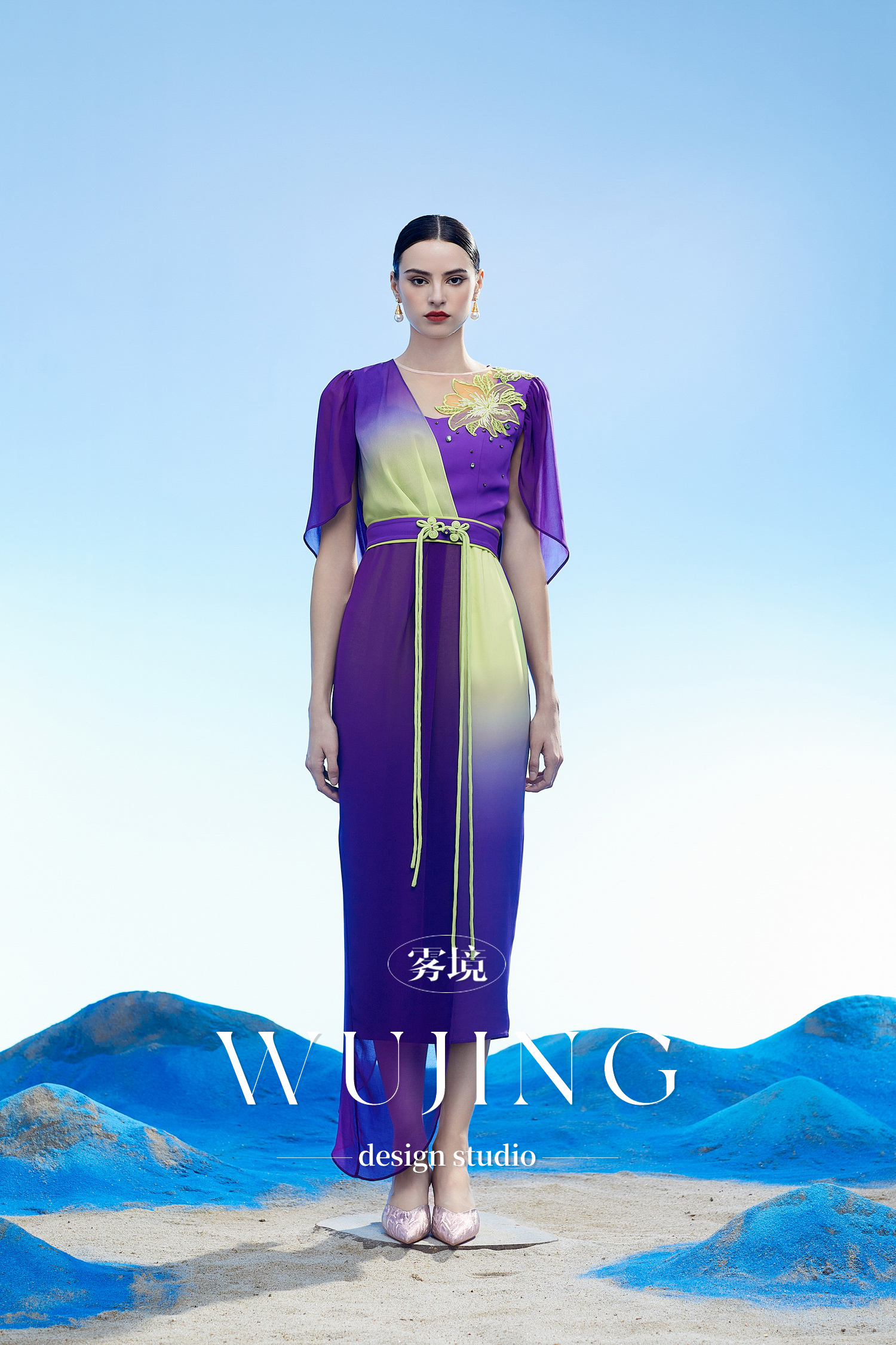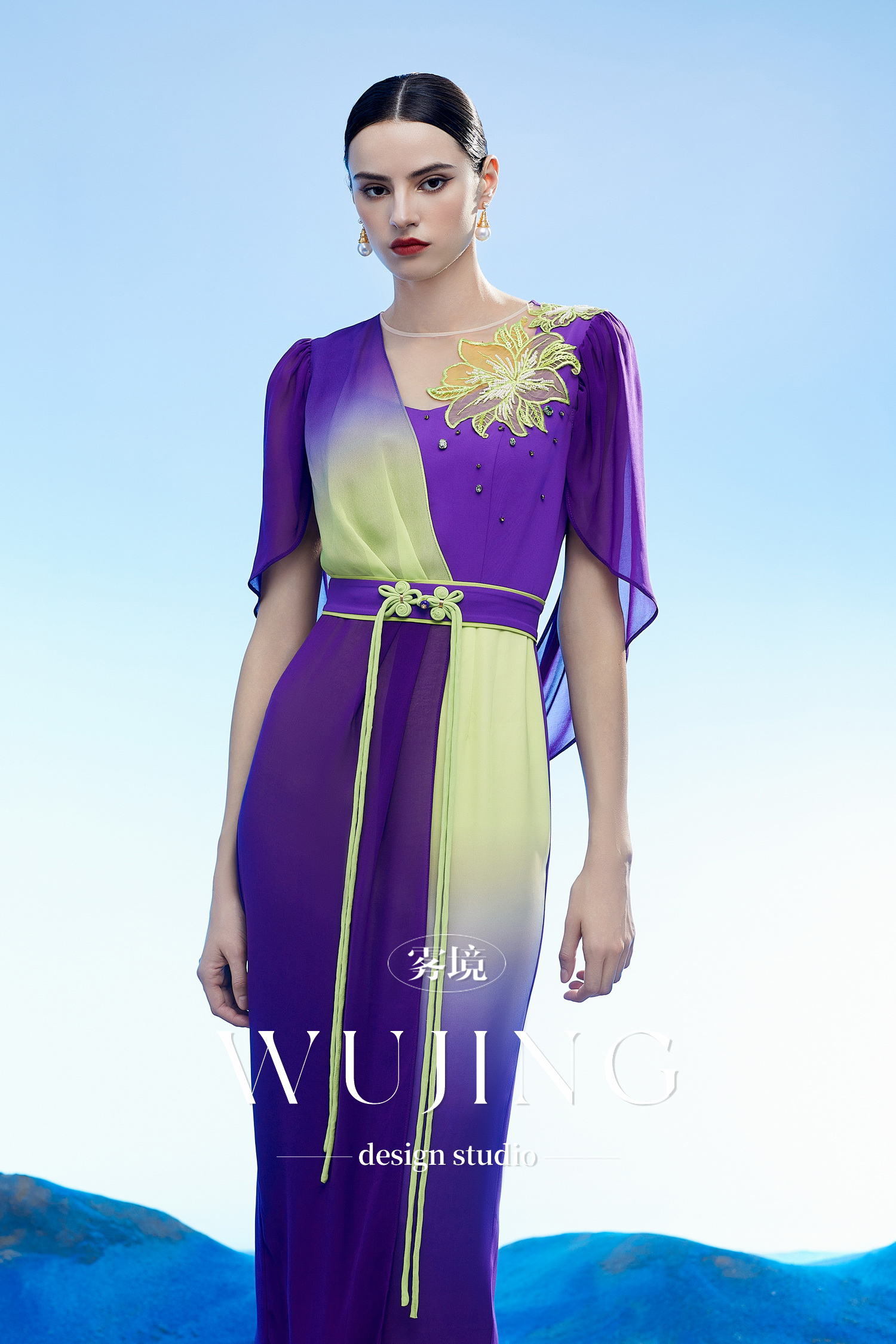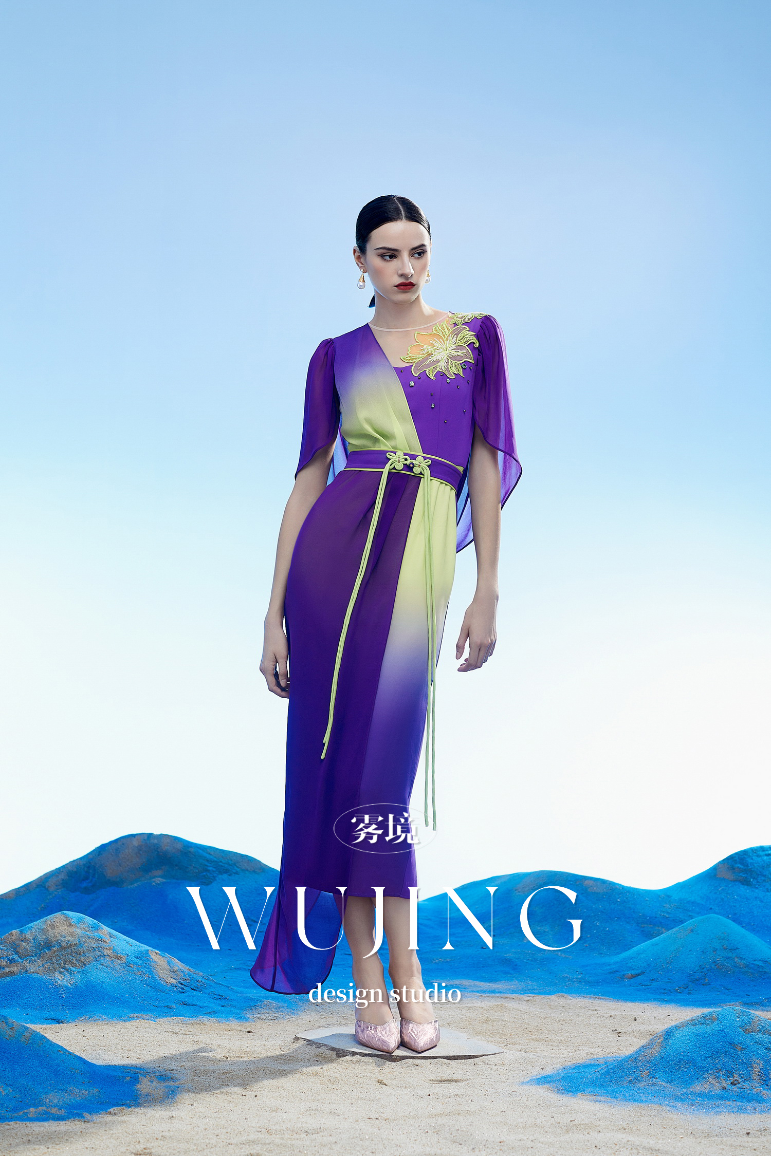 3204110 玉碧紫鸾 韩国进口水晶乔其纱进口纹理蜂窝缎连衣裙 雾境
