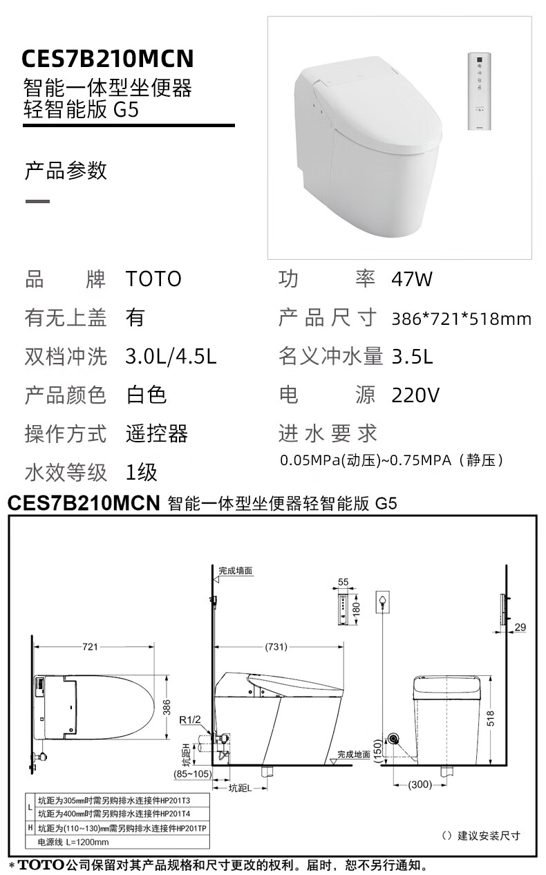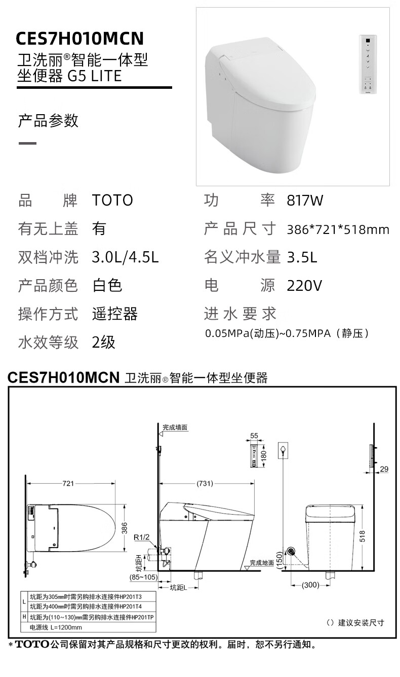 【10件起订】TOTO轻智能2025新款CES7B010MCN一体式抗菌G5-Lite智能坐便(02) CES7B010MCN轻智能【自动冲水】 305/300mm