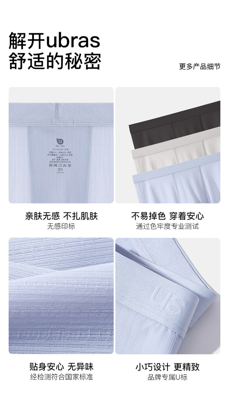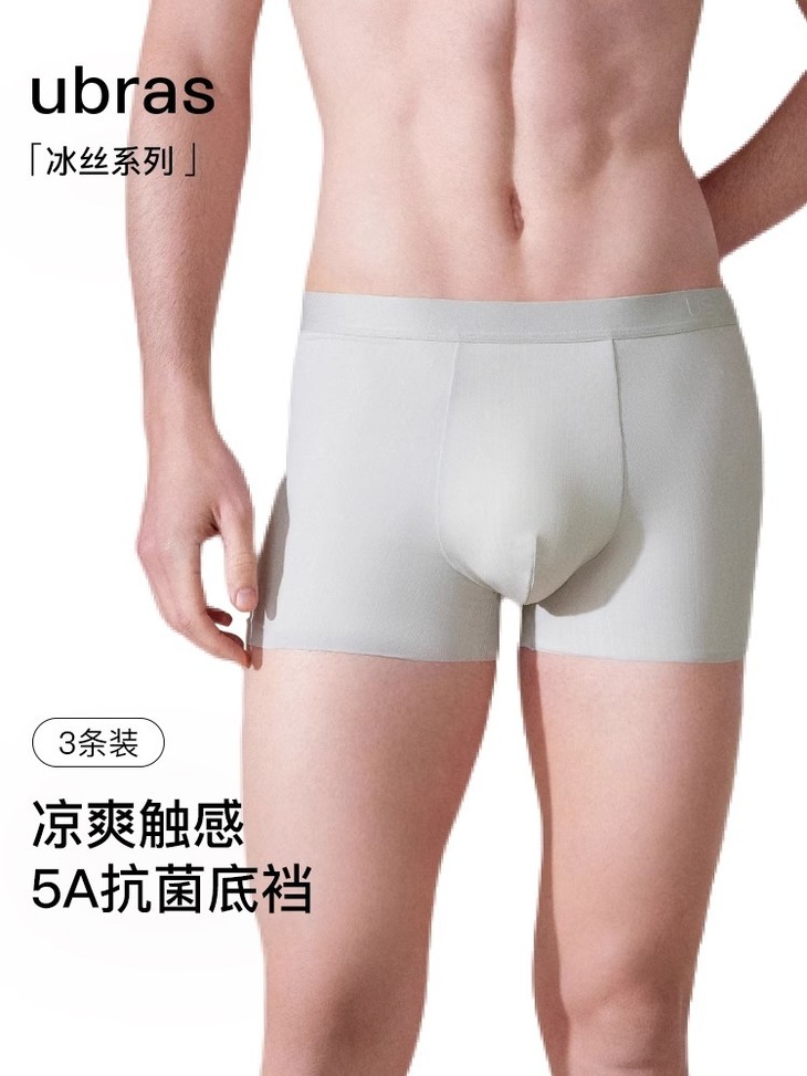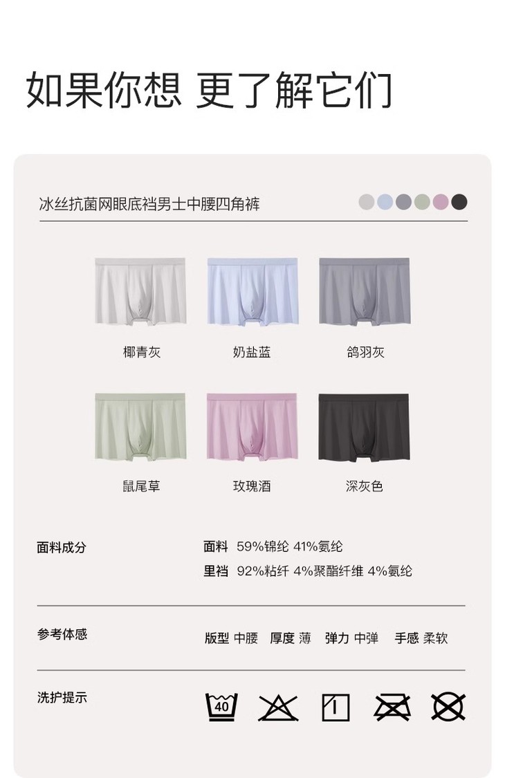 ubras冰丝抗菌网眼底裆男士中腰四角裤(三条装) ✅精选日晒新疆棉,同时添加氨纶纤维,细腻柔软有弹力 ✅采用网眼抗菌裆布,5A级抗菌性,满满网眼更透气