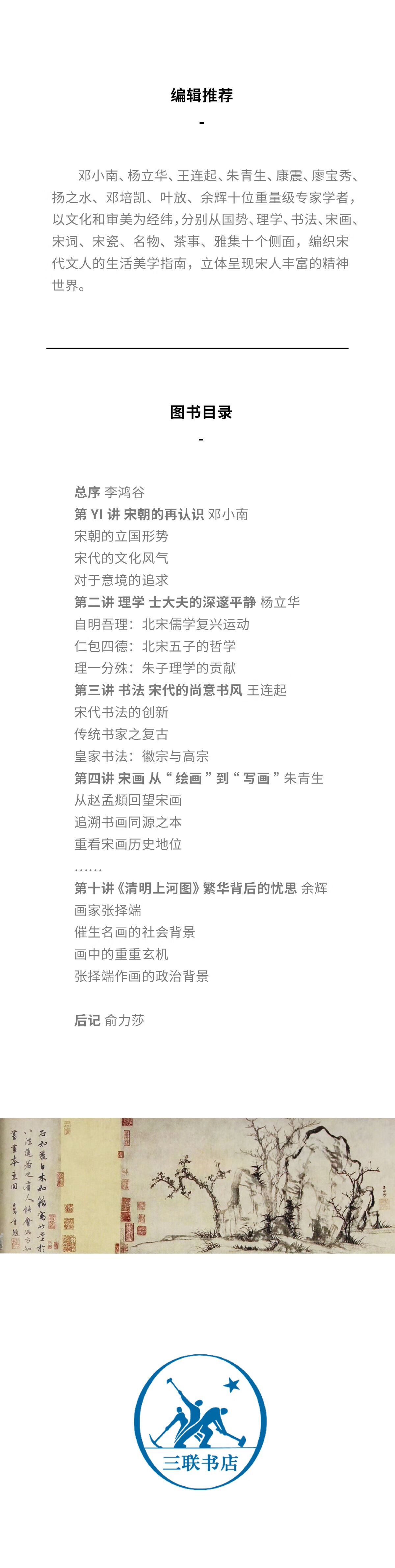 三联邀请邓小南、杨立华、王连起、朱青生、康震、廖宝秀、扬之水、邓培凯、叶放、余辉十位重量级专家学者,以文化和审美为经纬,分别从国势、理学、书法、宋画、宋词、宋瓷、名物、茶事、雅集十个侧面,编织宋代文人的生活美学指南,立体呈现宋人丰富的精神世界,以及千年不坠的艺术传统。全书四色印刷,选配近三百幅精美高清图片,充分展示宋代文物的质地和细节,可供鉴赏与收藏。
