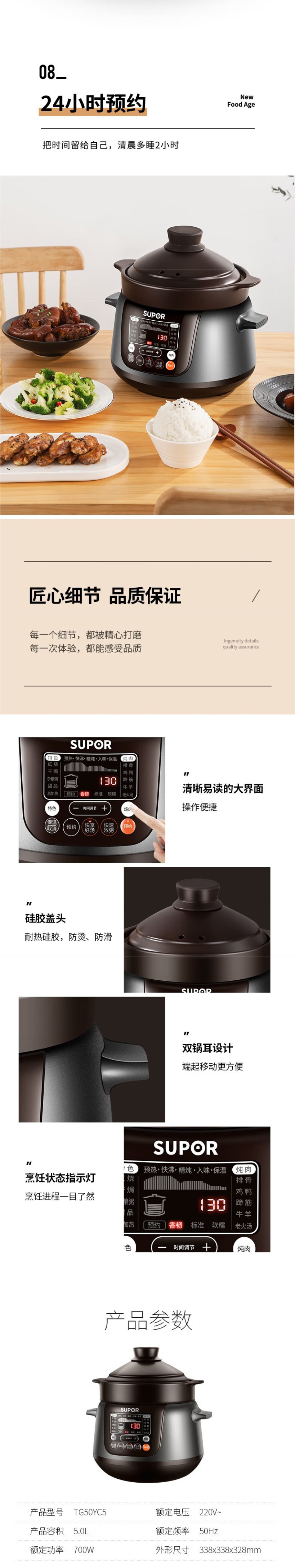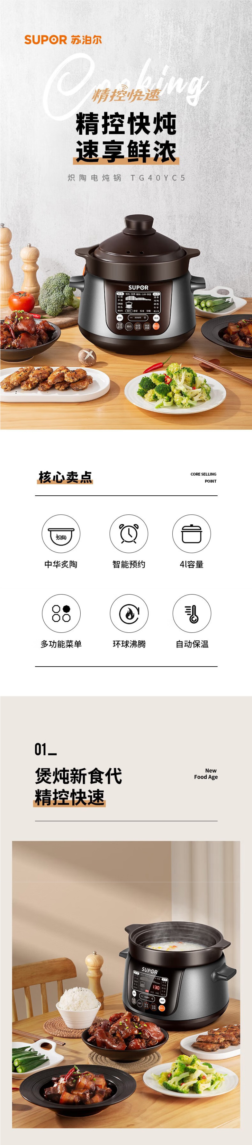 苏泊尔(SUPOR)电炖锅(510593)5升家用电炖盅精控快炖电砂锅耐高温内胆炖汤养生煮粥煲汤锅智能预约TG50YC5