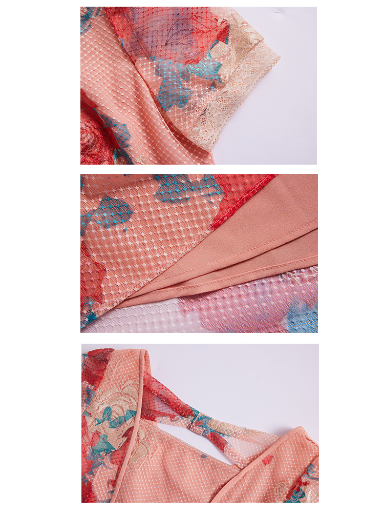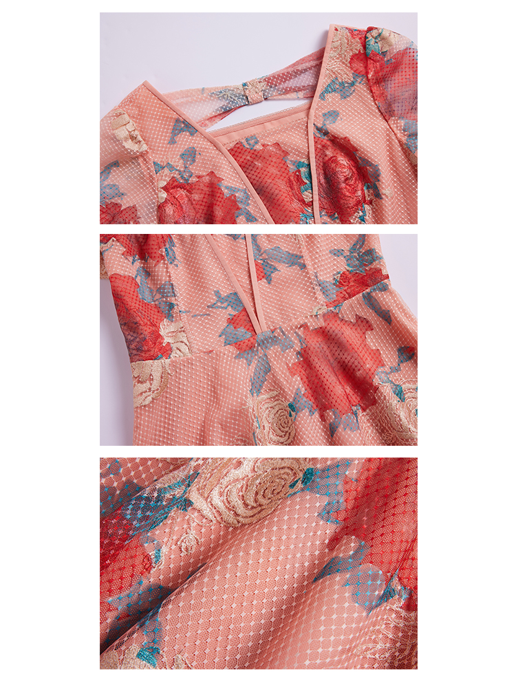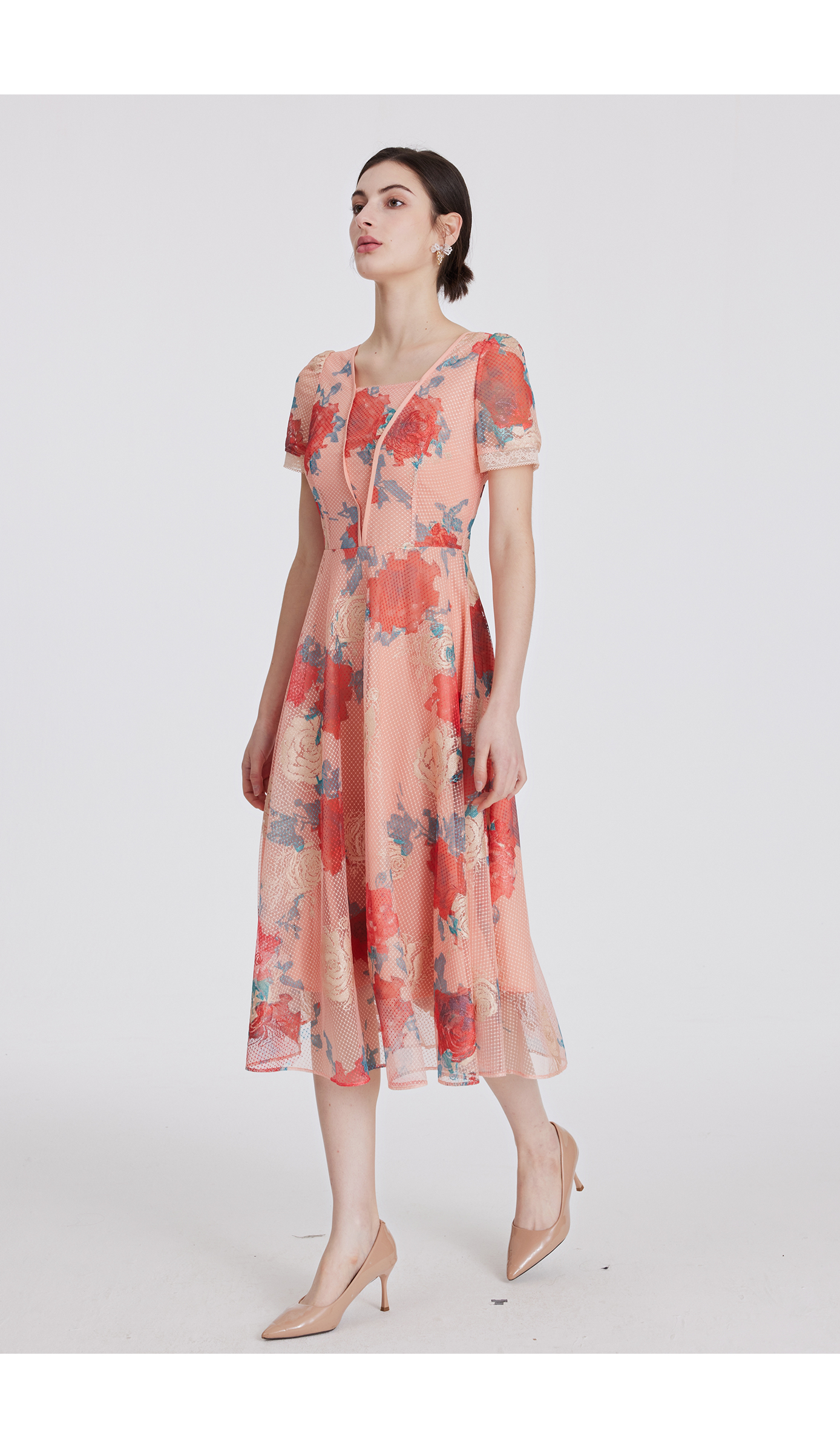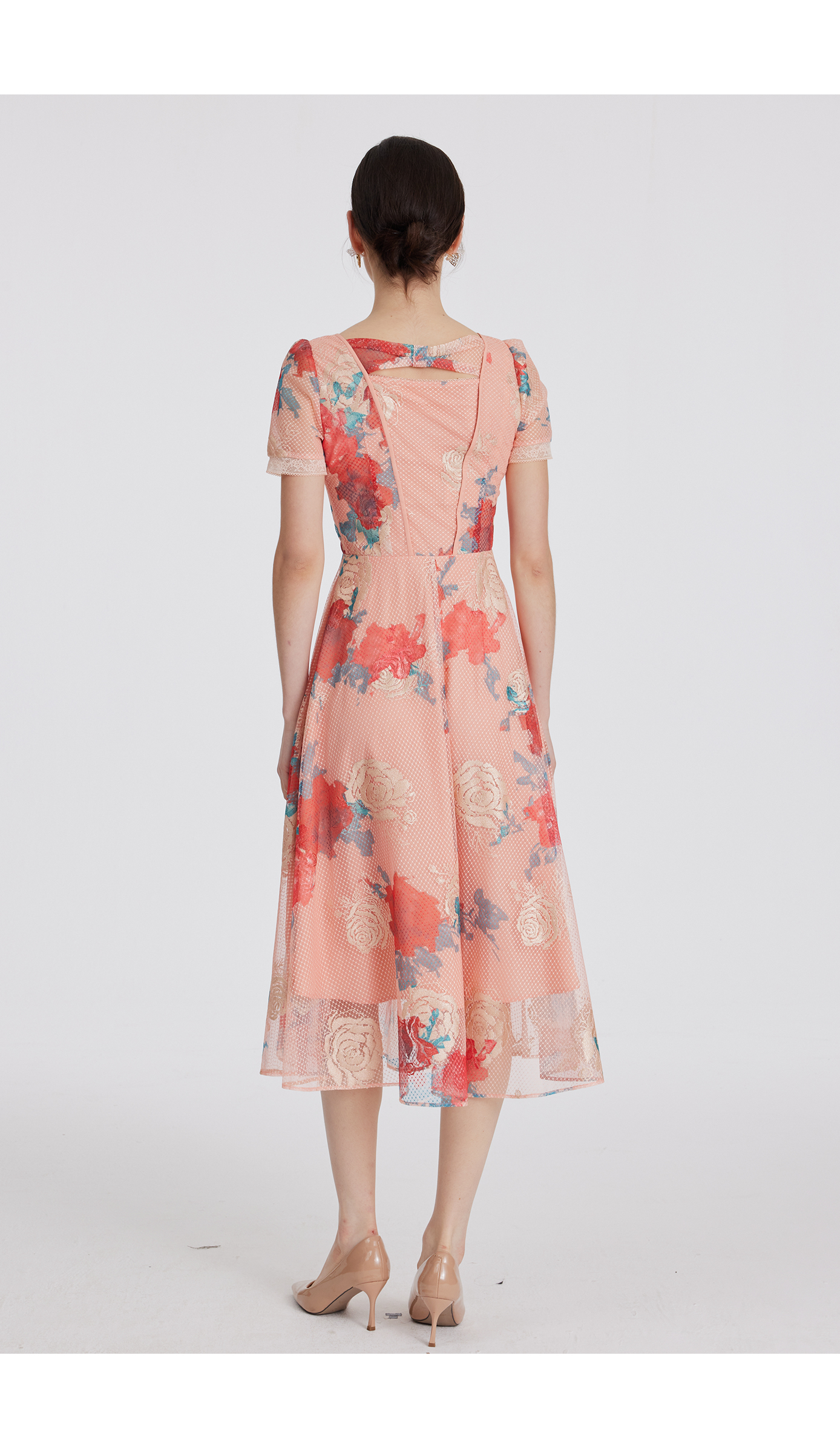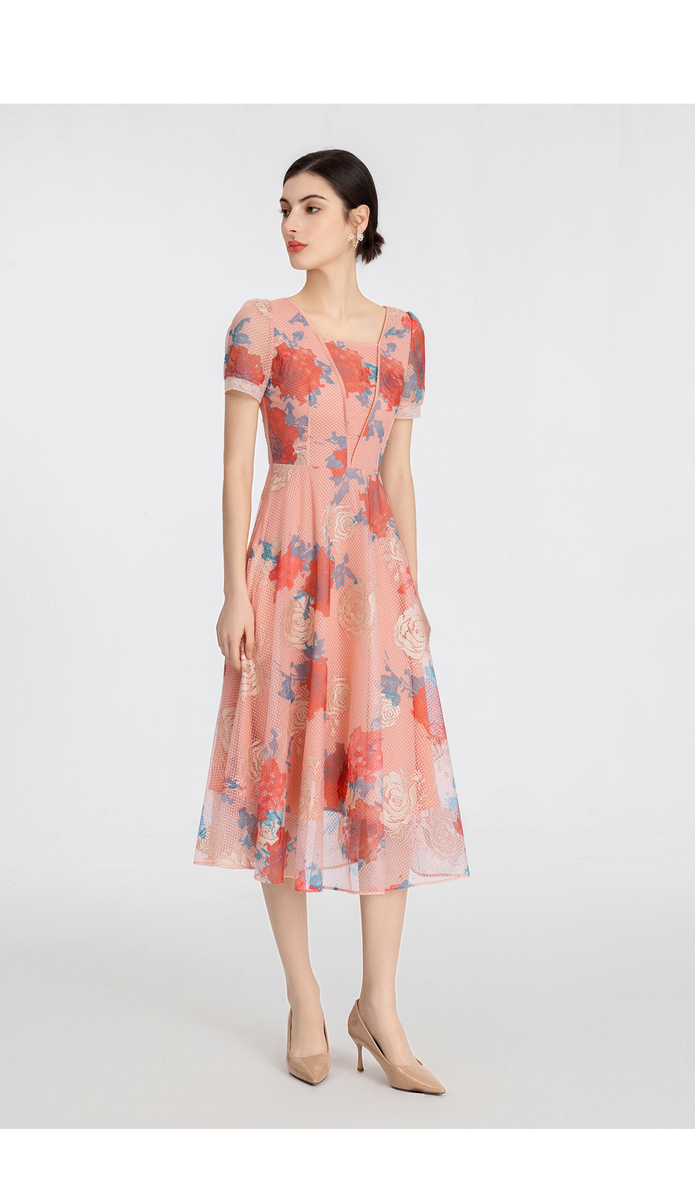 司歌网纱刺绣印花连衣裙古典优雅短袖显瘦