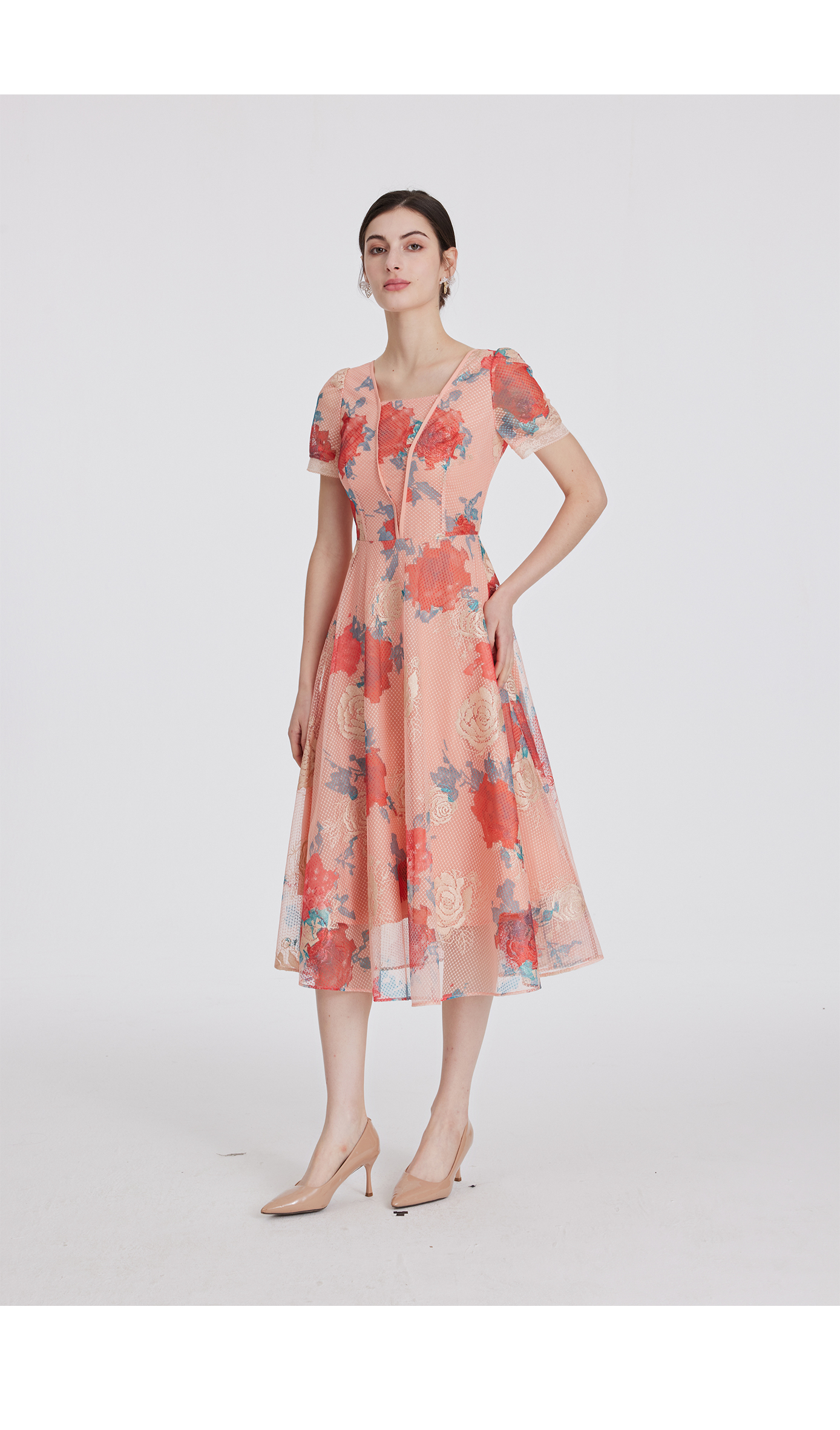 司歌刺绣印花连衣裙圆领短袖收腰优雅端庄A891054X