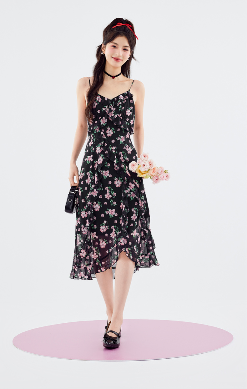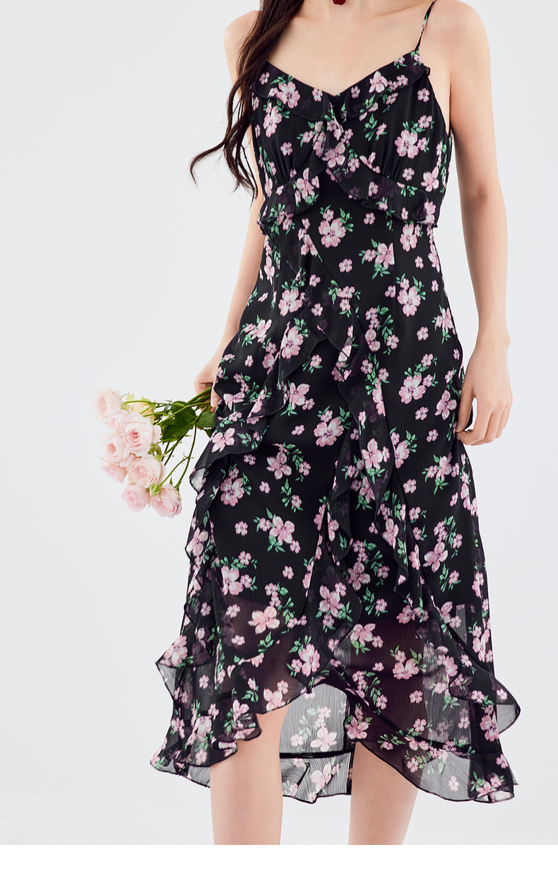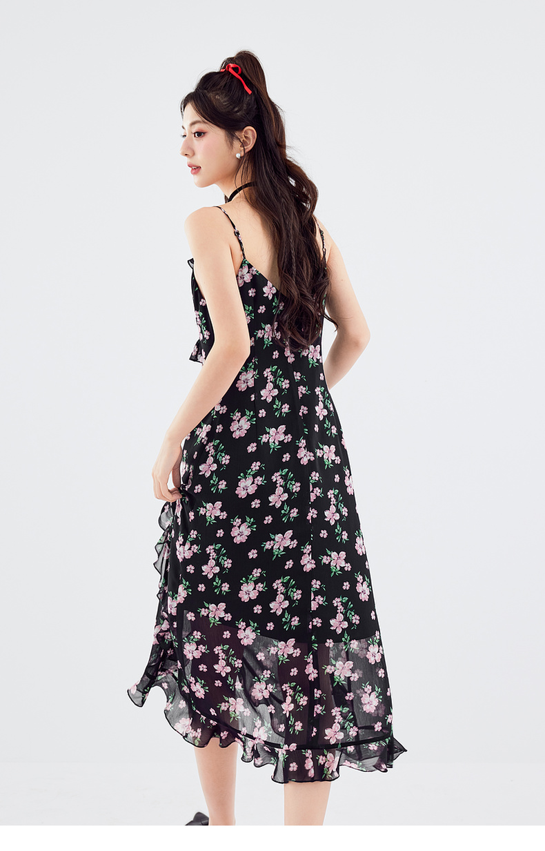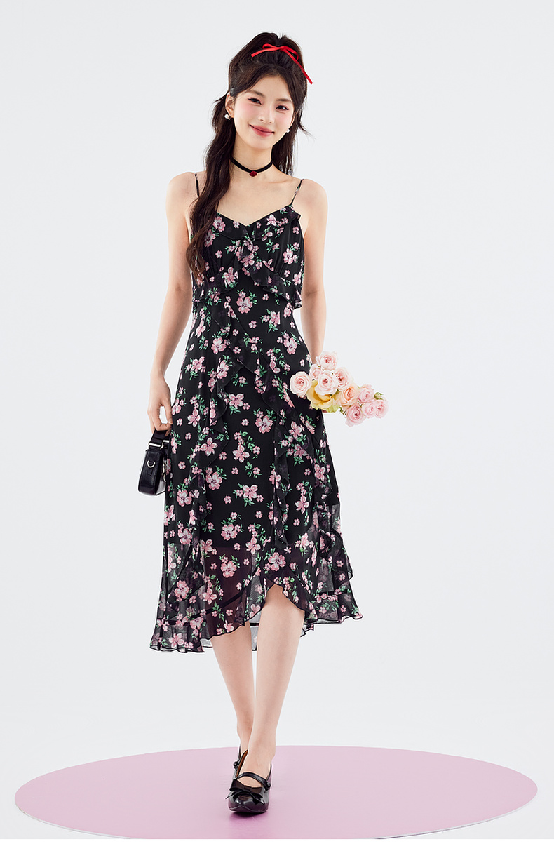 【严选】诗凡黎连衣裙吊带裙子女2024春夏新款碎花印花浪漫荷叶边温柔SF5491681