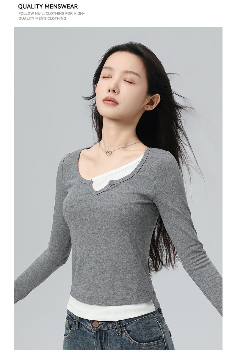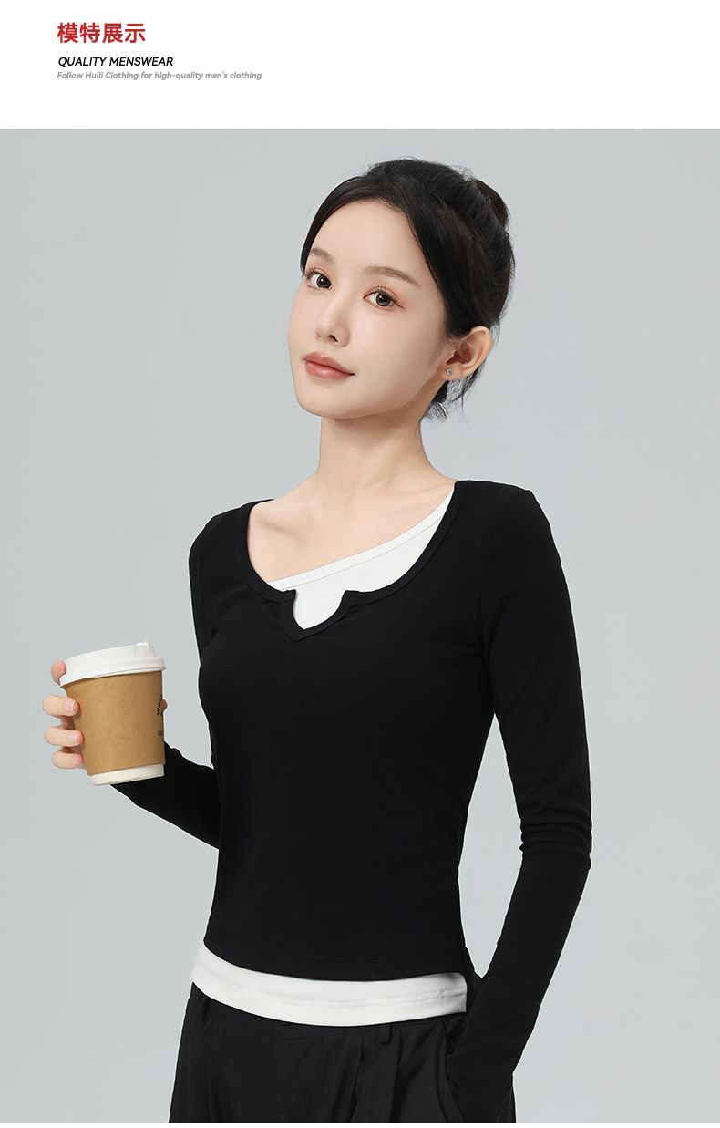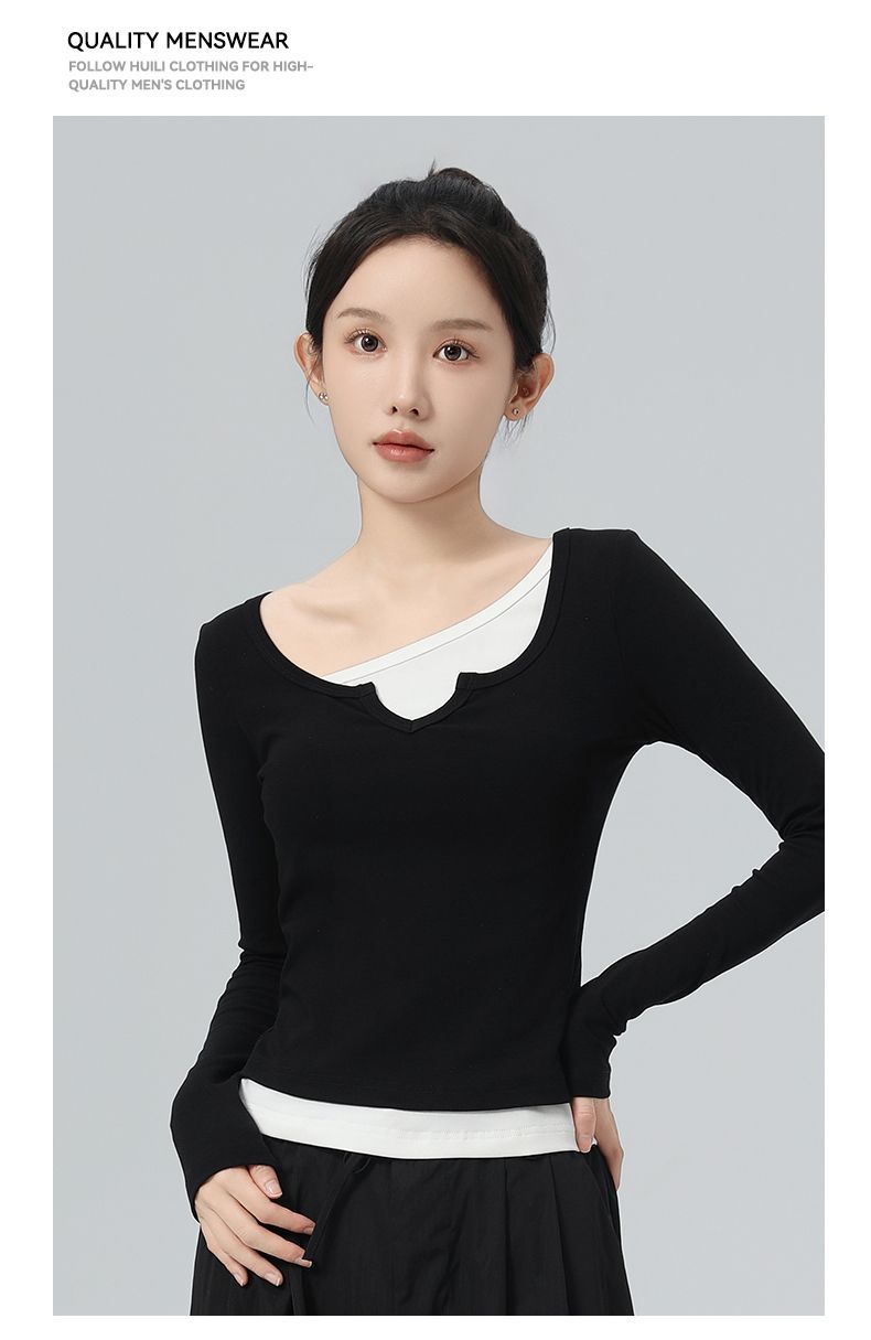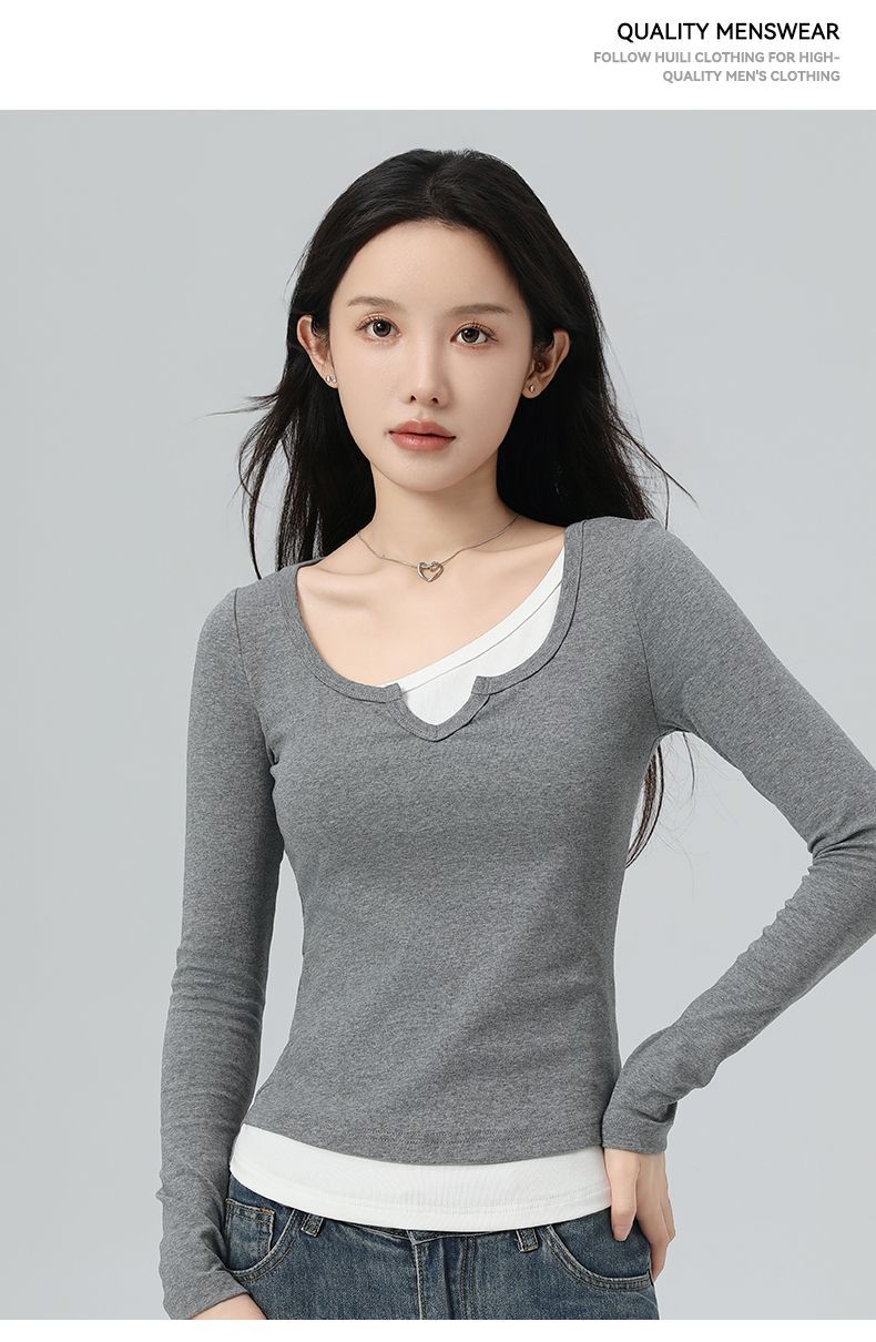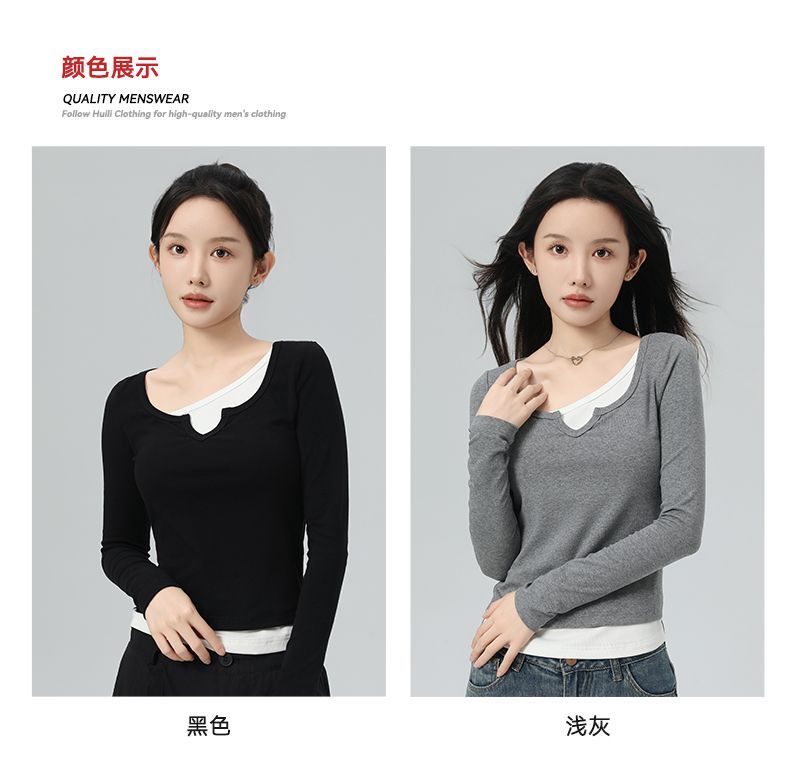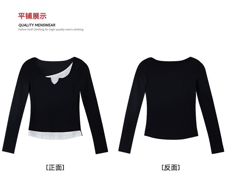 回力假两件长袖上衣女t恤早秋初秋内搭v领修身正肩短款针织打底衫