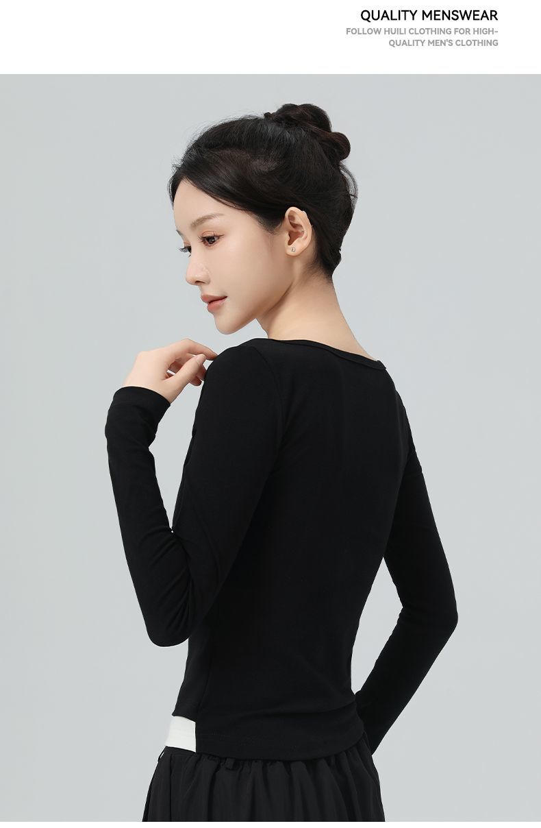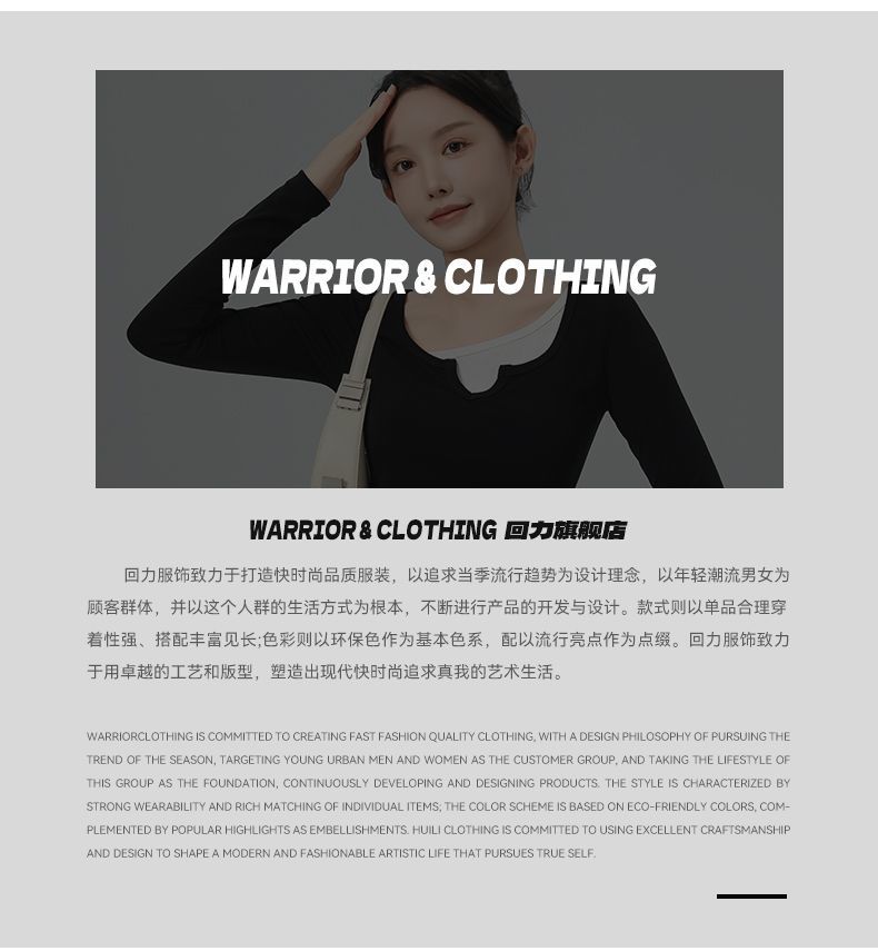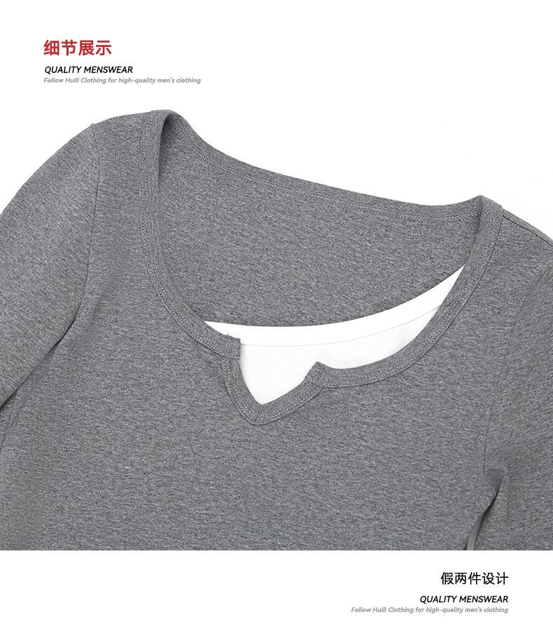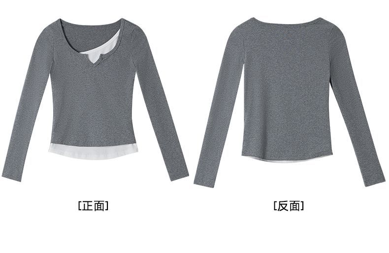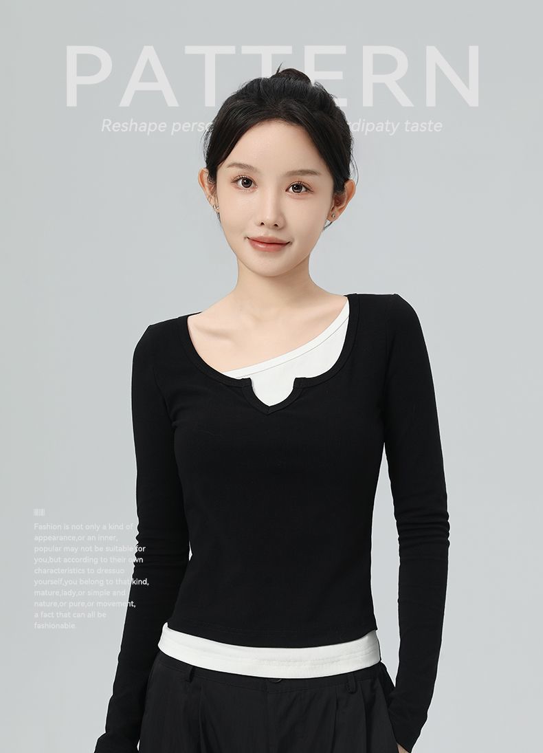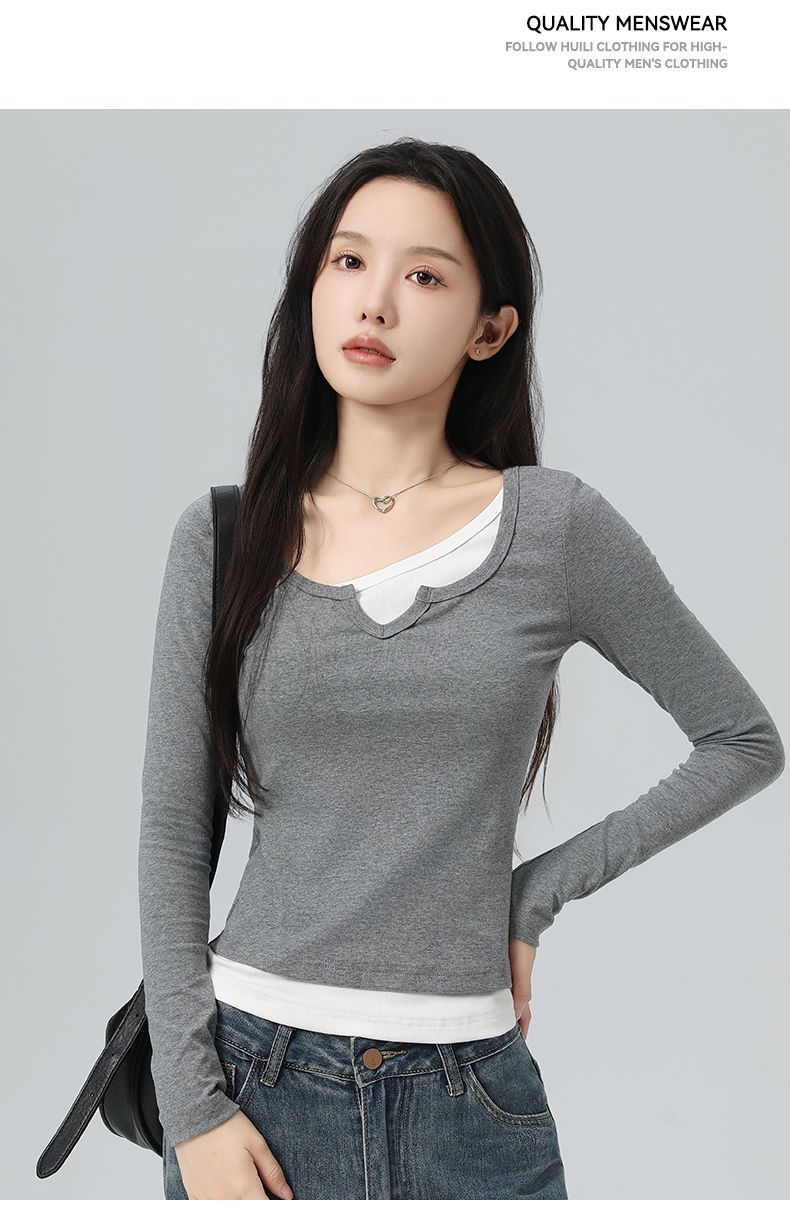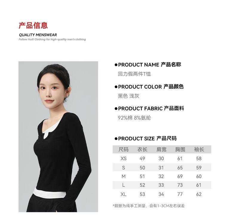 回力假两件长袖上衣女t恤早秋初秋内搭v领修身正肩短款针织打底衫