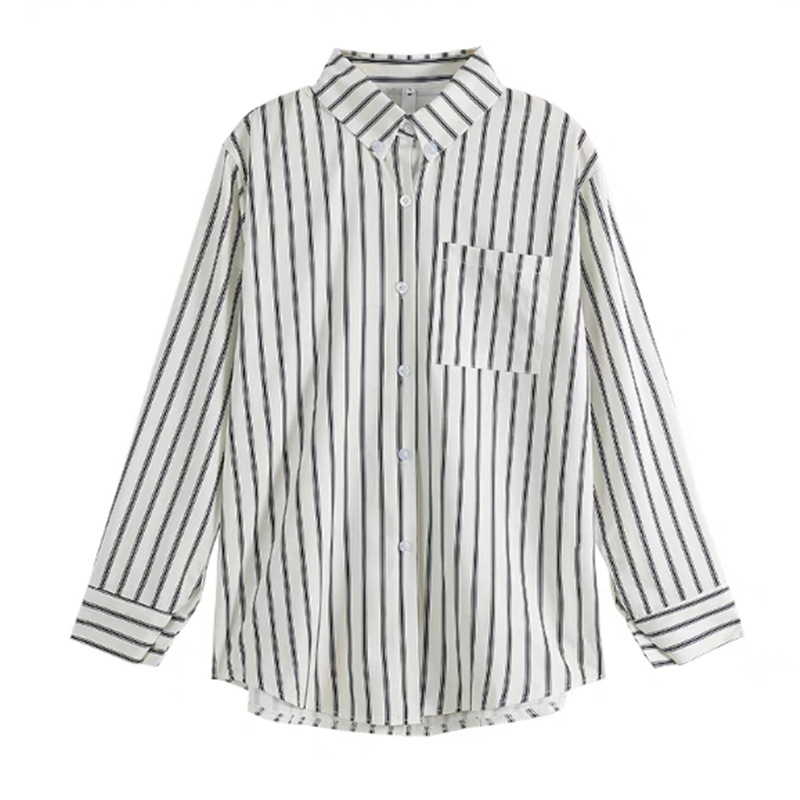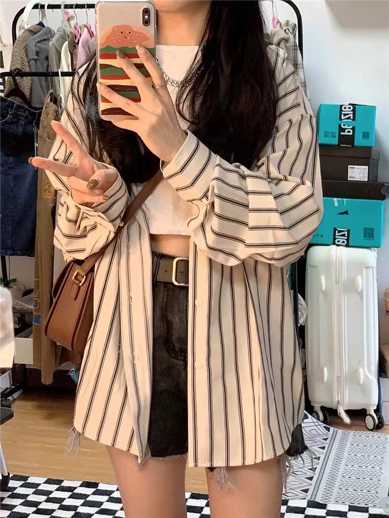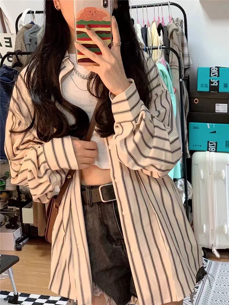 早春【韩系中长款 长袖条纹衬衫外套女】夏季防晒开衫 衬衣薄款外搭上衣