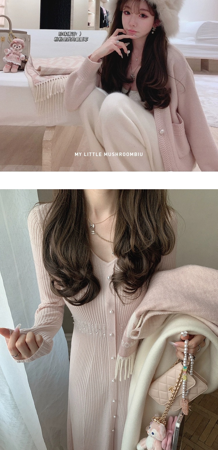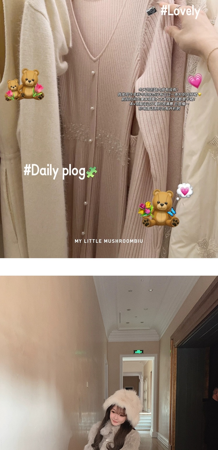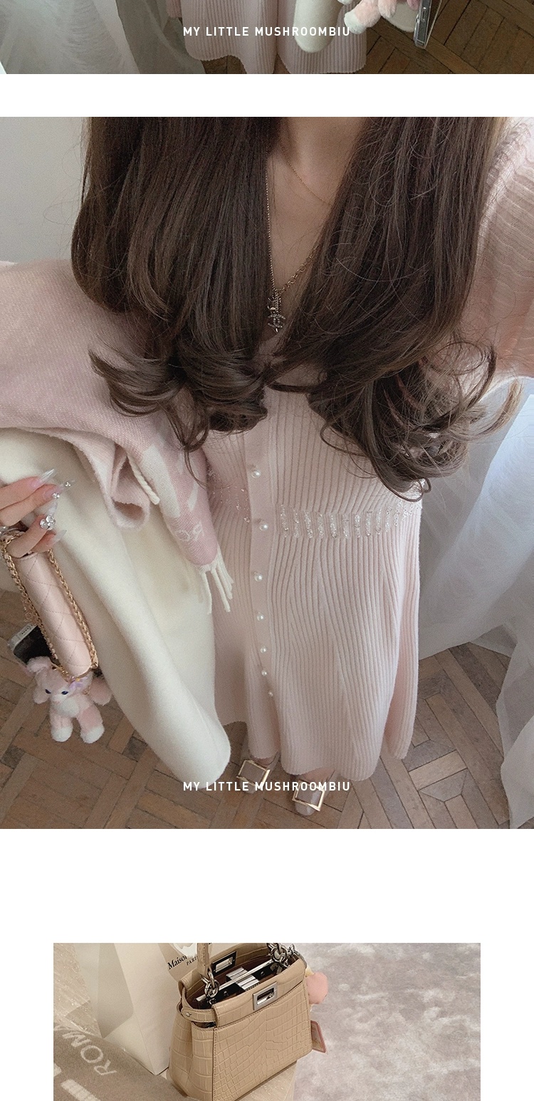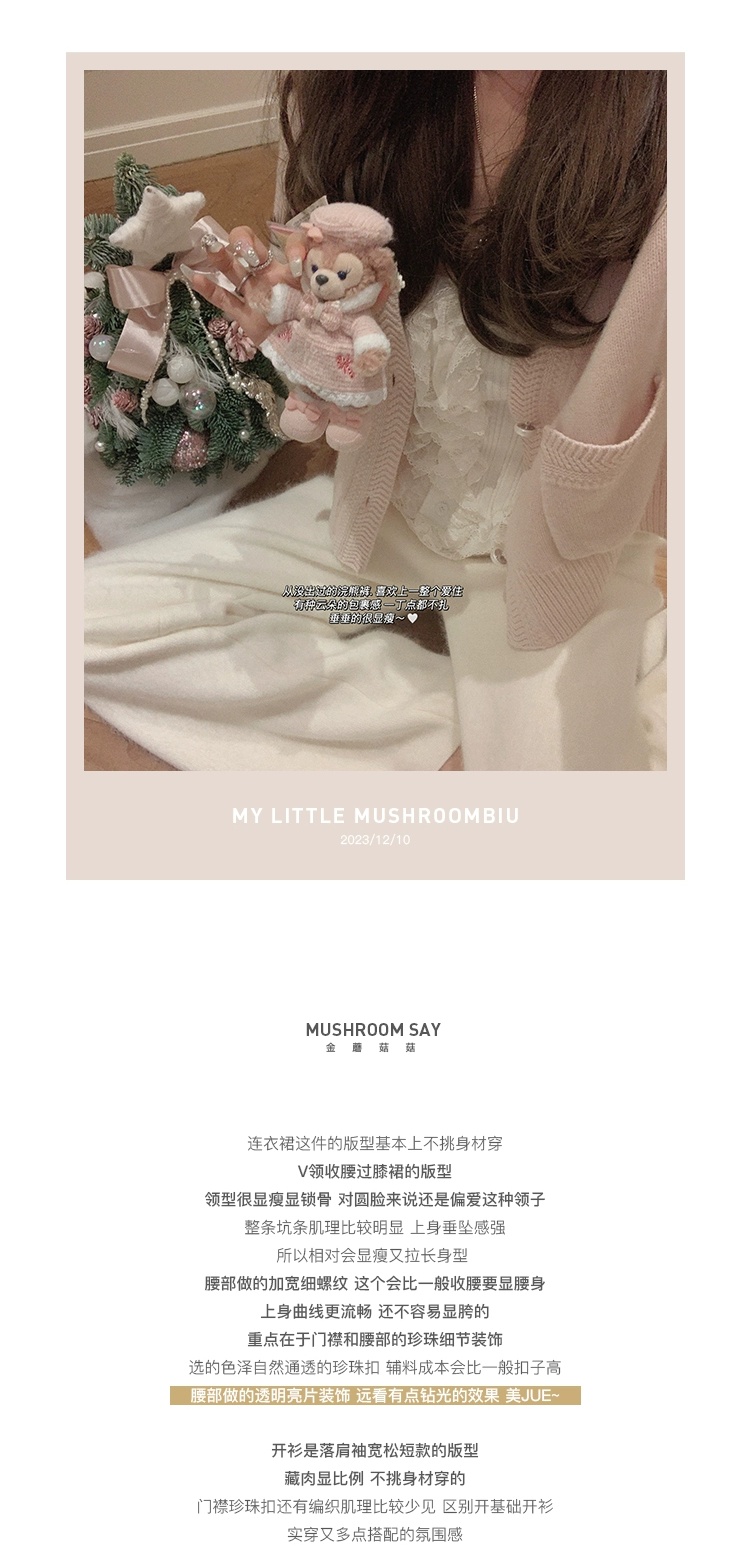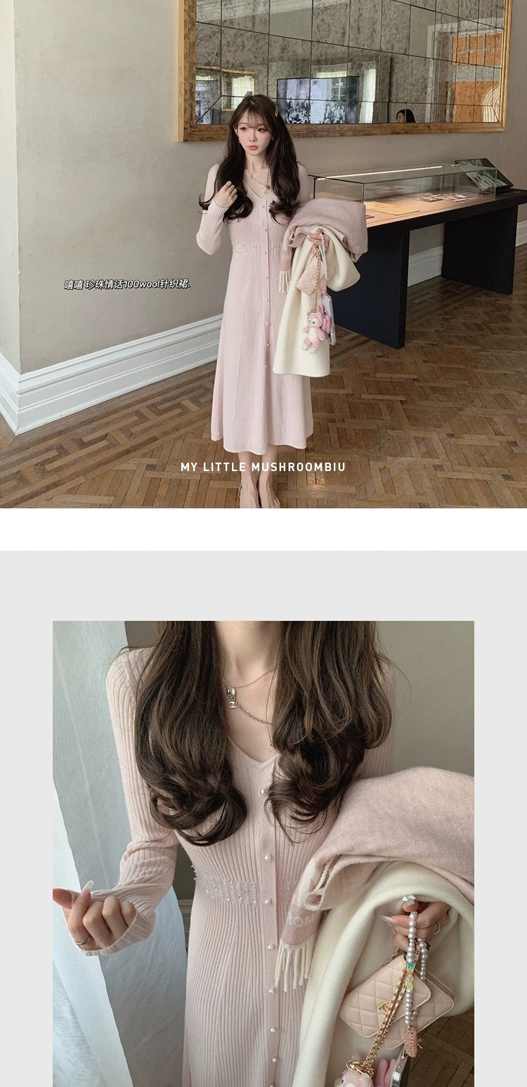 金蘑菇菇 about pearl 珍珠情话 / 100羊毛V领收腰针织内搭连衣裙