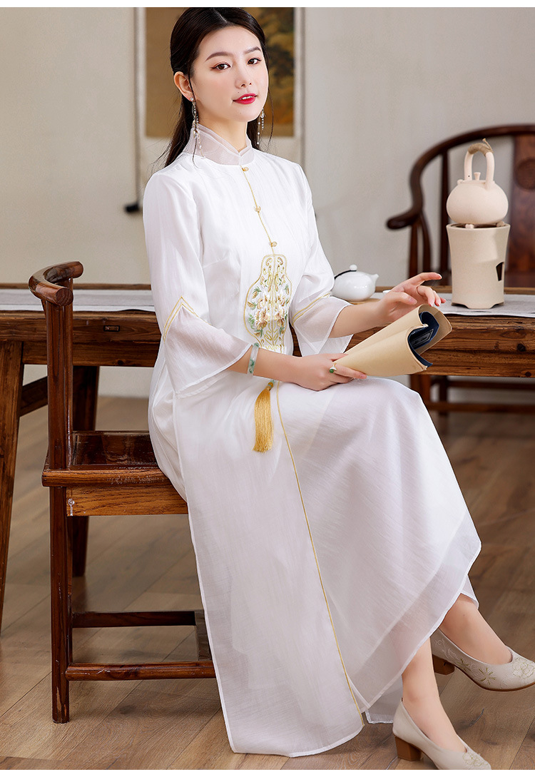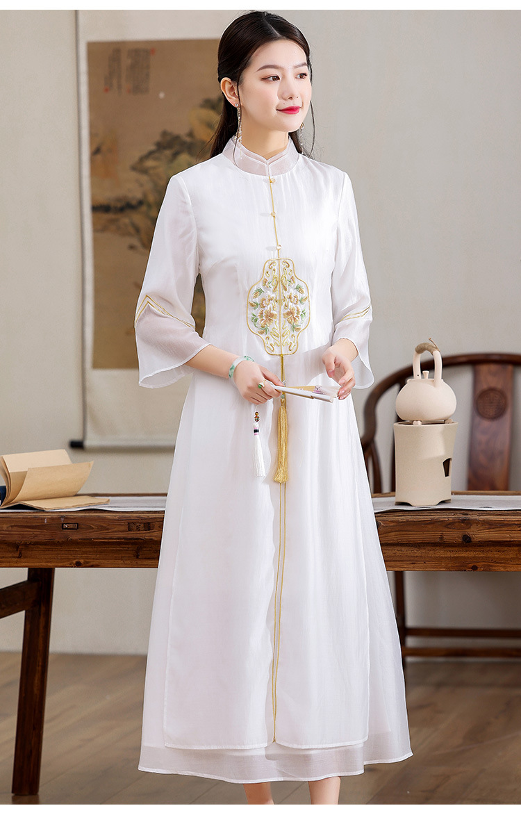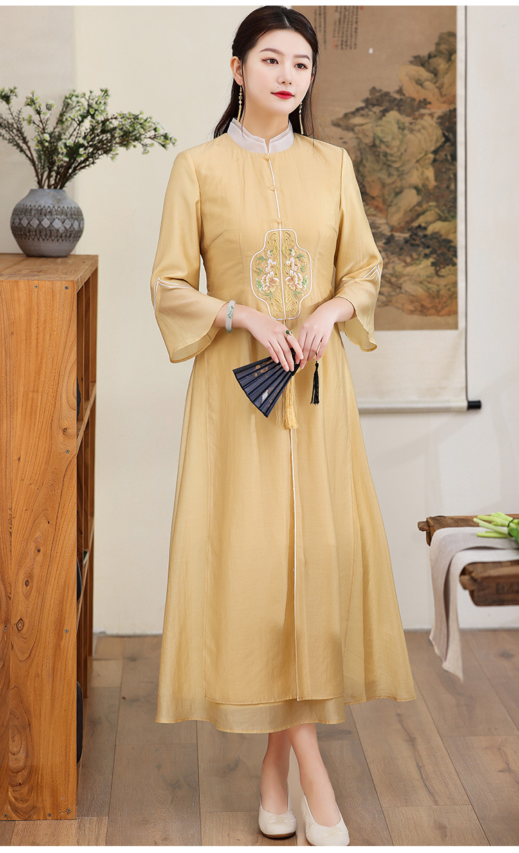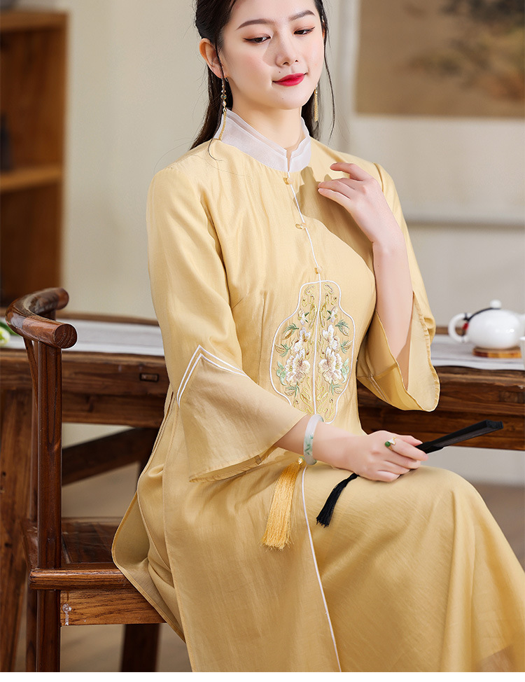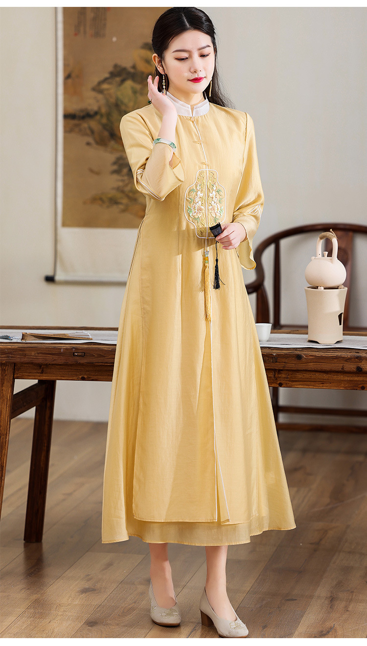 休闲文艺,天丝刺绣禅意茶服中长连衣裙KDS-2255
