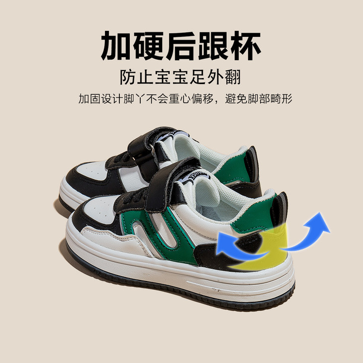 货号:M2238760 颜色:米白黑、米白粉 尺码:24-37 材质:鞋面 超纤;鞋底 橡胶 拼色设计潮流感满分,搭配高帮设计,带点小帅,宝宝穿着好看极了~ 鞋子内里实用柔软透气面料,不仅柔软亲肤,还有吸汗散热的功能!! 穿着宝宝脚丫干干爽爽不会捂脚闷脚,超级舒适呢~ 便捷魔术贴设计,让宝宝轻松穿脱鞋,爱上穿鞋不用为系鞋带而烦恼 超级耐磨的橡胶鞋底搭配防滑纹,不仅让鞋子超级耐穿,还让宝宝在户外玩耍更加安全
