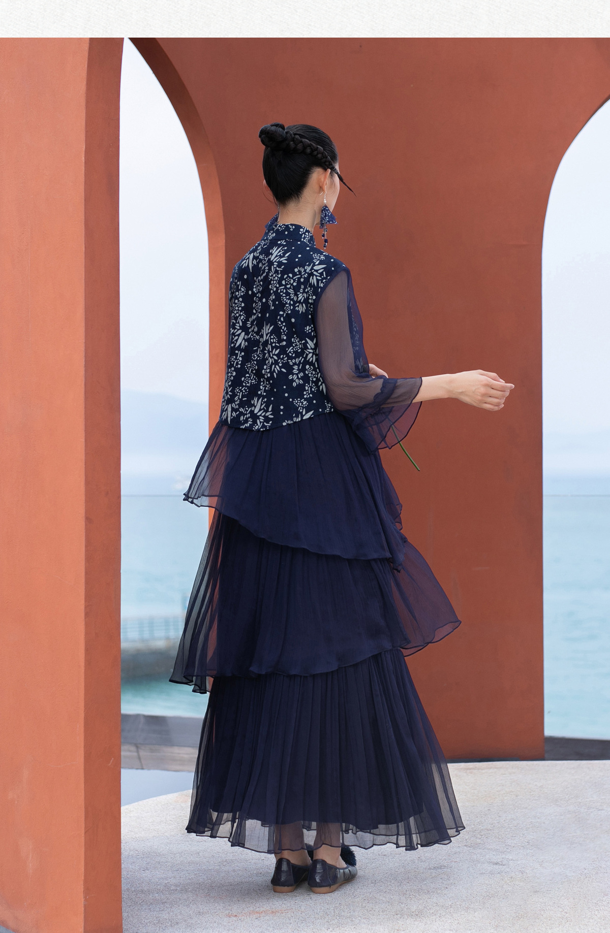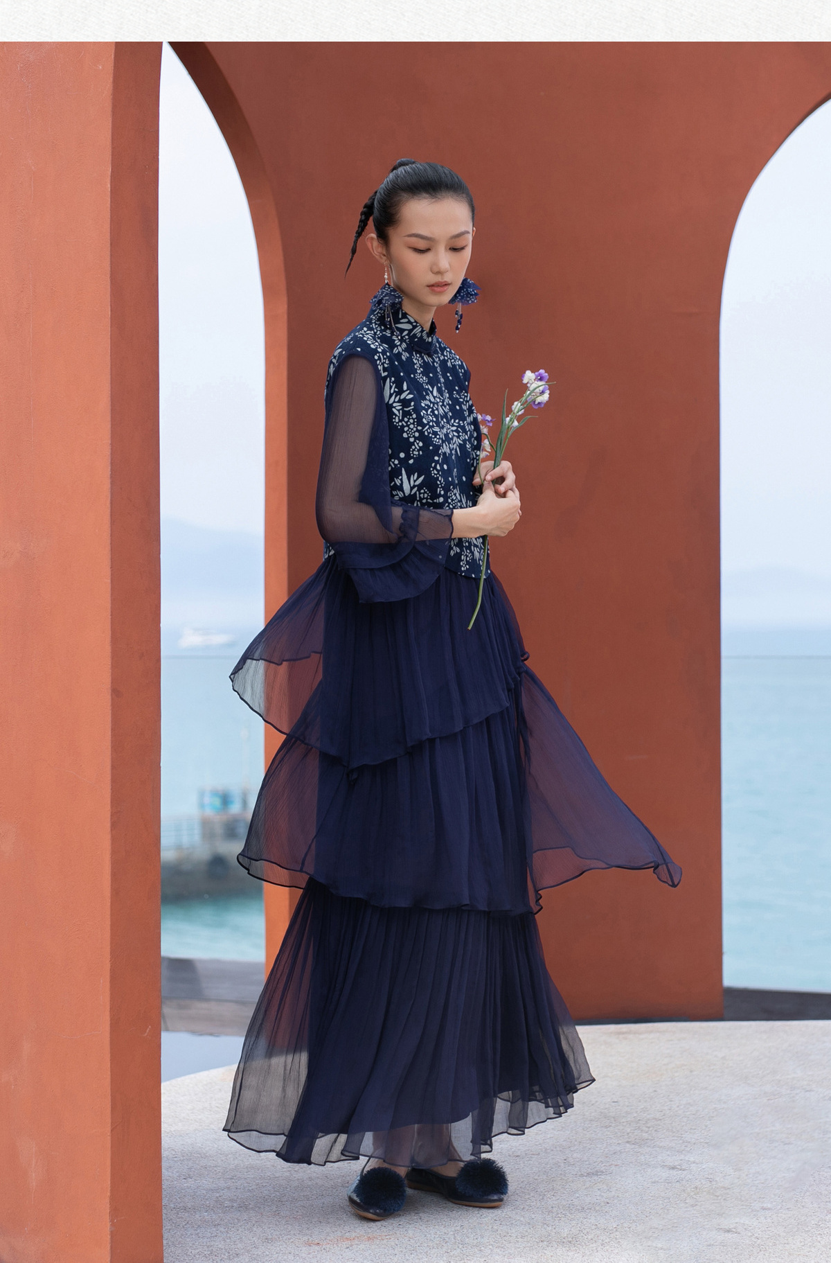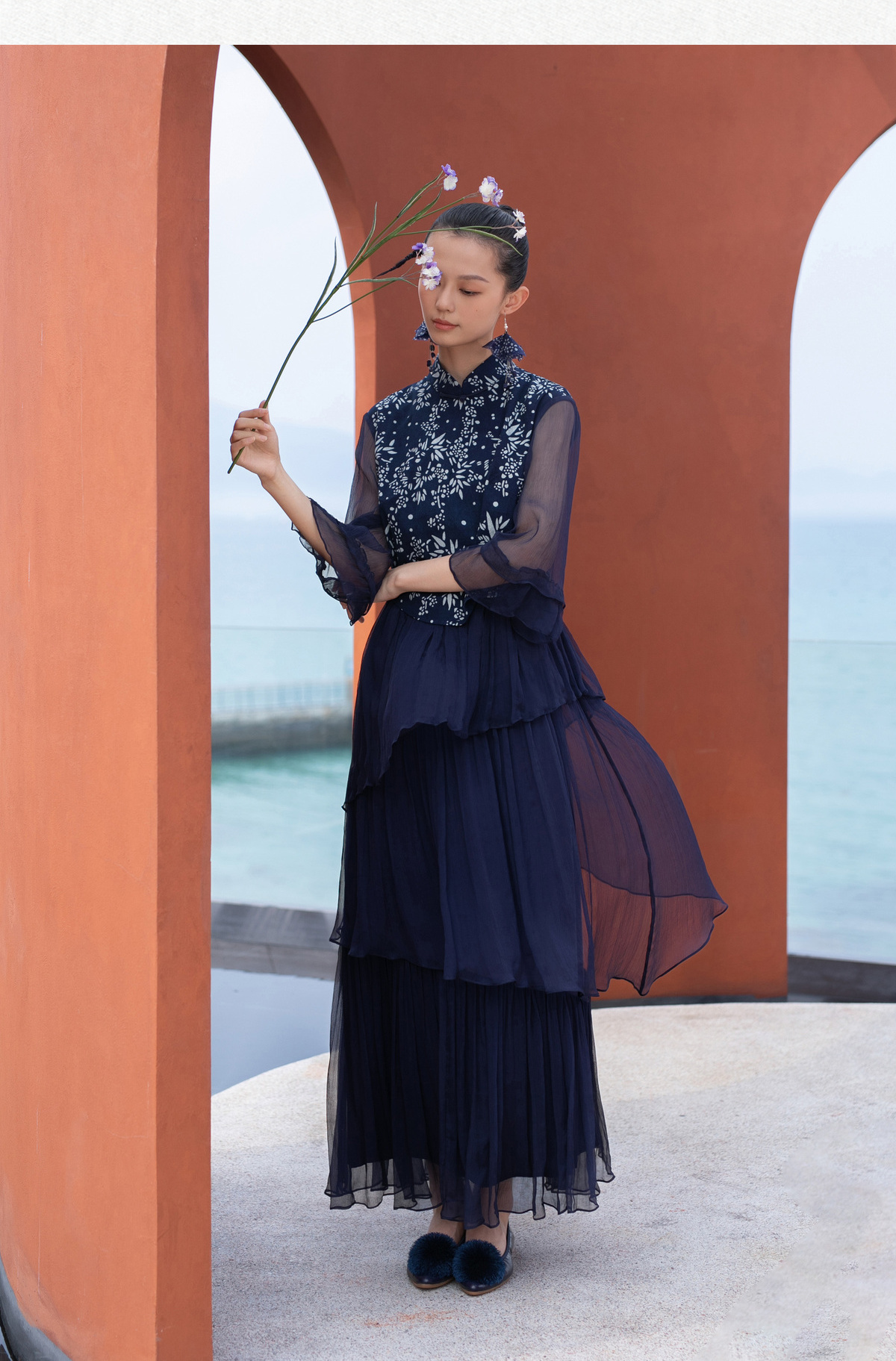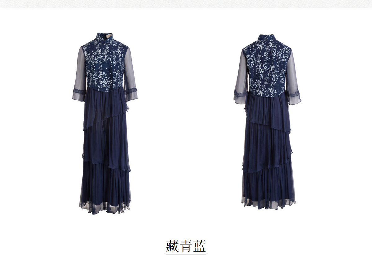 【林栖设计小店】蓝印花系列连衣裙蓝印花布传统拼真丝蛋糕长裙女1942269