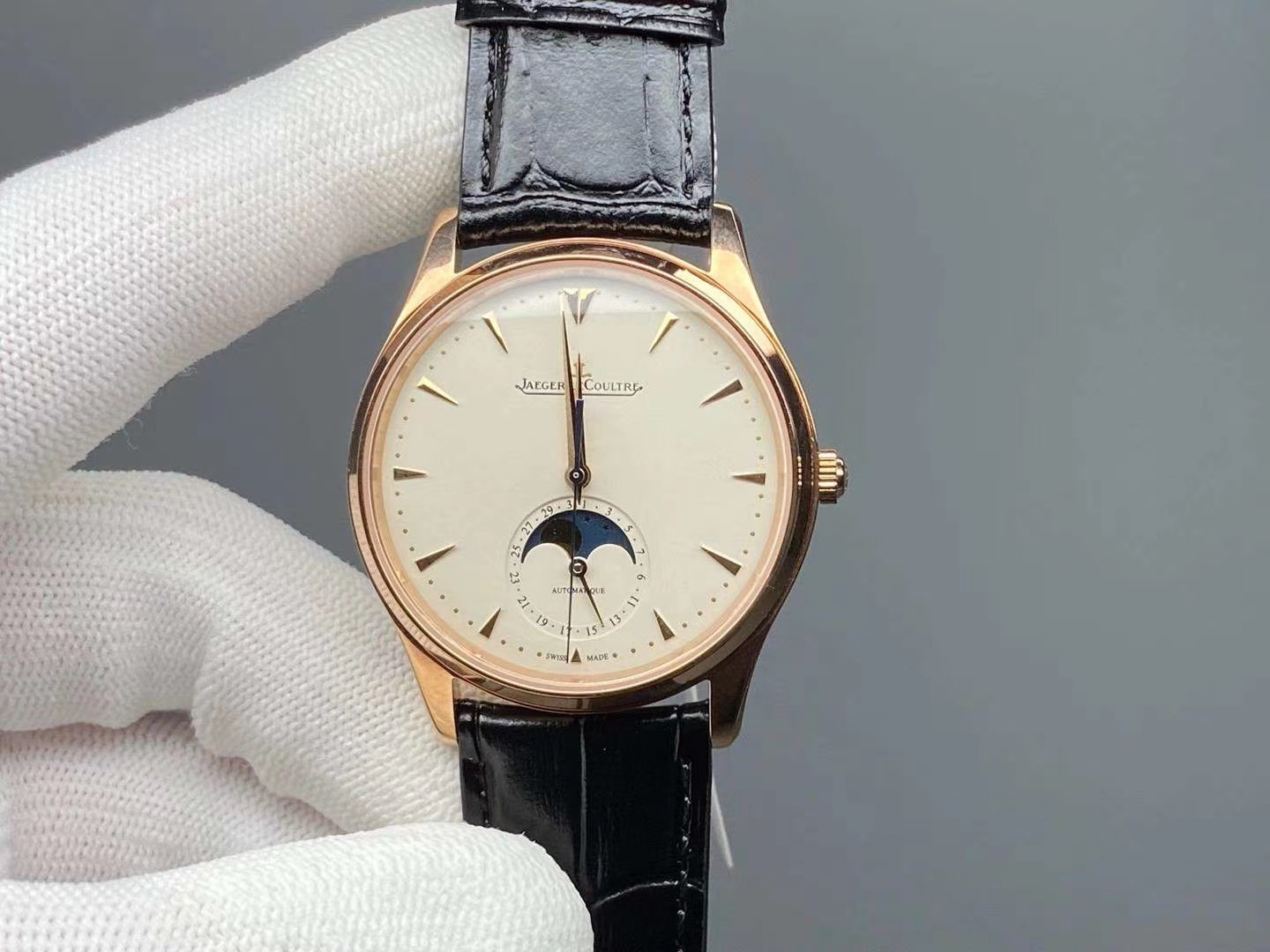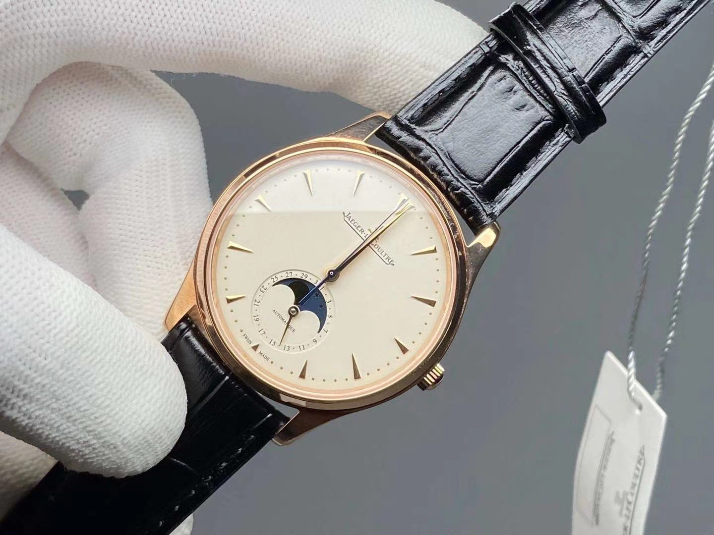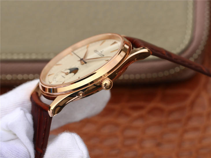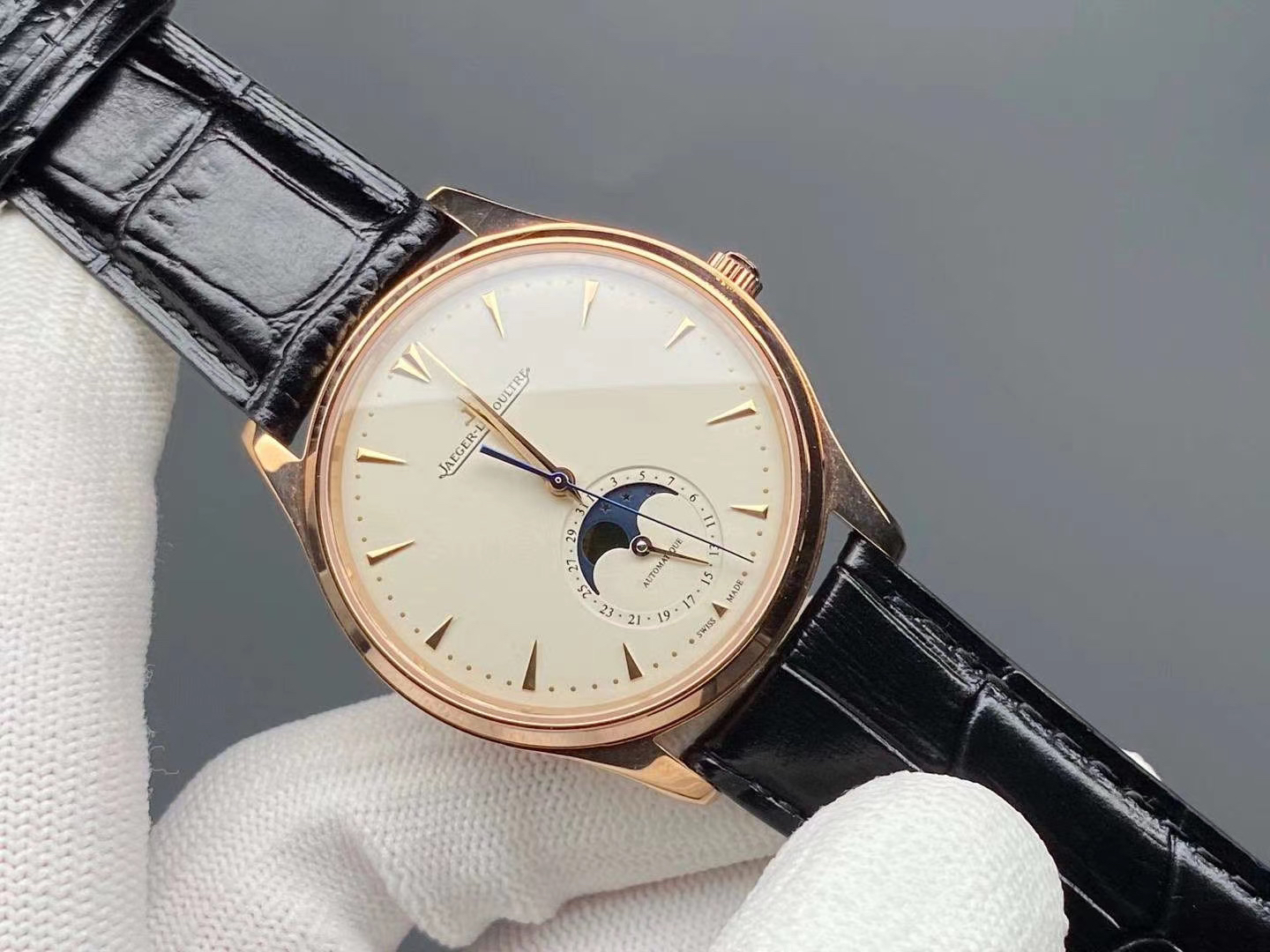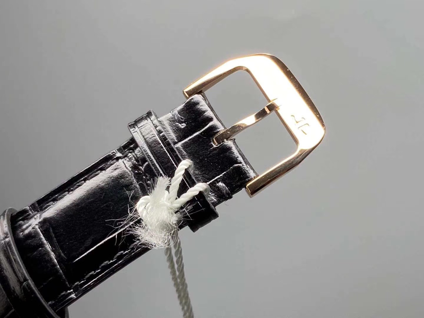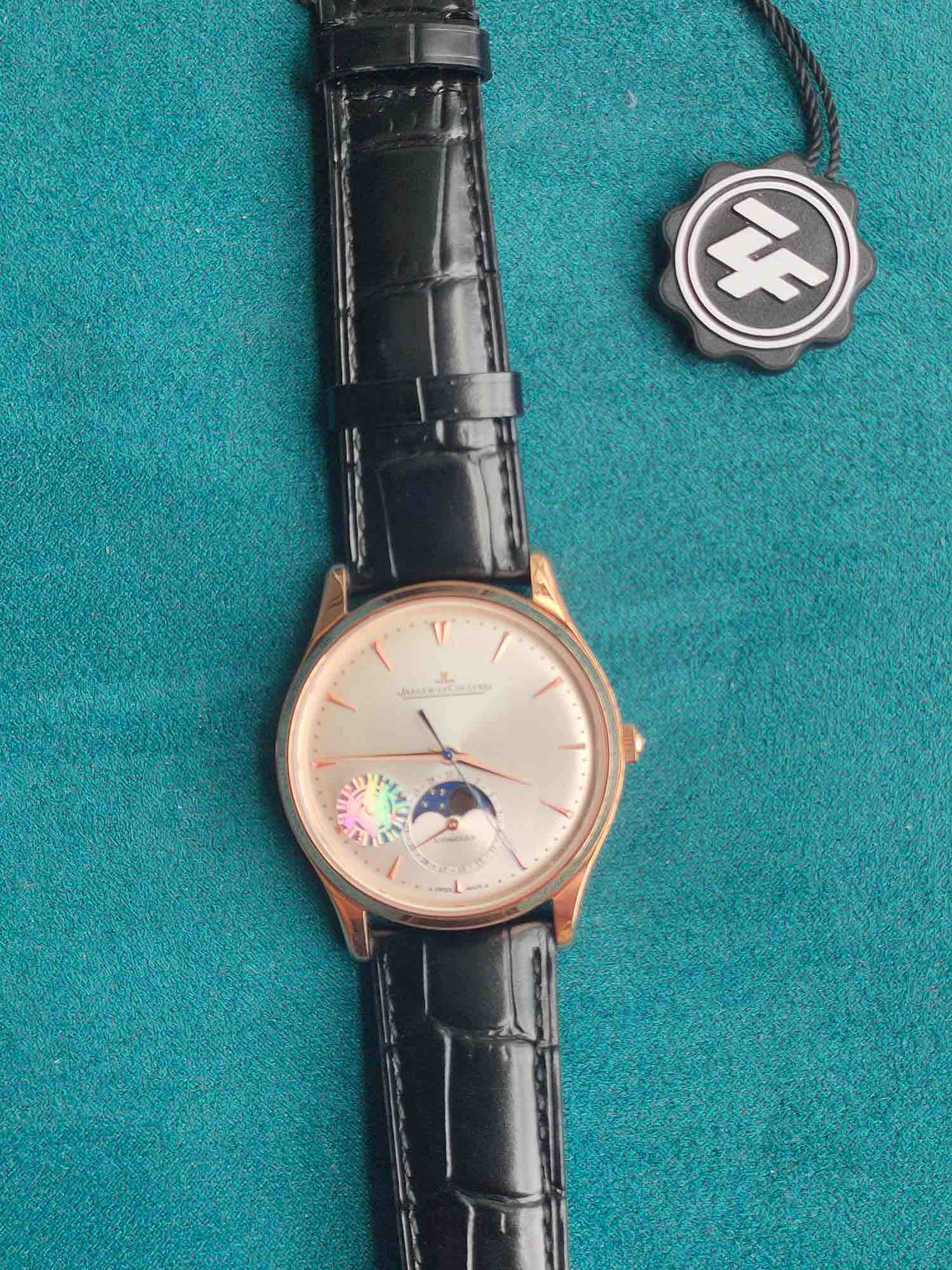 ZF积家月相大师系列,表壳直径39mmX9.9mm与原装同步。六点钟的子盘拥有阳历阴历(月相)双期显示,月相一月转一圈,功能和正品一致。【技术突破】采用9015改积家自产Cal.925/1机芯,功能百分百同步原装自产机芯。走时稳定,素质坚挺。【细节突破】从侧面观察腕表盘面发现有微微的弧度,ZF为了达到这一效果,耗时费力多次调整模具,确保神韵和感觉能与原装相媲美。ZF积家月相大师
