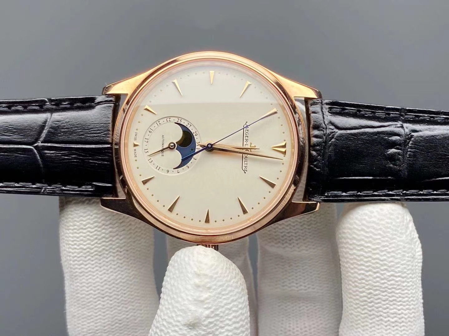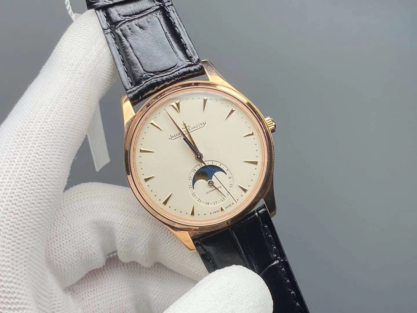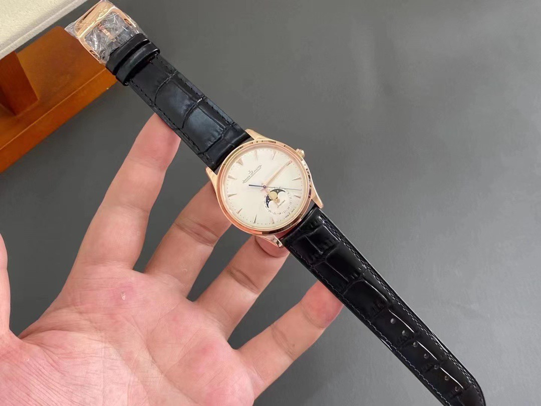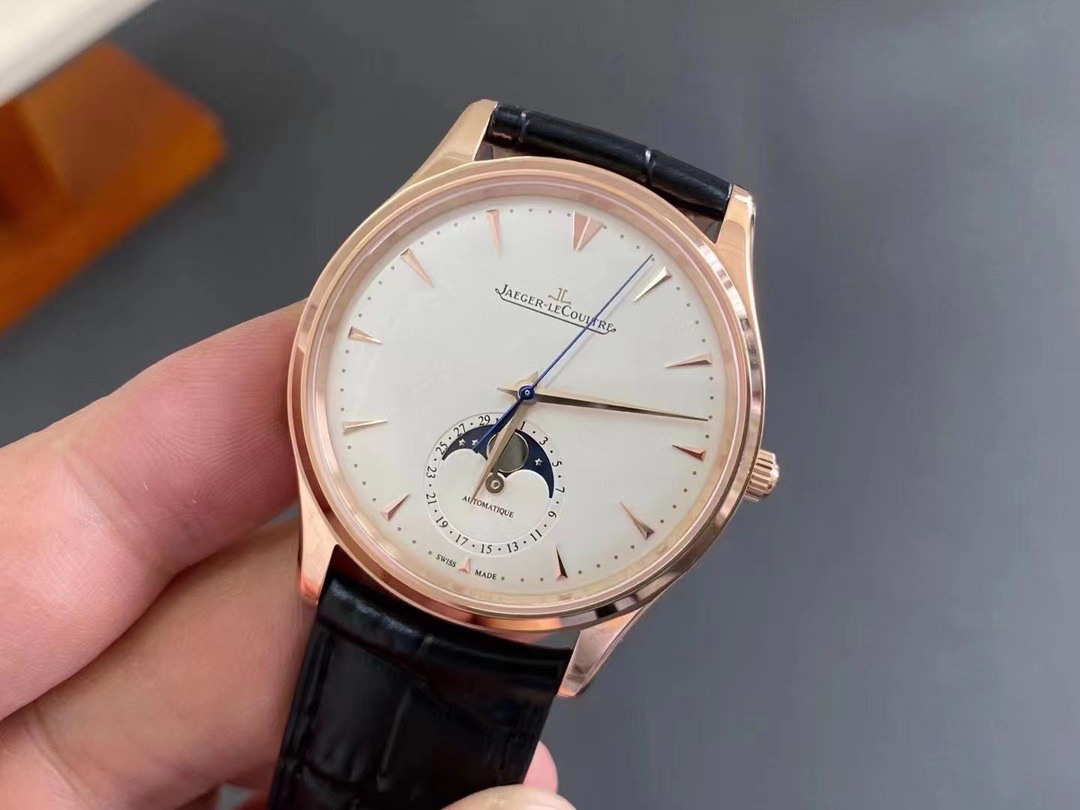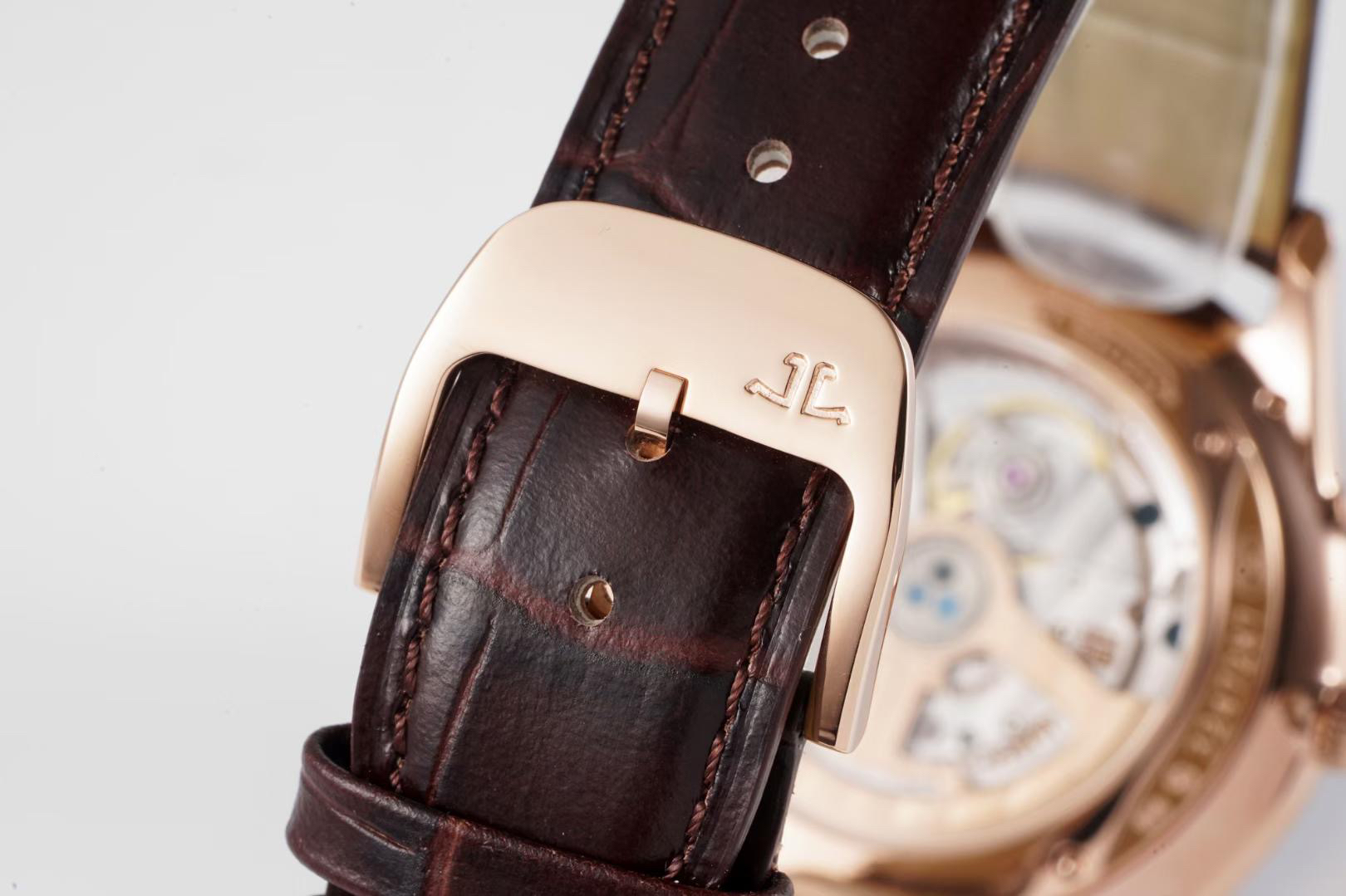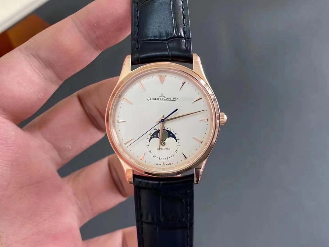 ZF积家月相大师系列,表壳直径39mmX9.9mm与原装同步。六点钟的子盘拥有阳历阴历(月相)双期显示,月相一月转一圈,功能和正品一致。【技术突破】采用9015改积家自产Cal.925/1机芯,功能百分百同步原装自产机芯。走时稳定,素质坚挺。【细节突破】从侧面观察腕表盘面发现有微微的弧度,ZF为了达到这一效果,耗时费力多次调整模具,确保神韵和感觉能与原装相媲美。ZF积家月相大师