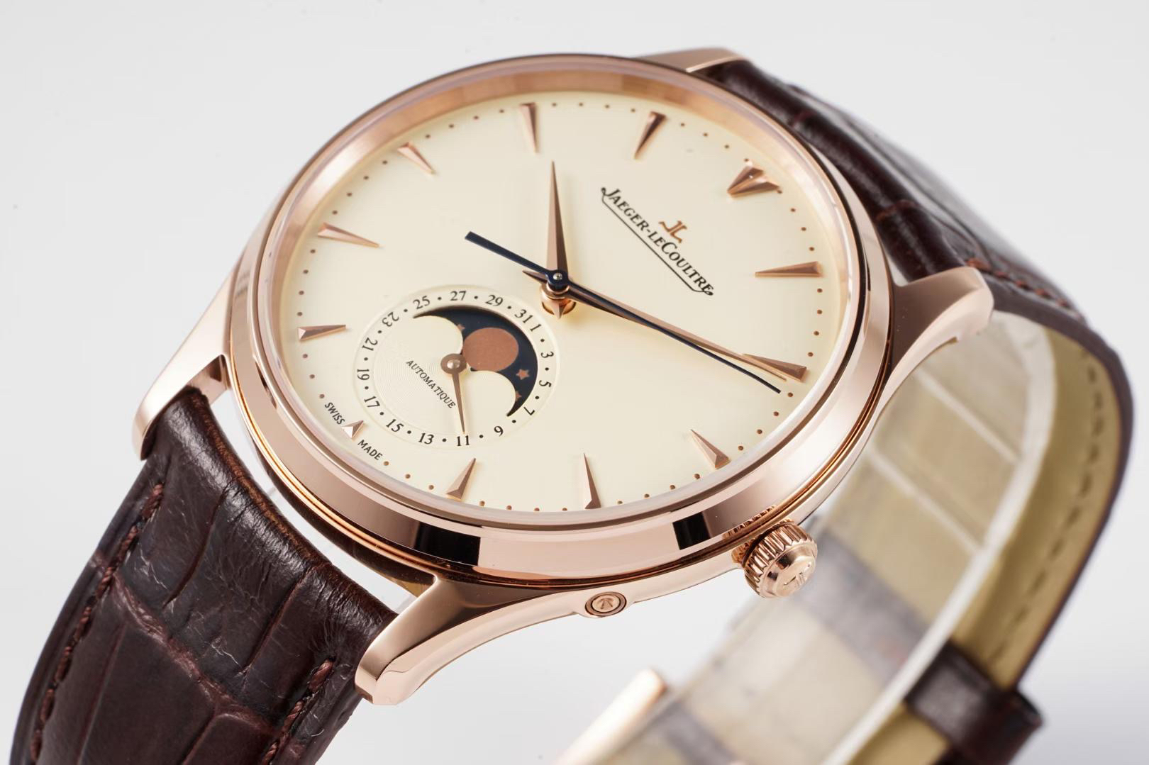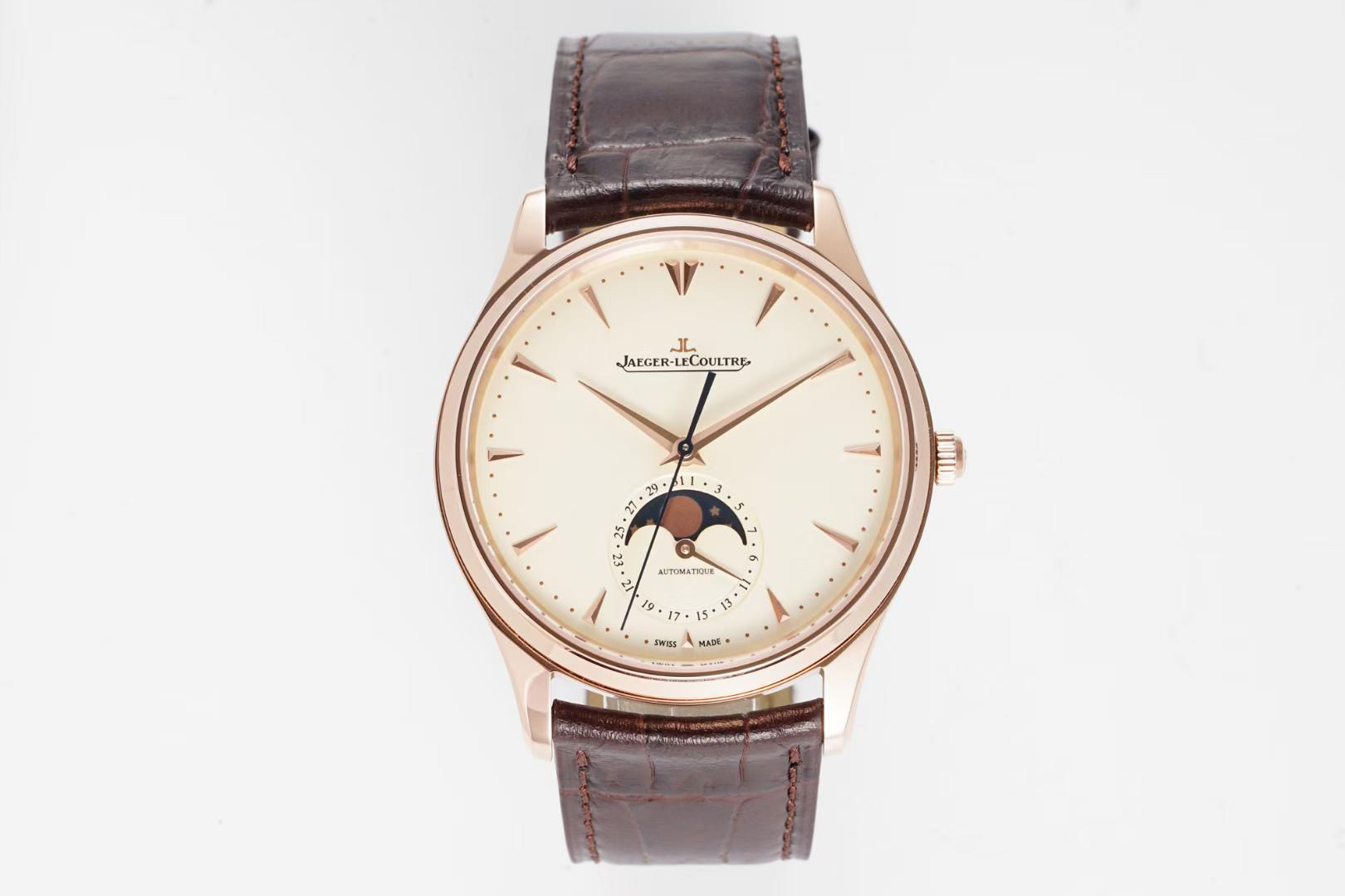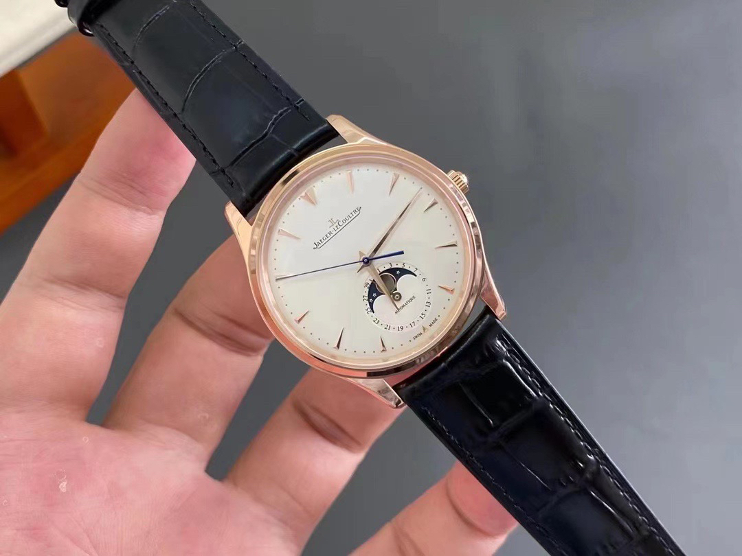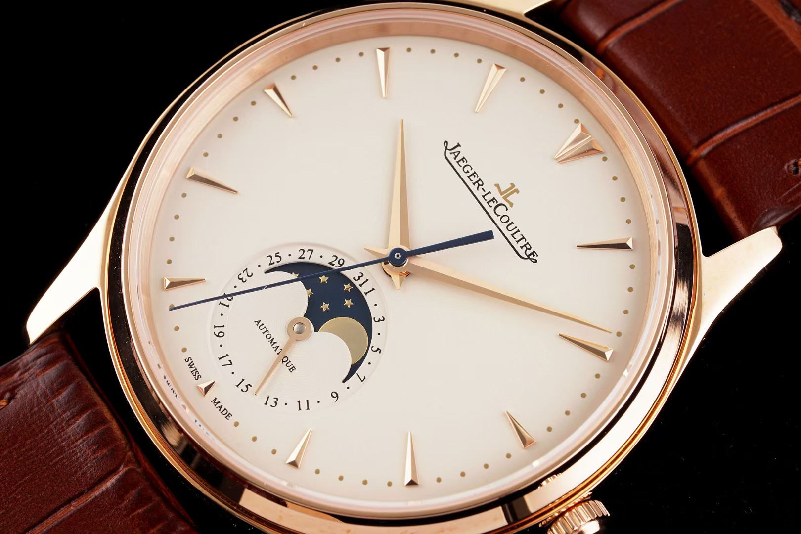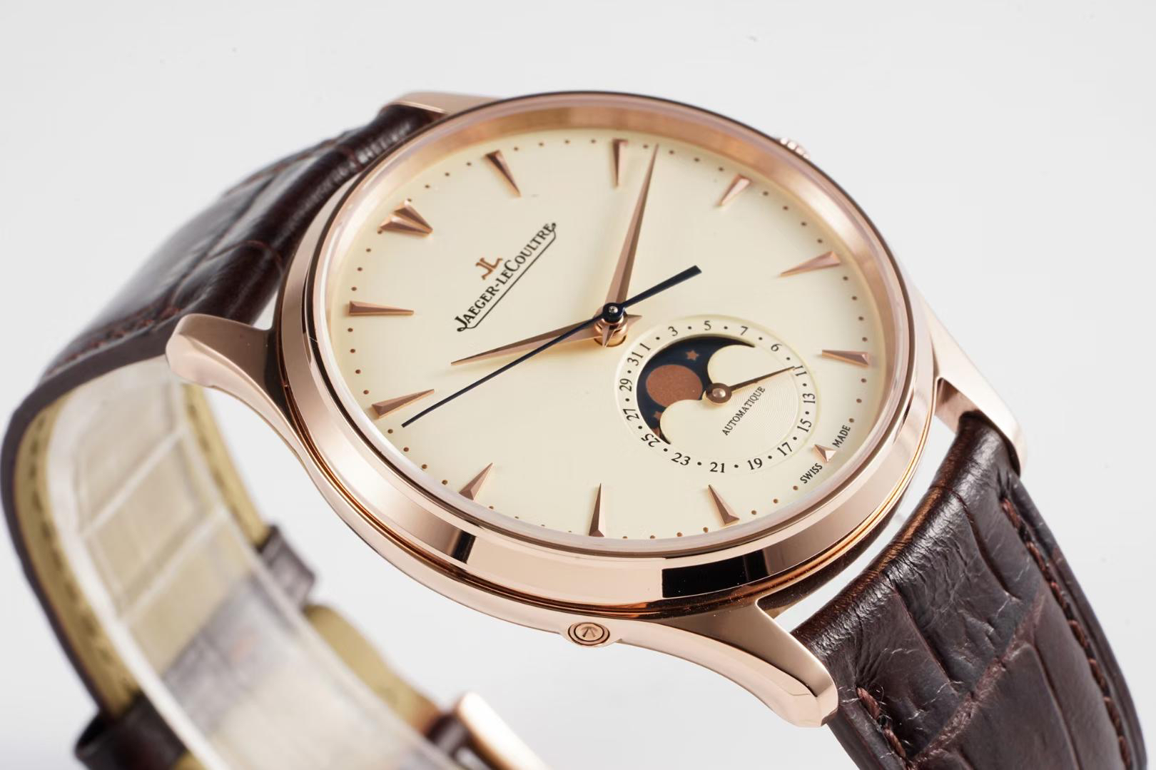 ZF积家月相大师系列,表壳直径39mmX9.9mm与原装同步。六点钟的子盘拥有阳历阴历(月相)双期显示,月相一月转一圈,功能和正品一致。【技术突破】采用9015改积家自产Cal.925/1机芯,功能百分百同步原装自产机芯。走时稳定,素质坚挺。【细节突破】从侧面观察腕表盘面发现有微微的弧度,ZF为了达到这一效果,耗时费力多次调整模具,确保神韵和感觉能与原装相媲美。ZF积家月相大师