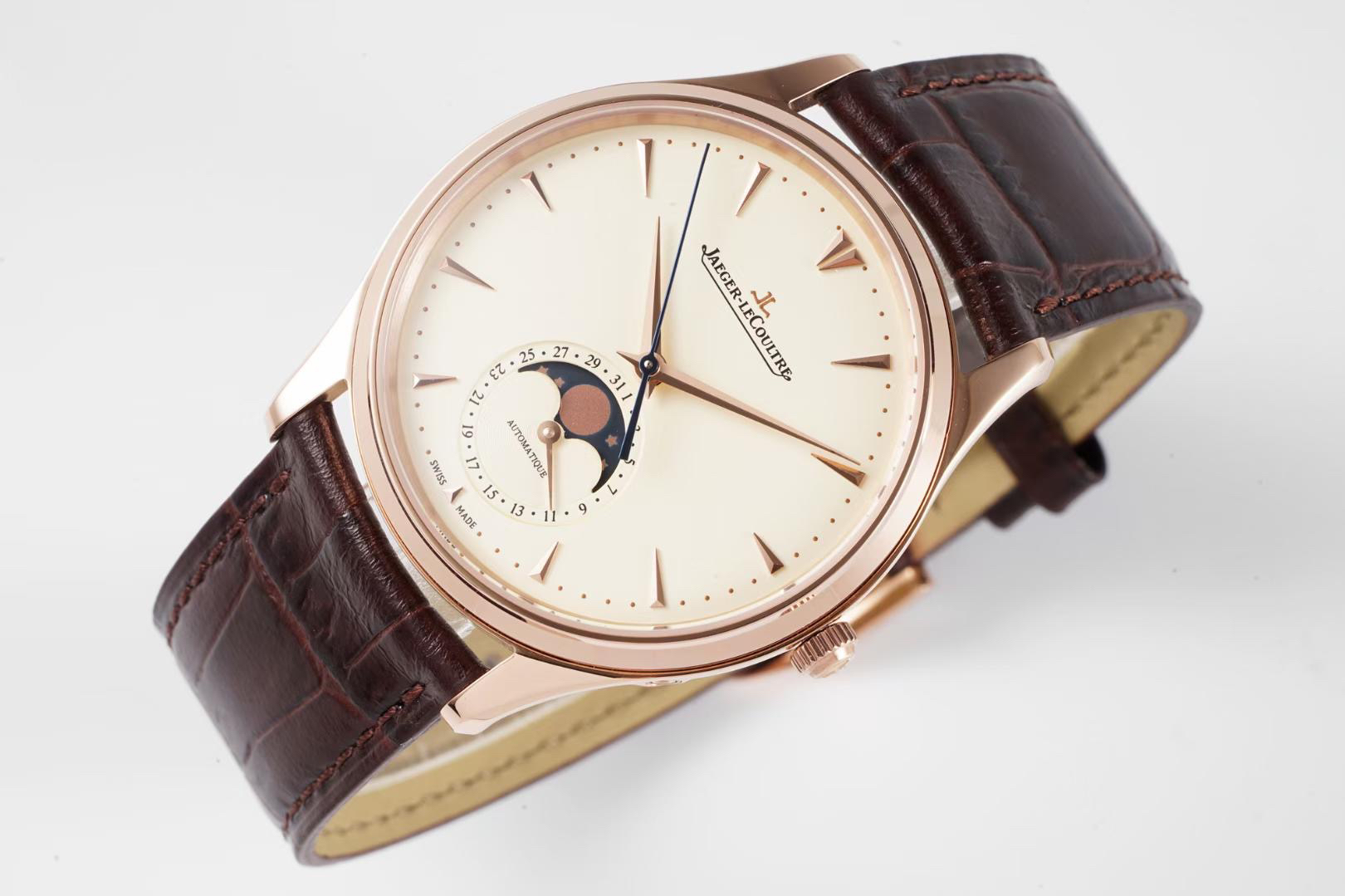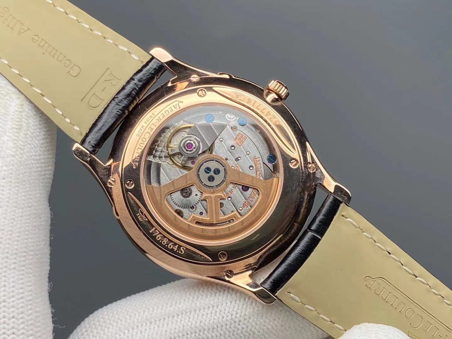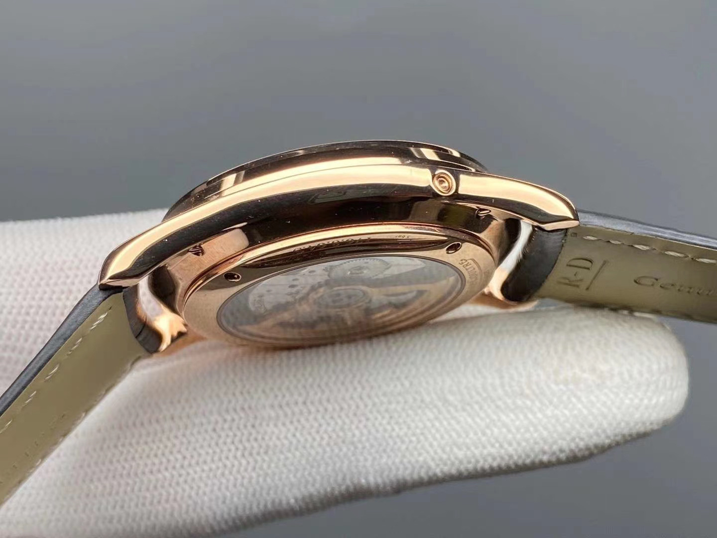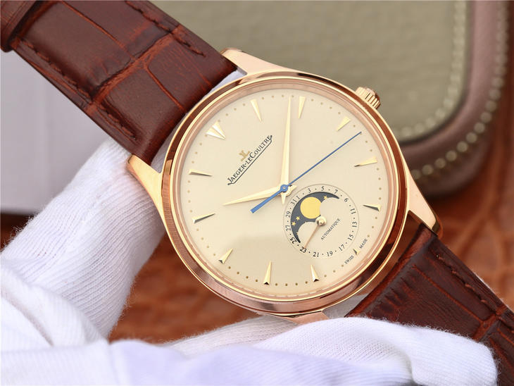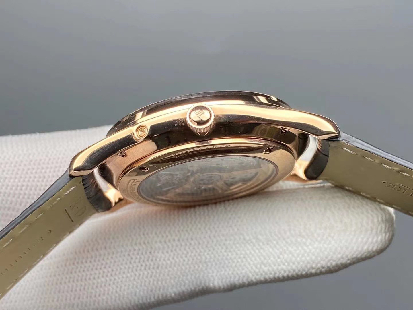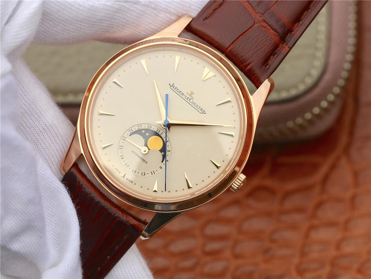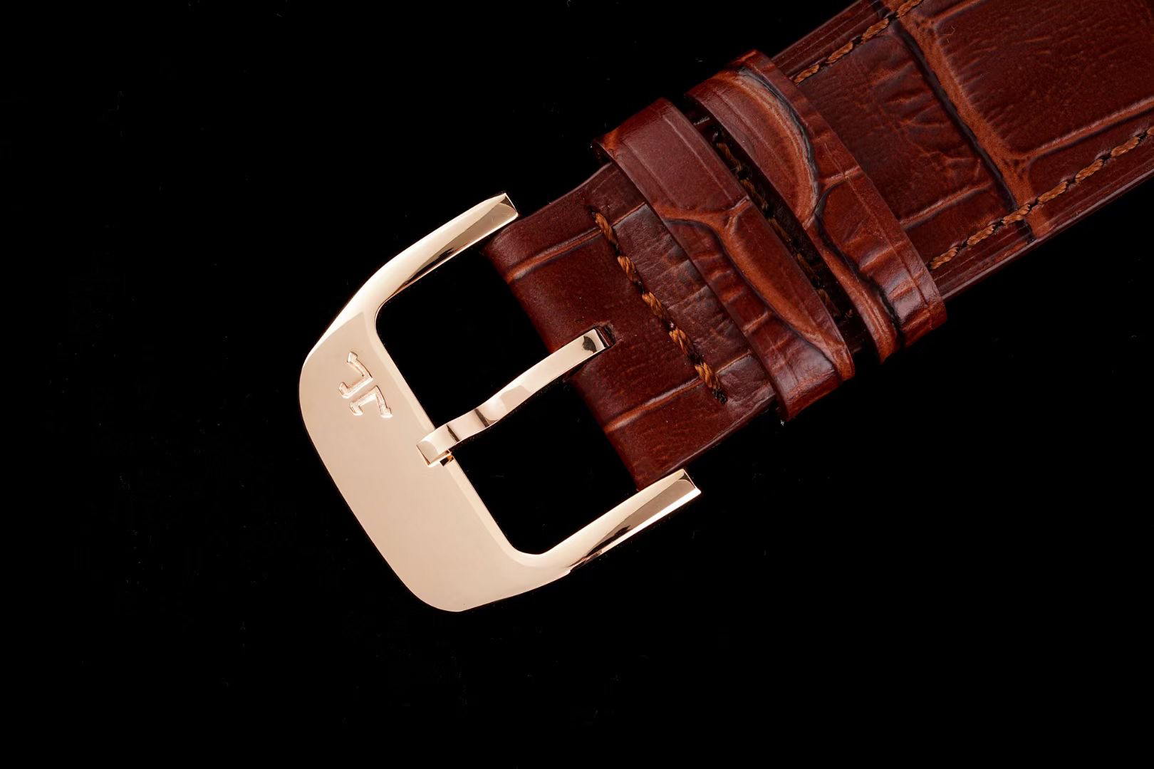 ZF积家月相大师系列,表壳直径39mmX9.9mm与原装同步。六点钟的子盘拥有阳历阴历(月相)双期显示,月相一月转一圈,功能和正品一致。【技术突破】采用9015改积家自产Cal.925/1机芯,功能百分百同步原装自产机芯。走时稳定,素质坚挺。【细节突破】从侧面观察腕表盘面发现有微微的弧度,ZF为了达到这一效果,耗时费力多次调整模具,确保神韵和感觉能与原装相媲美。ZF积家月相大师