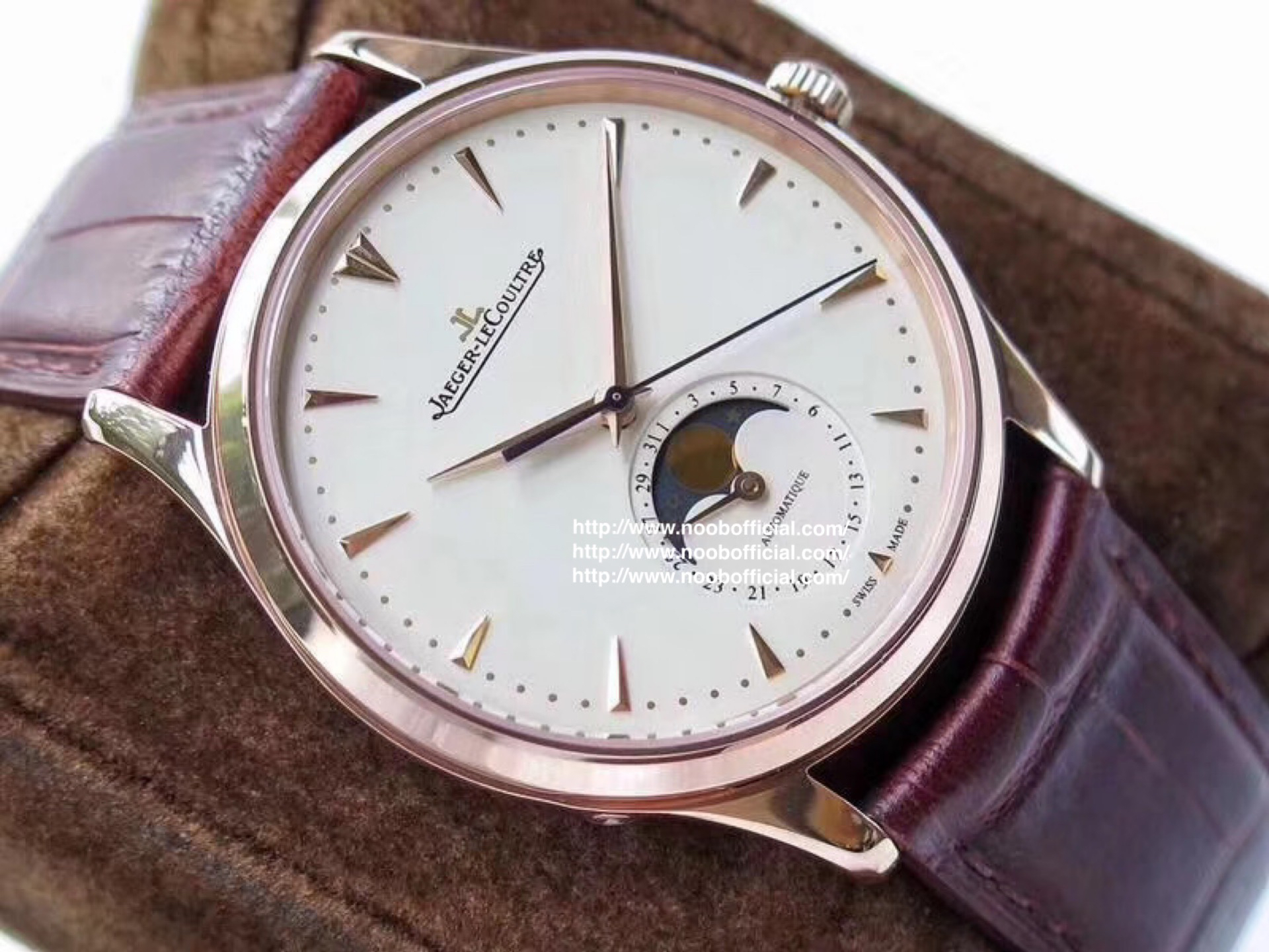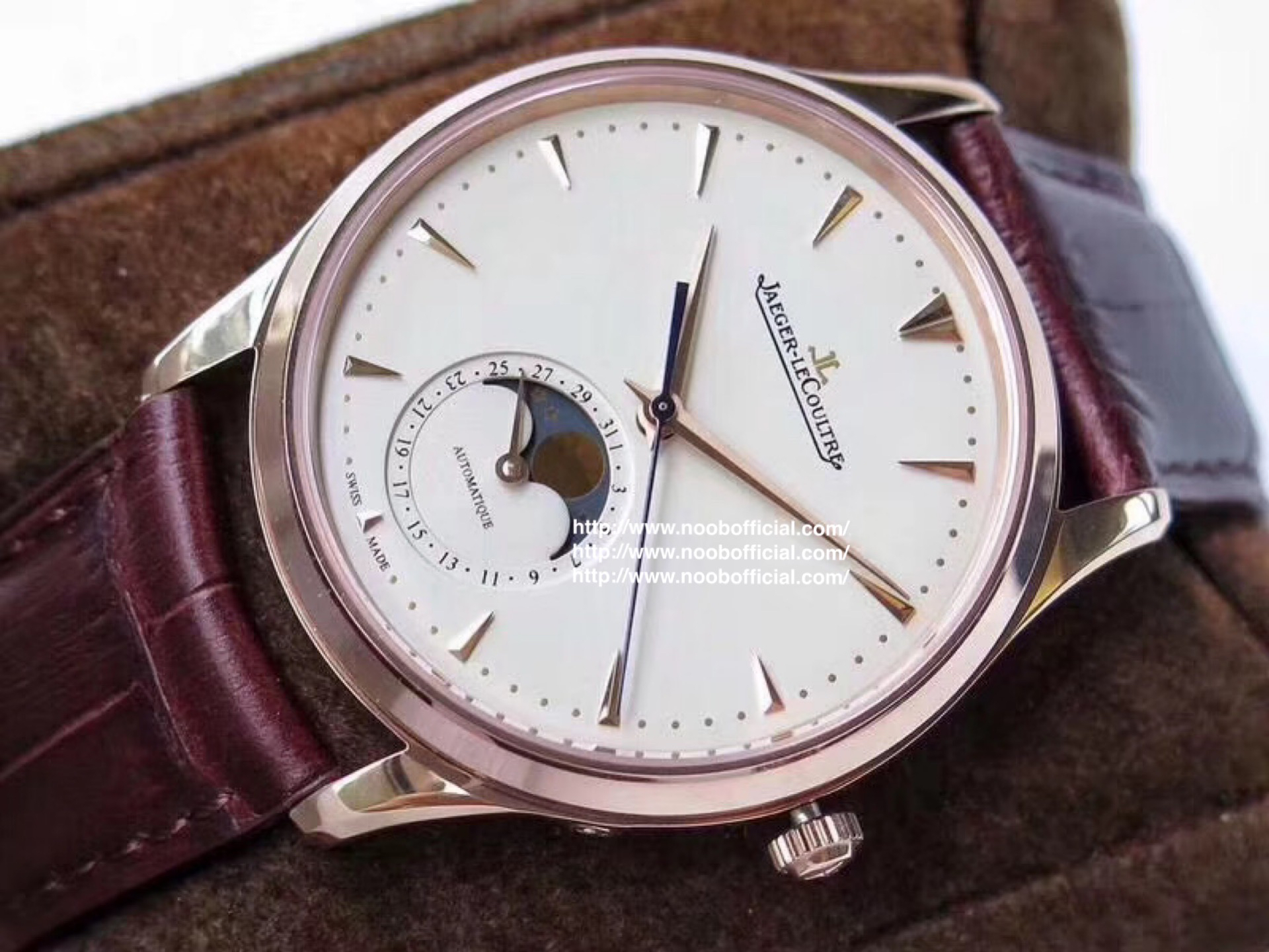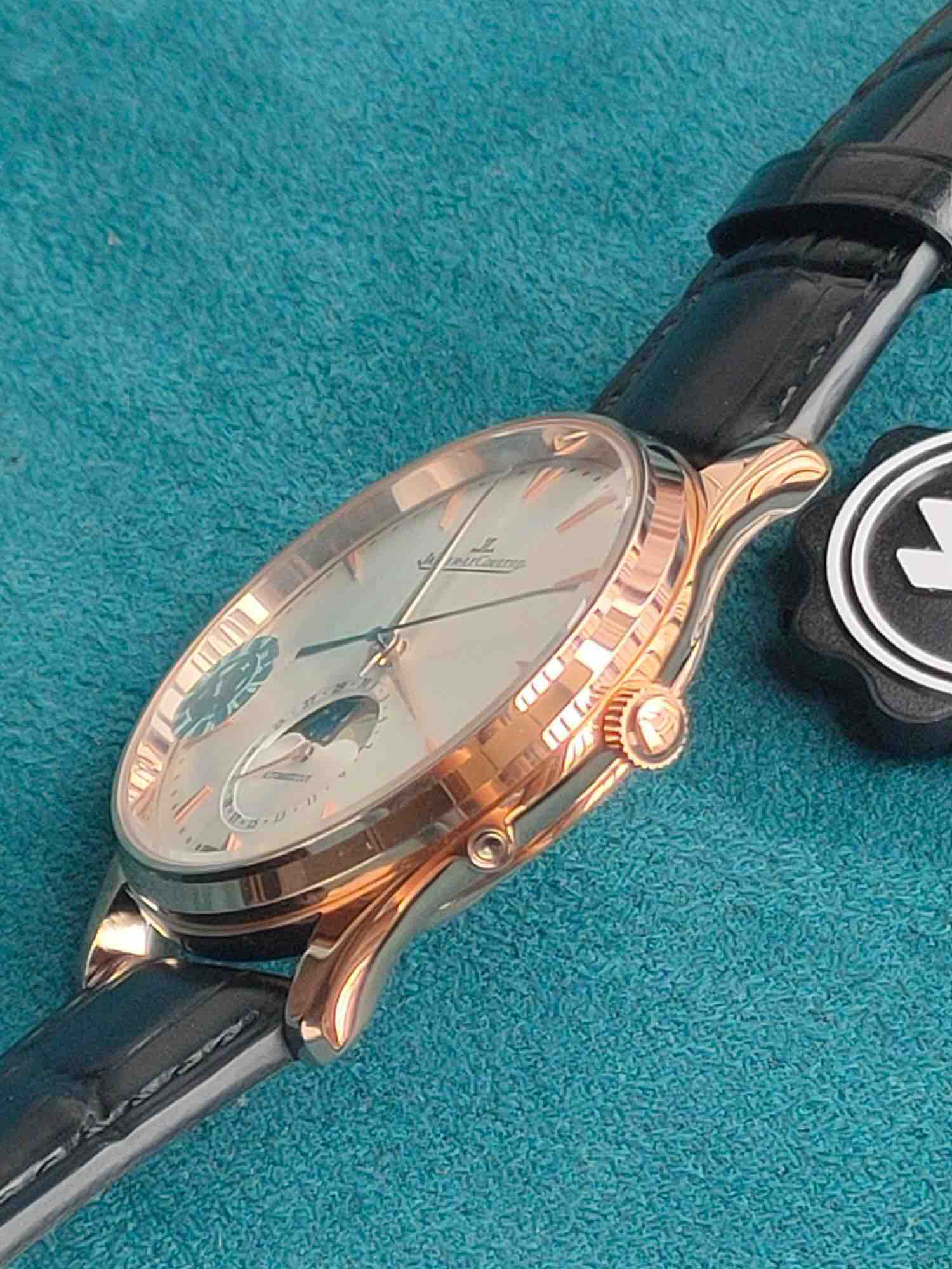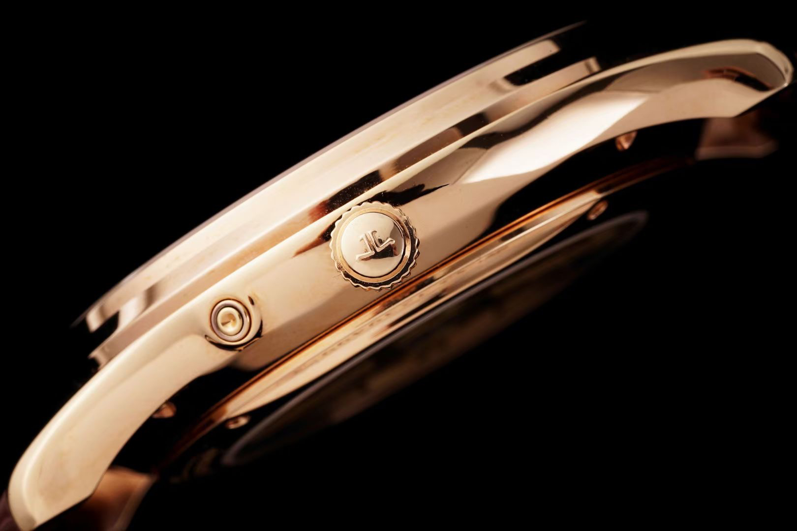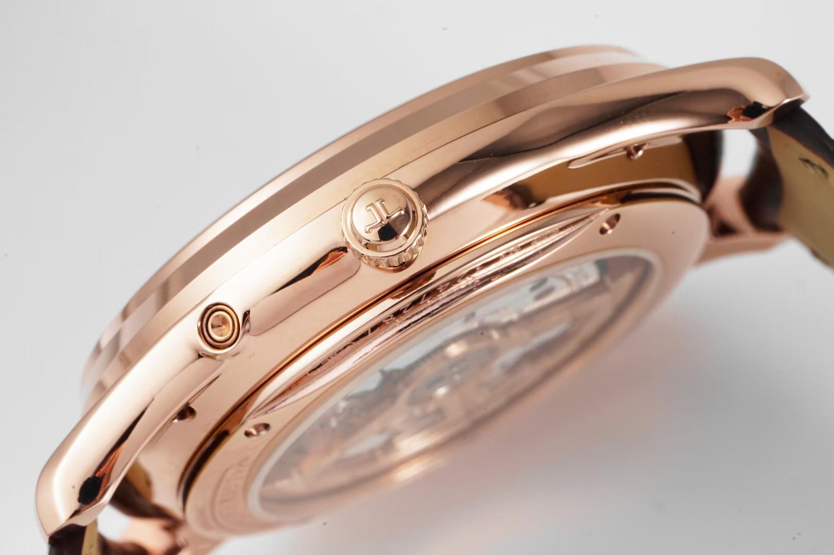 ZF积家月相大师系列,表壳直径39mmX9.9mm与原装同步。六点钟的子盘拥有阳历阴历(月相)双期显示,月相一月转一圈,功能和正品一致。【技术突破】采用9015改积家自产Cal.925/1机芯,功能百分百同步原装自产机芯。走时稳定,素质坚挺。【细节突破】从侧面观察腕表盘面发现有微微的弧度,ZF为了达到这一效果,耗时费力多次调整模具,确保神韵和感觉能与原装相媲美。ZF积家月相大师