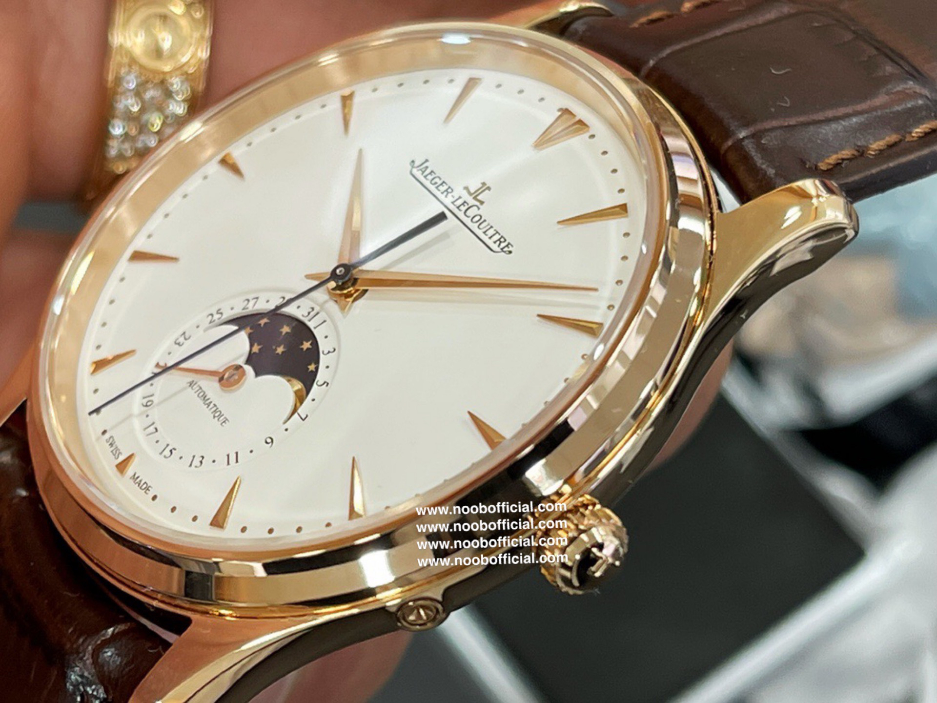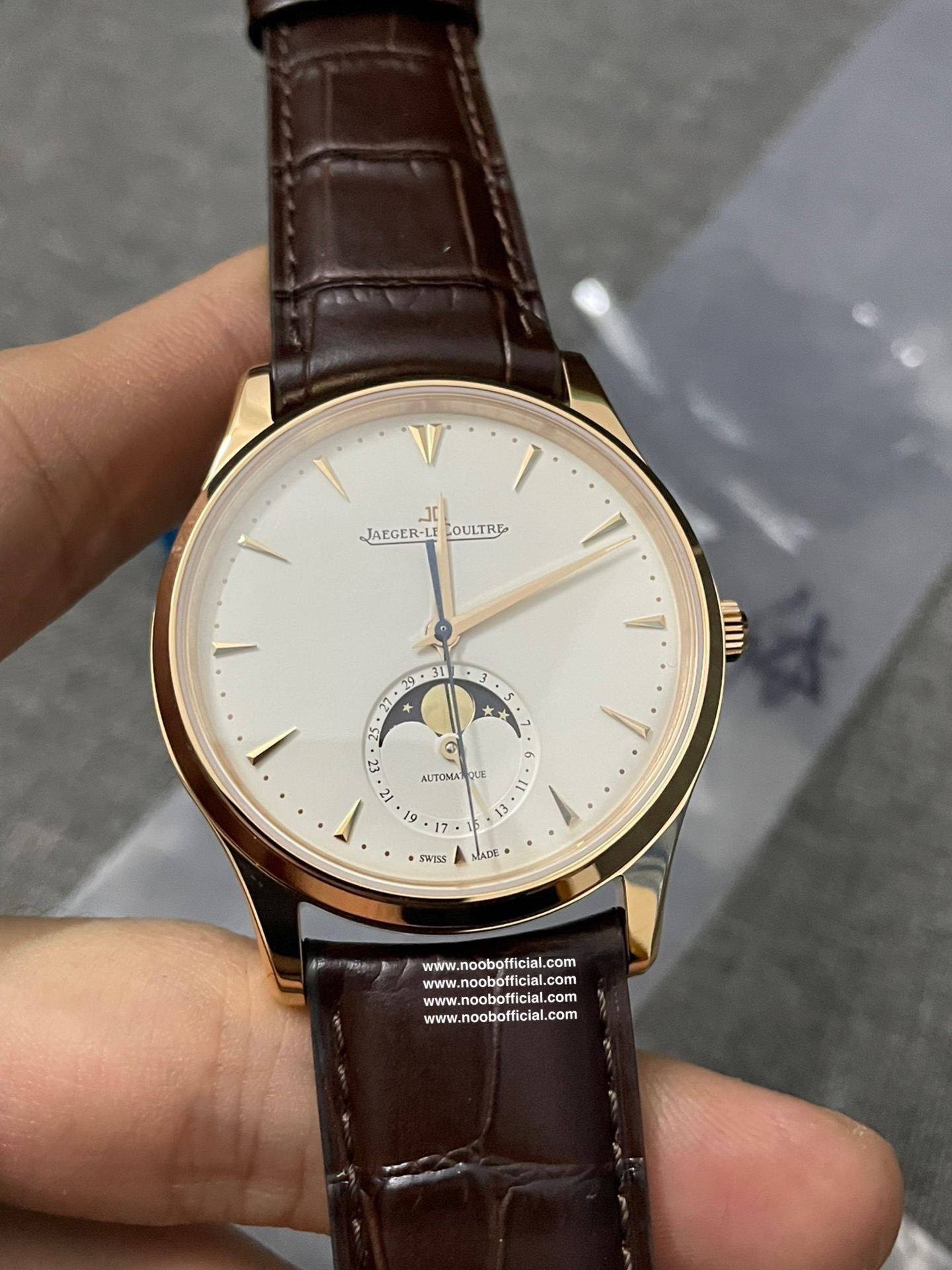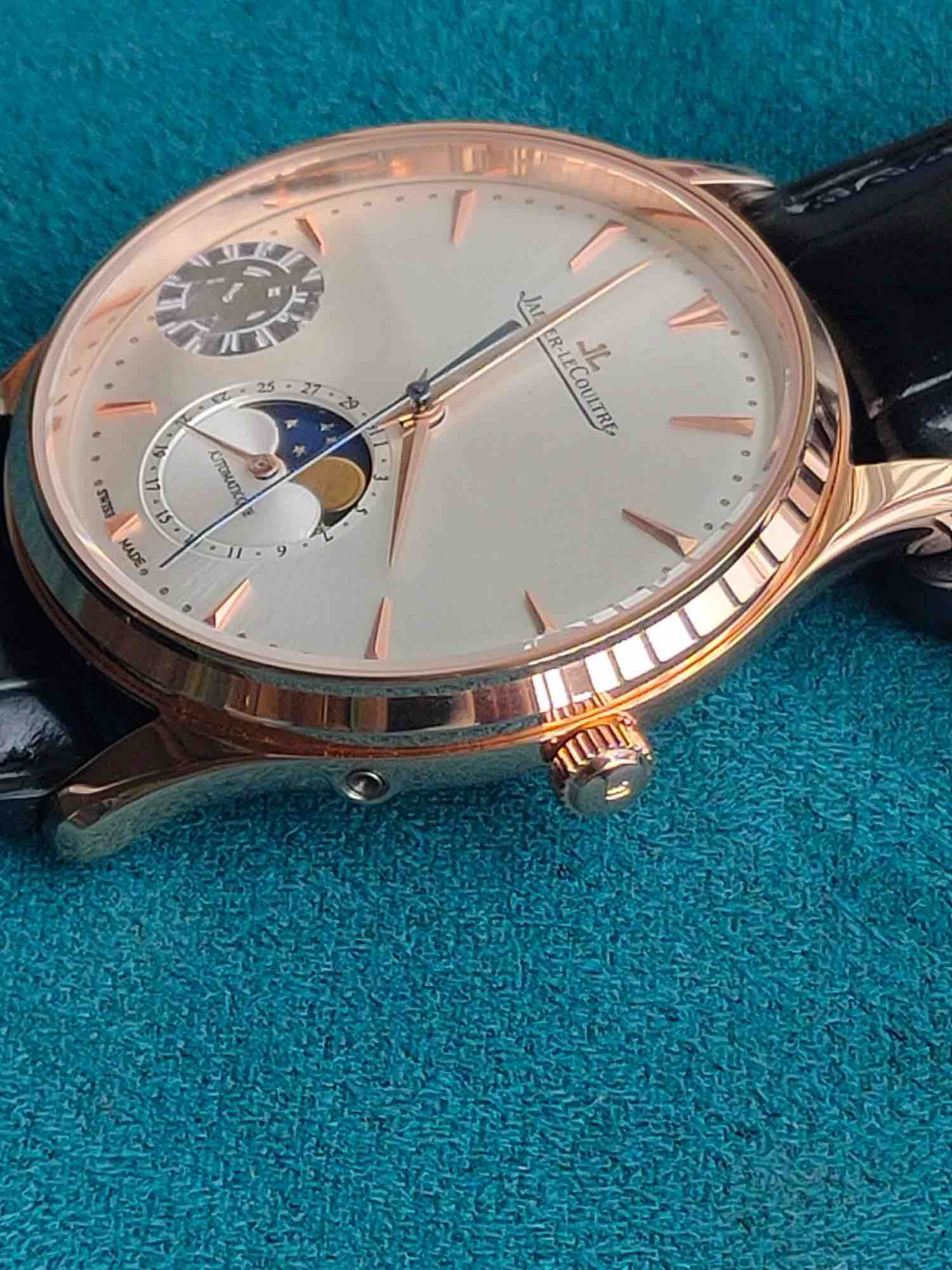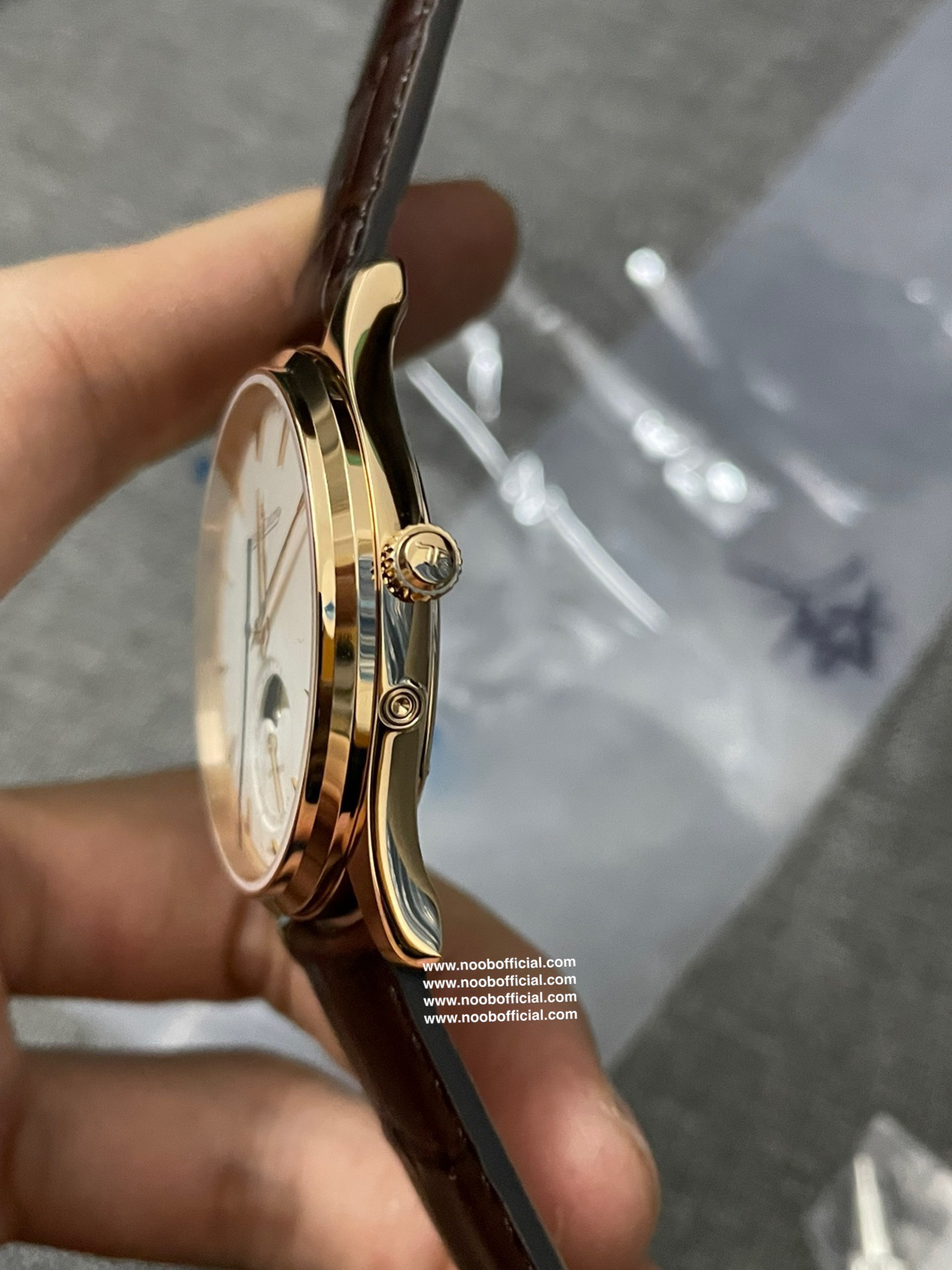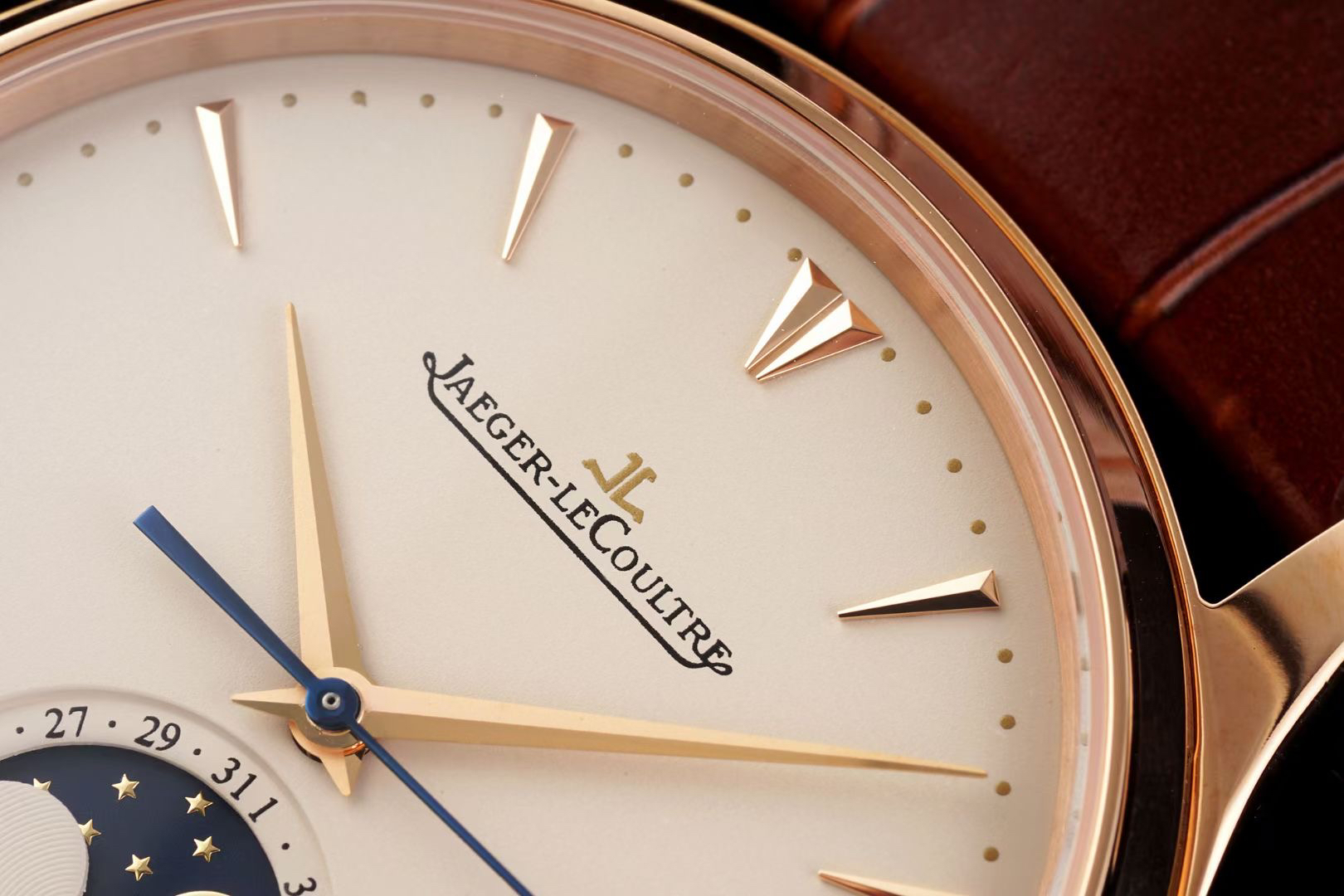 ZF积家月相大师系列,表壳直径39mmX9.9mm与原装同步。六点钟的子盘拥有阳历阴历(月相)双期显示,月相一月转一圈,功能和正品一致。【技术突破】采用9015改积家自产Cal.925/1机芯,功能百分百同步原装自产机芯。走时稳定,素质坚挺。【细节突破】从侧面观察腕表盘面发现有微微的弧度,ZF为了达到这一效果,耗时费力多次调整模具,确保神韵和感觉能与原装相媲美。ZF积家月相大师