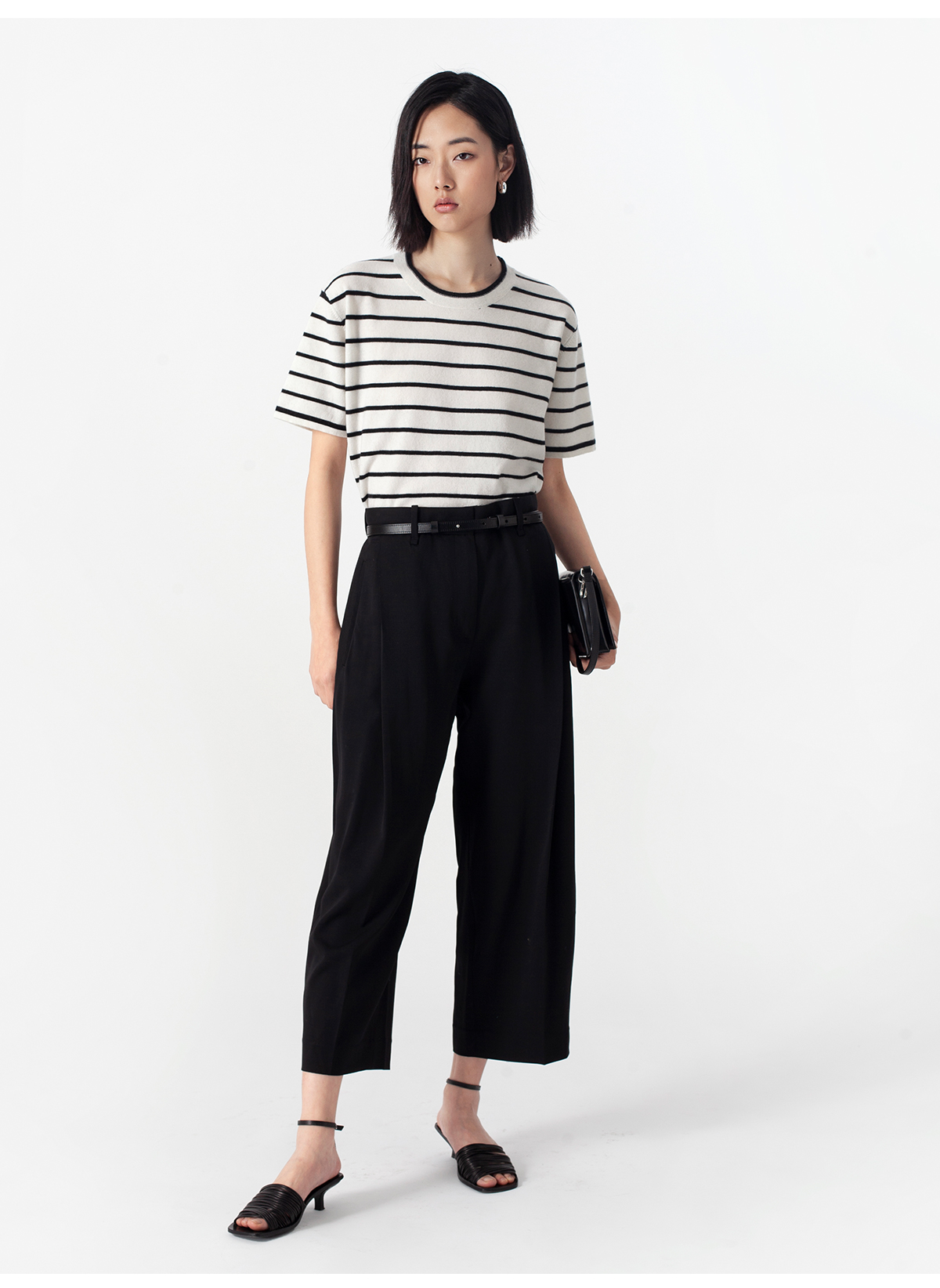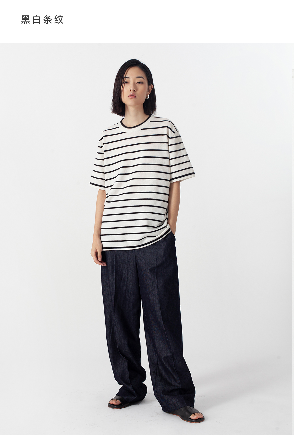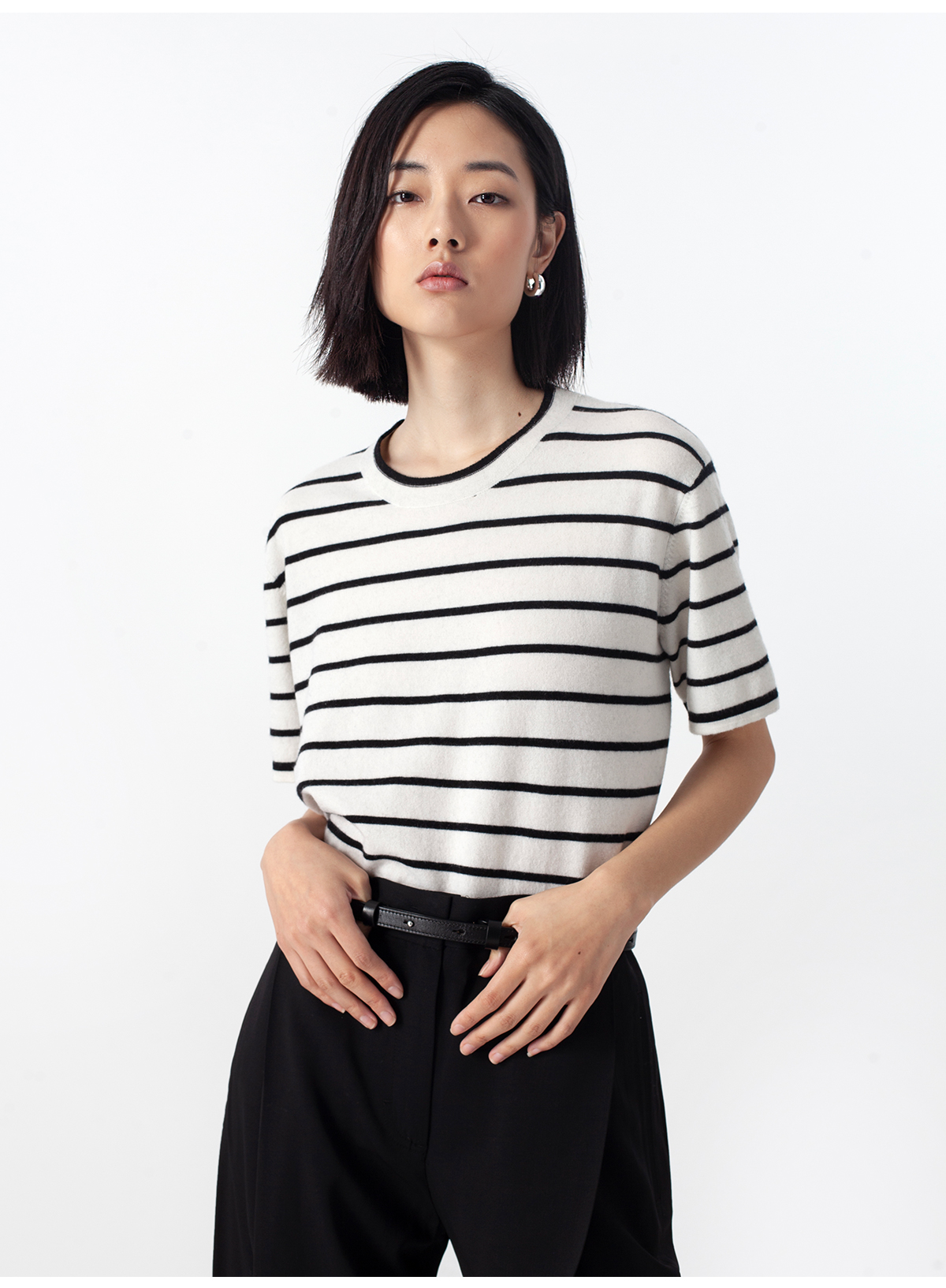 322工房经典再造羊毛羊绒圆领针织T恤2023春夏条纹针织套头衫B024
