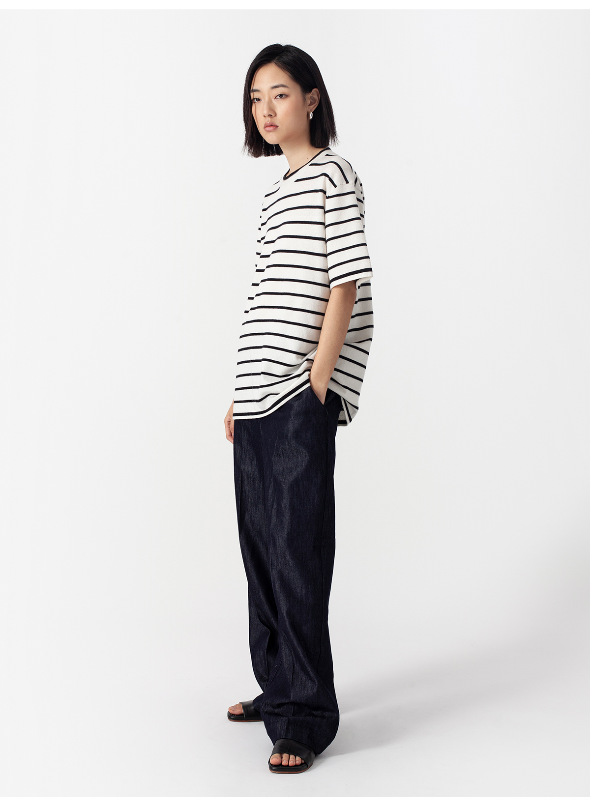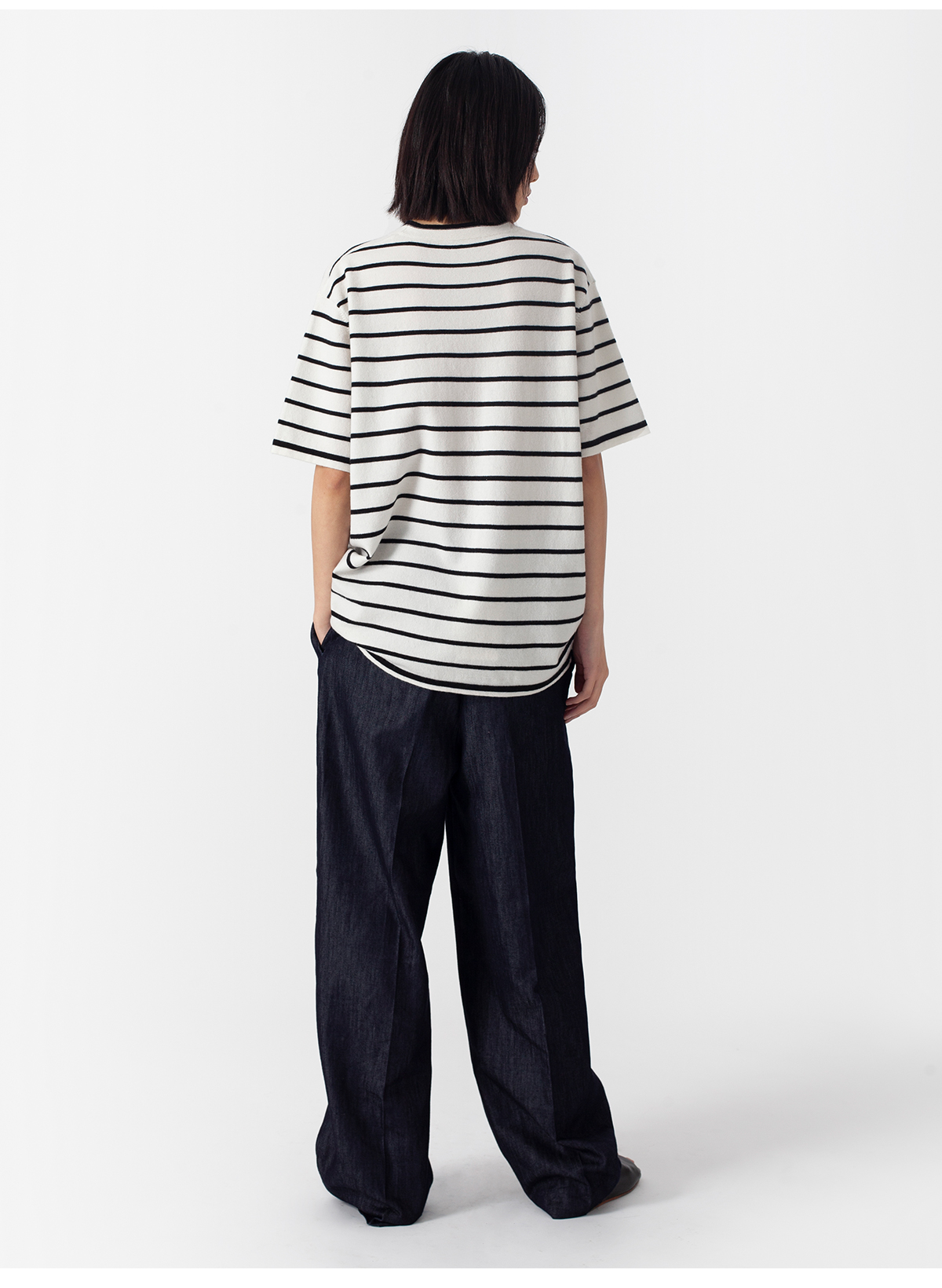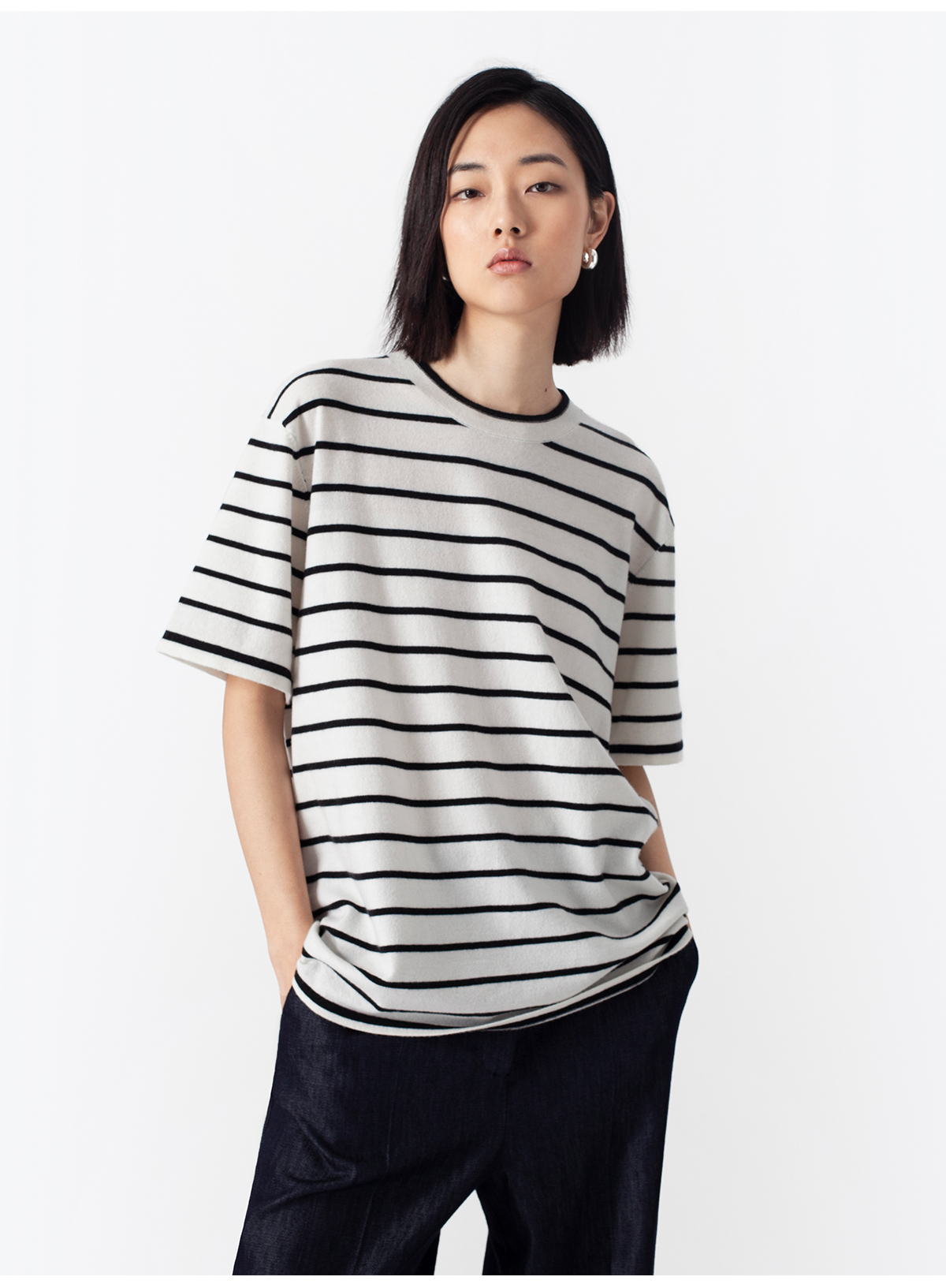 322工房经典再造羊毛羊绒圆领针织T恤2023春夏条纹针织套头衫B024