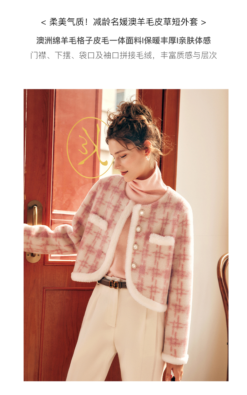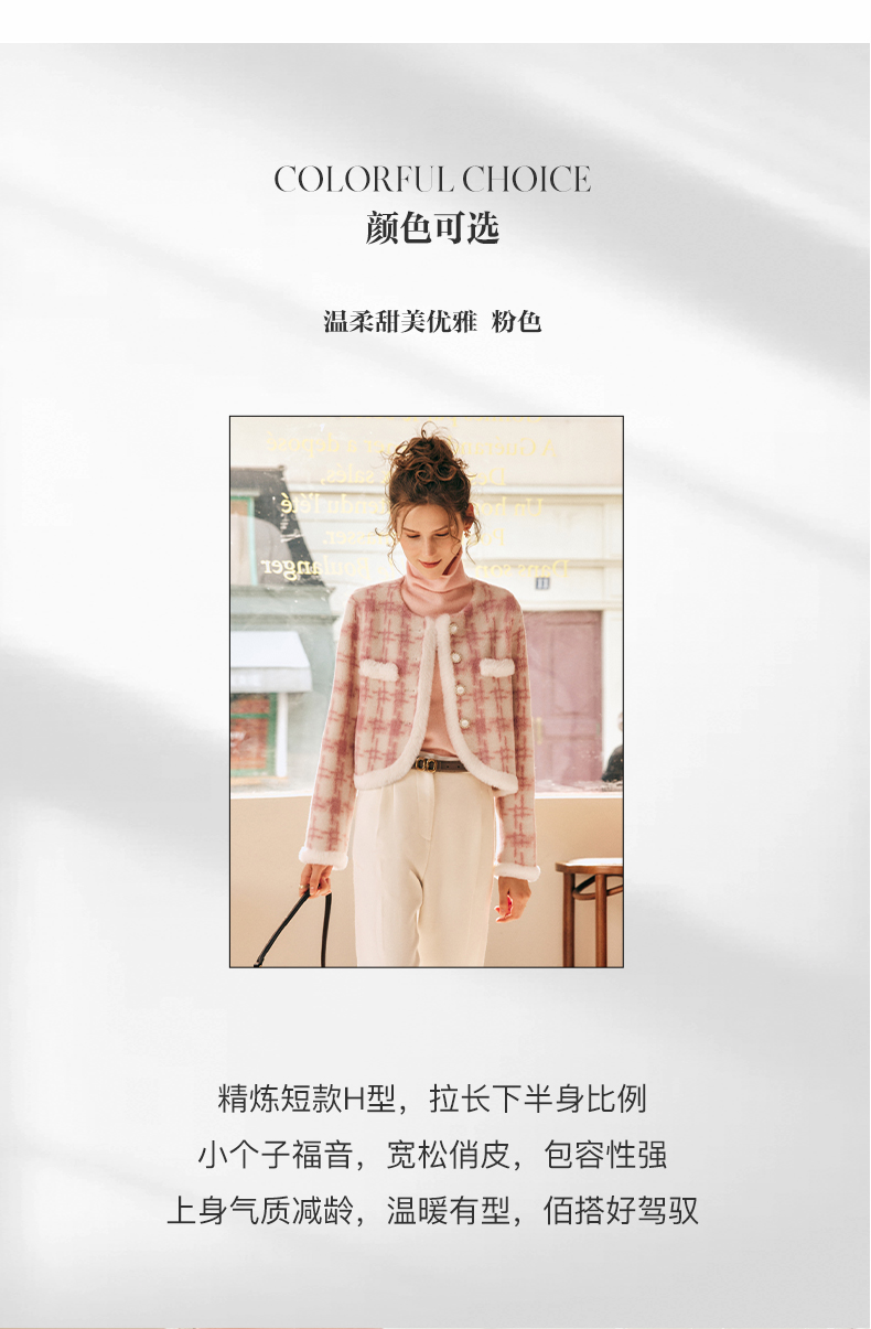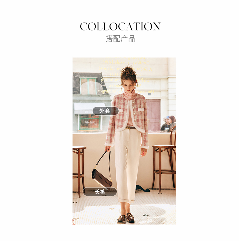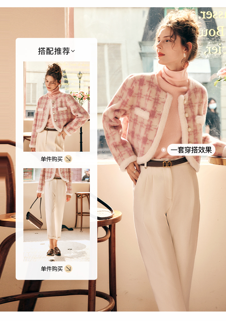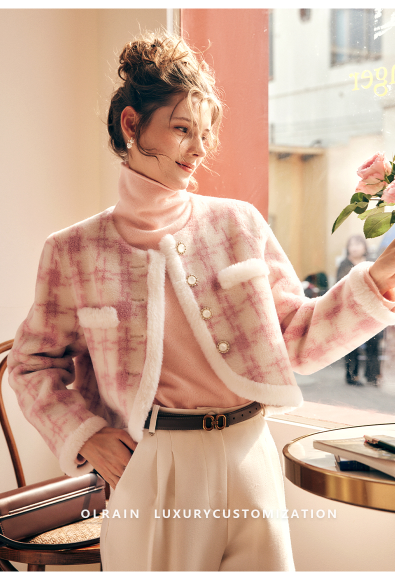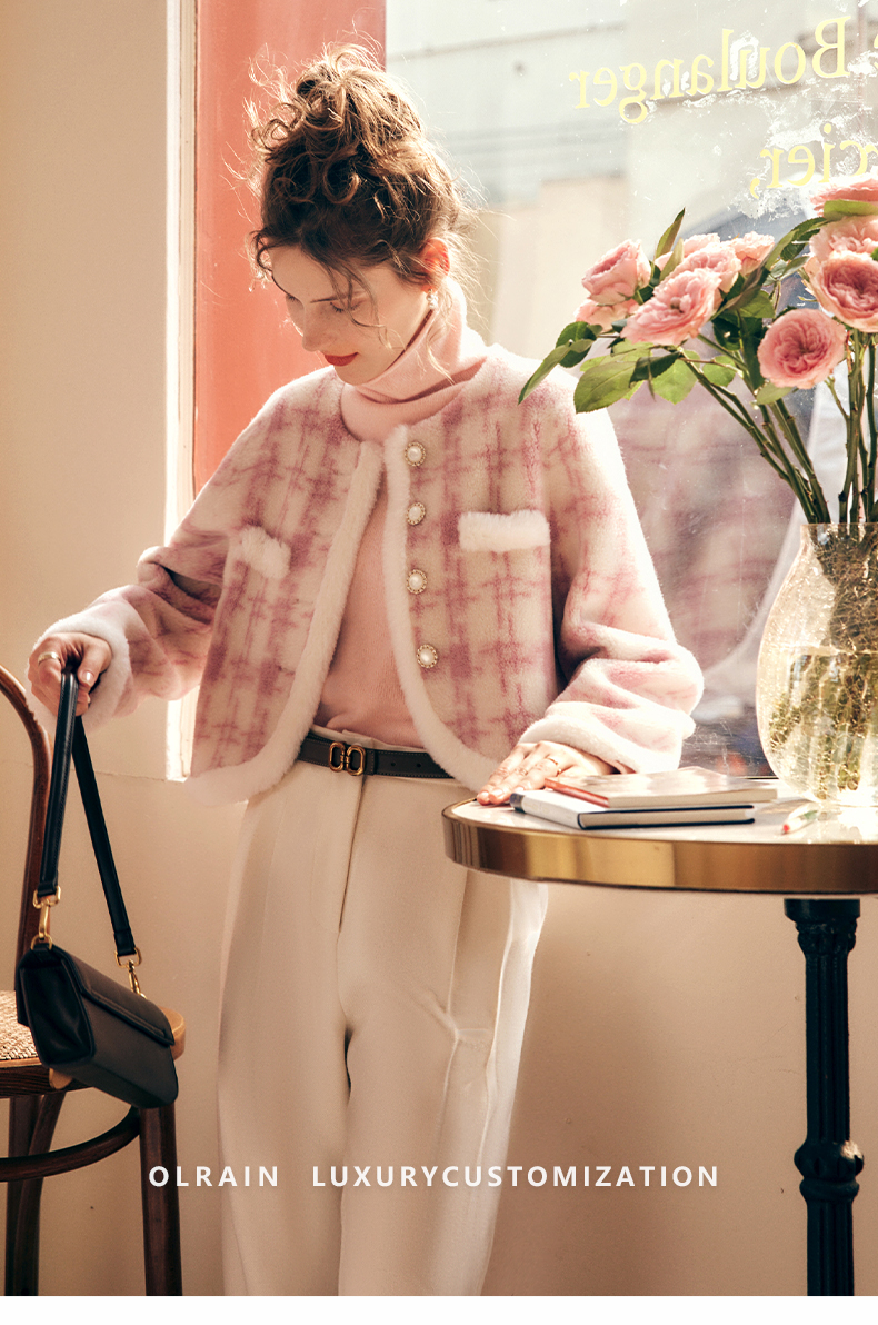 OLrain欧芮儿法式粉色毛呢外套女秋冬2022年新款皮毛一体短款大衣