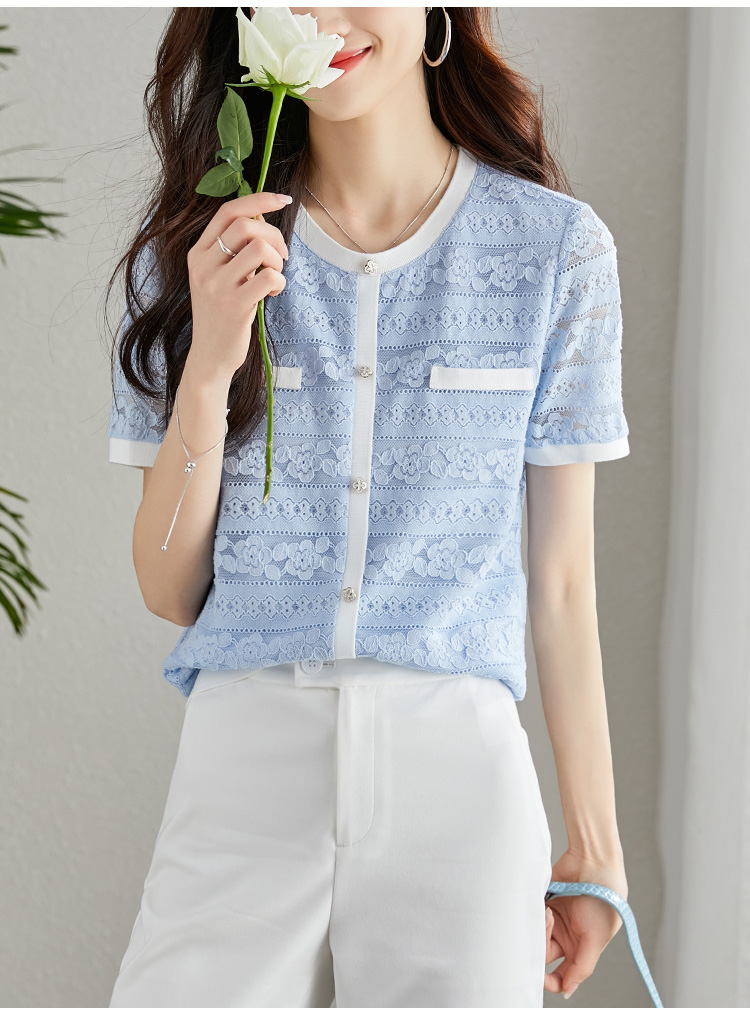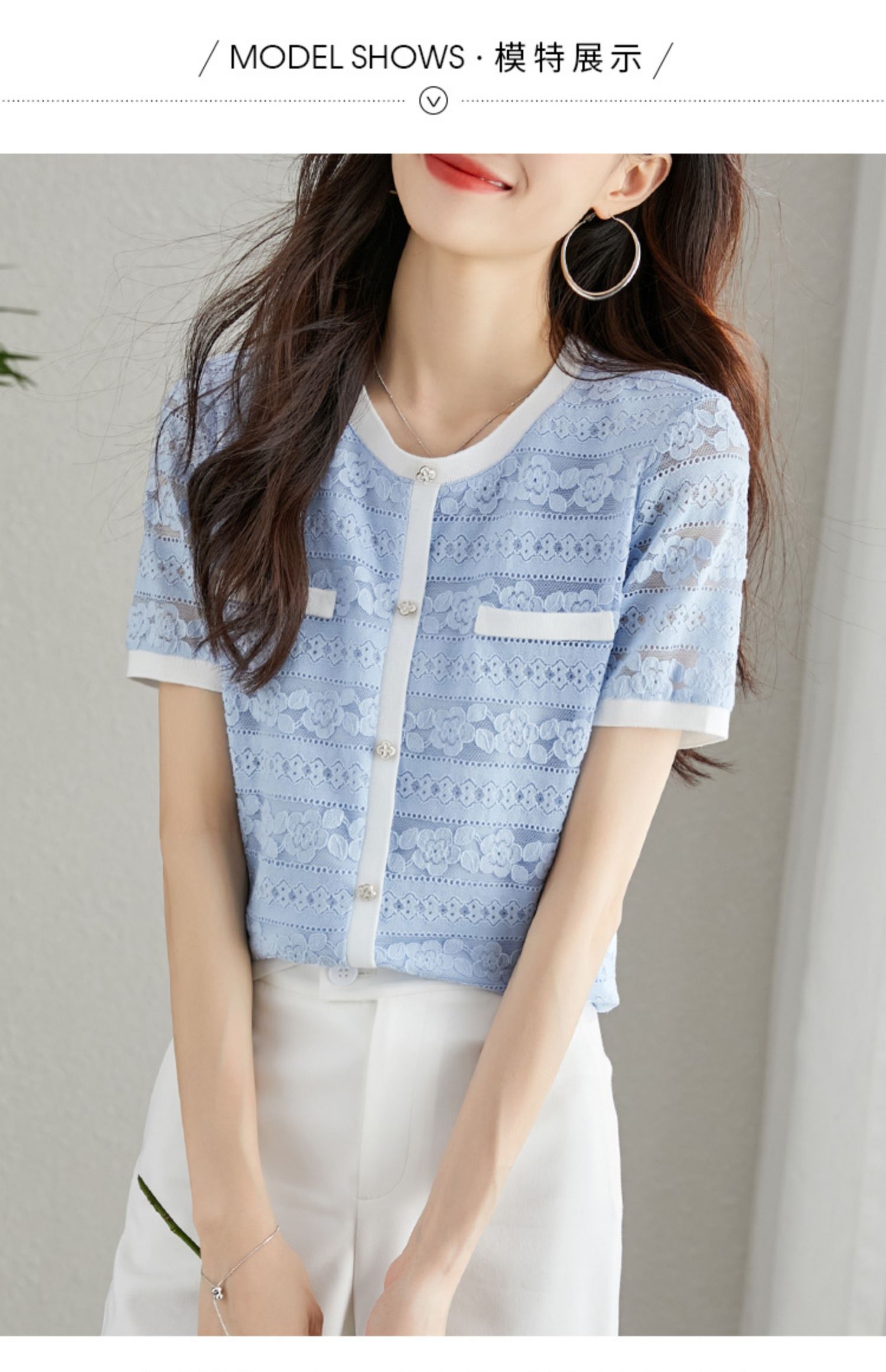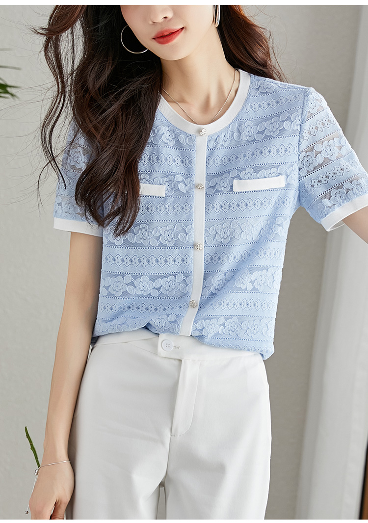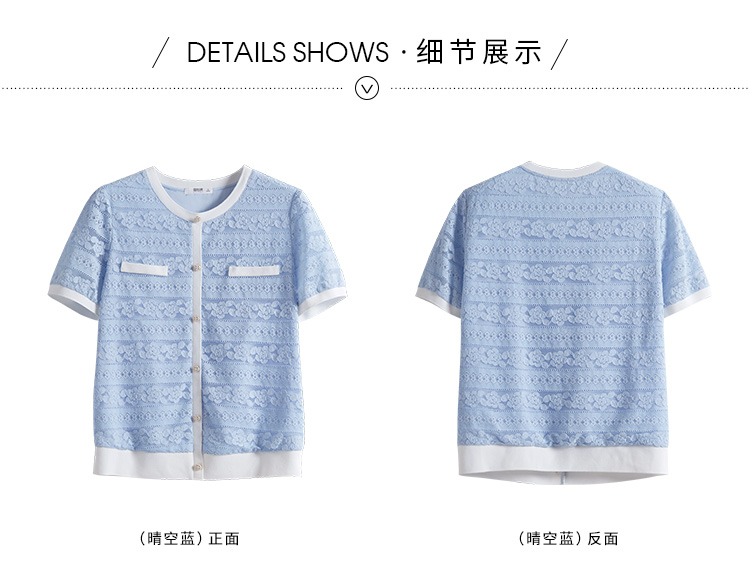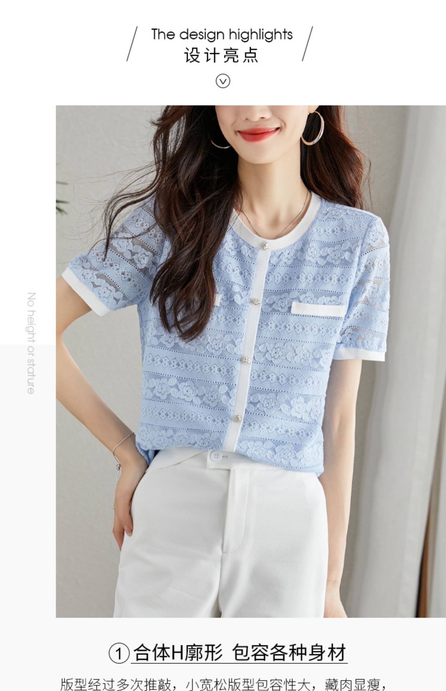 【59元福袋,不支持退换】高级蕾丝上衣女短袖夏季新款撞色圆领勾花镂空时尚小衫