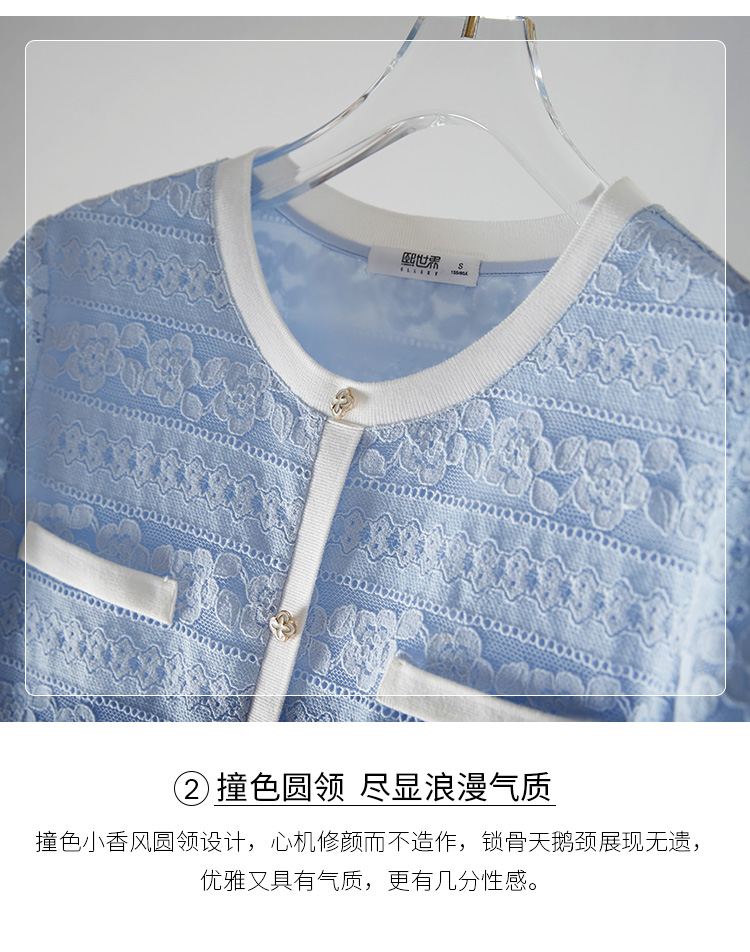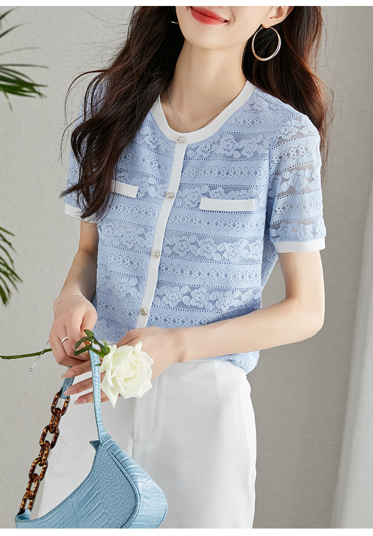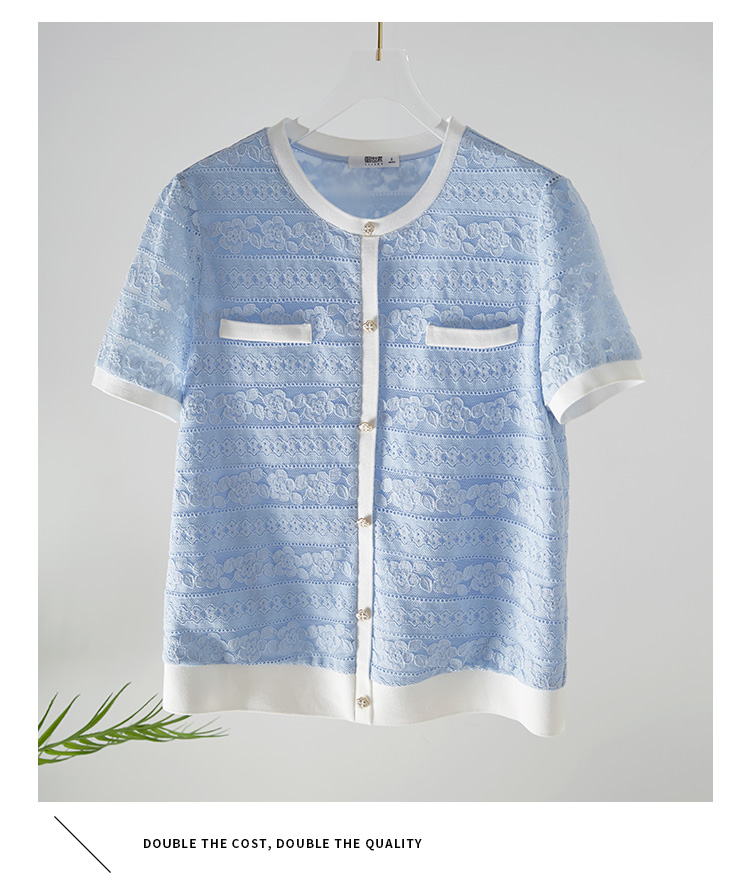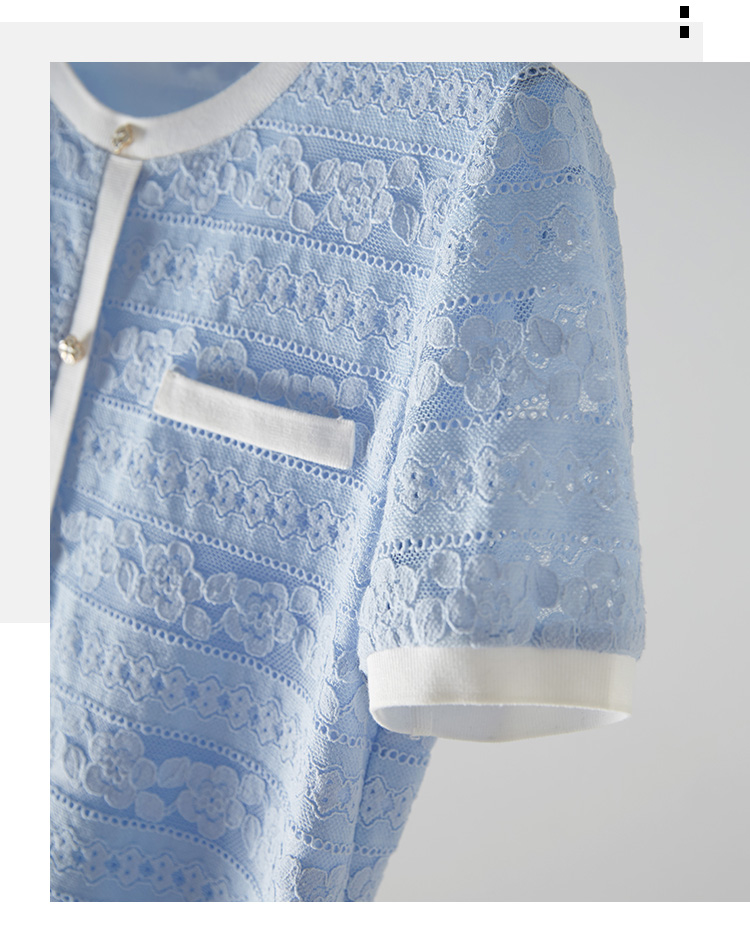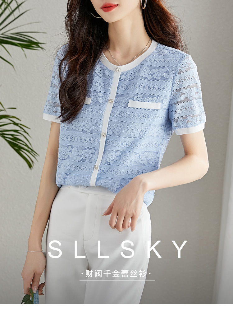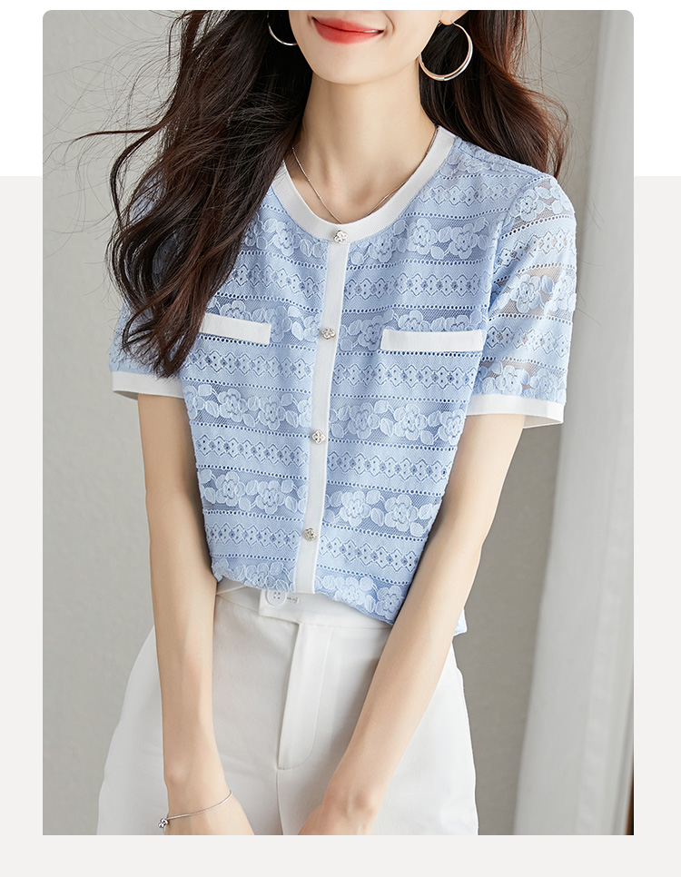 【59元福袋,不支持退换】高级蕾丝上衣女短袖夏季新款撞色圆领勾花镂空时尚小衫