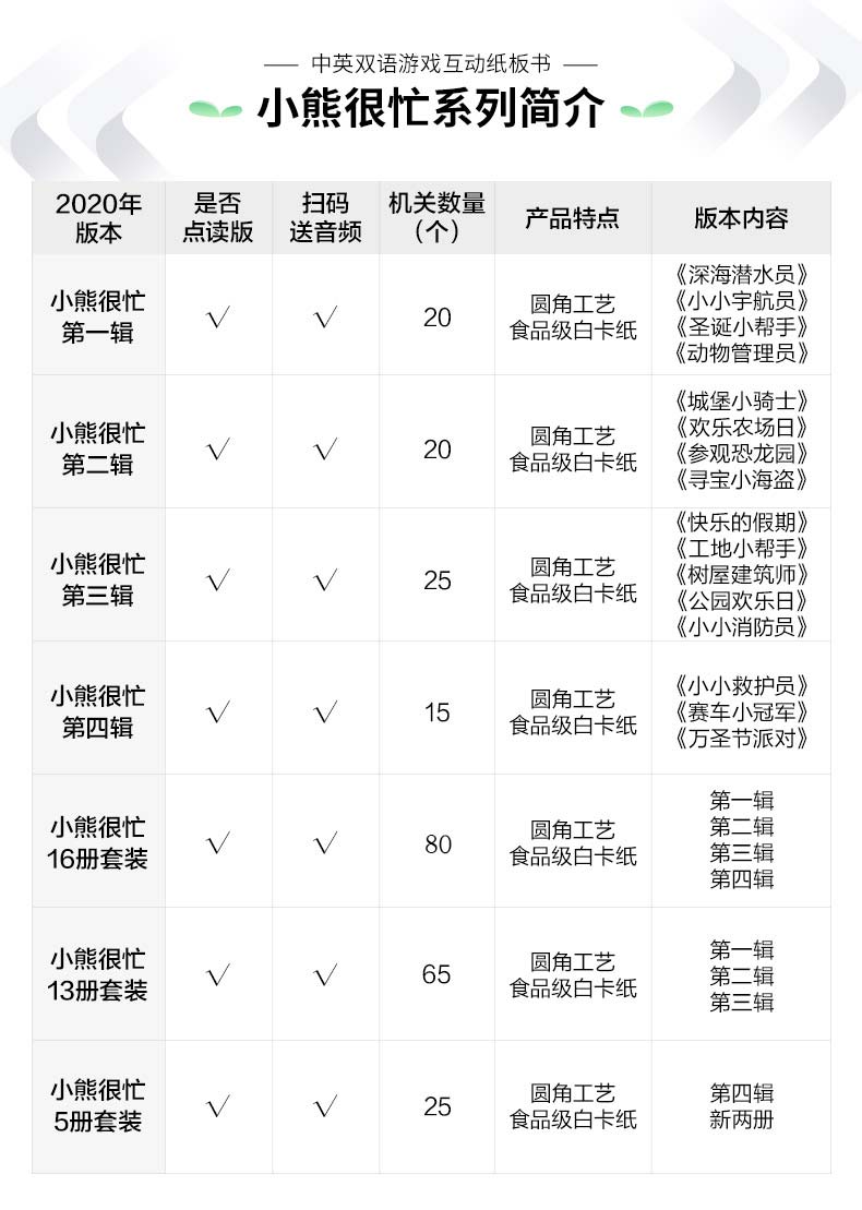 《小熊很忙系列·辑(升级版)》为全新超厚白卡纸音频升级版,有趣好玩的故事配上丰富的互动机关,宝宝用小手推一推、拉一拉、转一转、滑一滑,就能看到意想不到的惊喜,既锻炼了小手的灵,又鼓励宝宝主动探索。扫描封底二维码,即可跟随外教磨耳朵、学发音。朗朗上口的中英歌谣,打造浸入式阅读环境,从小培养宝宝的英文语感。这本书让宝宝会从“玩”中去探索世界,体验身边不同的生活和职业。