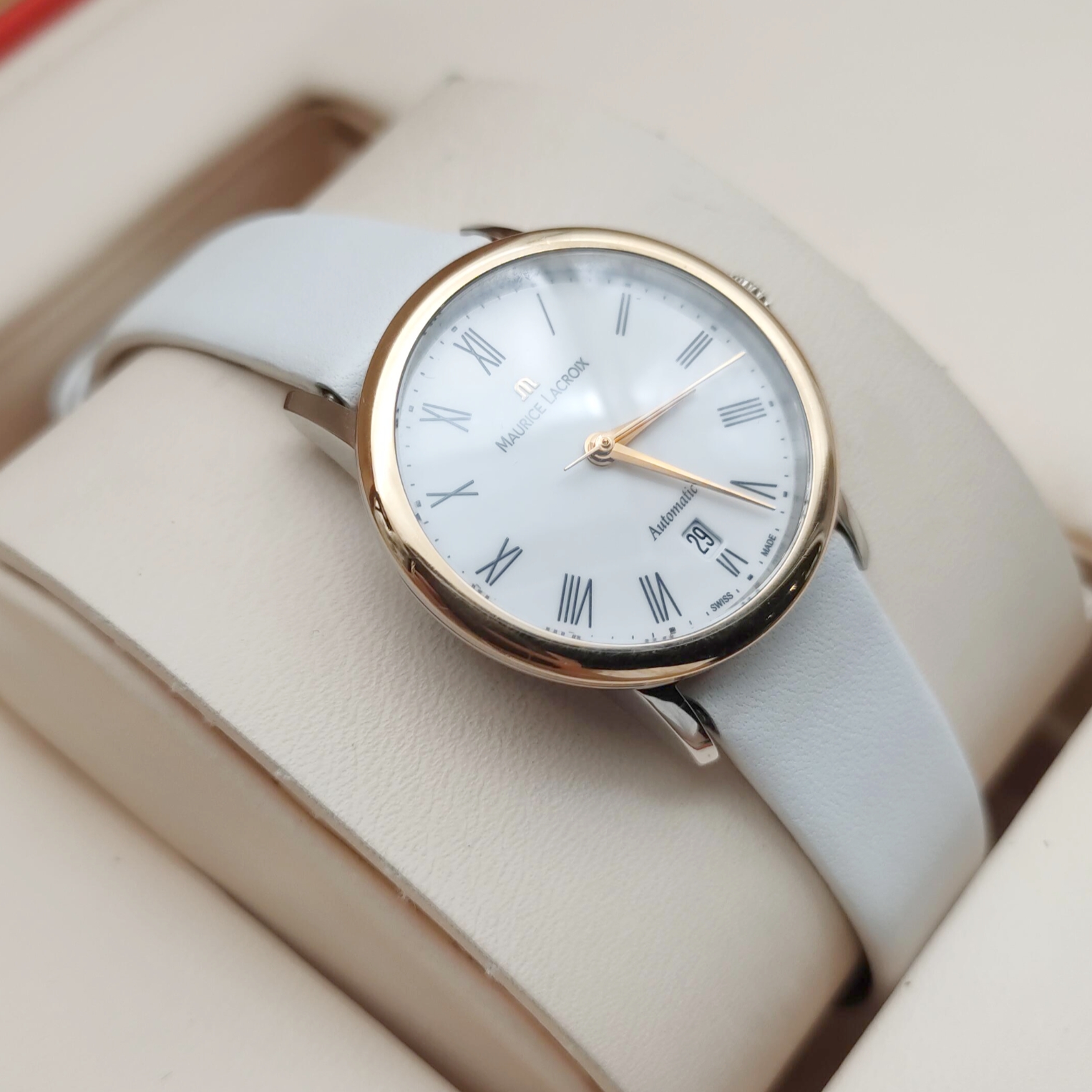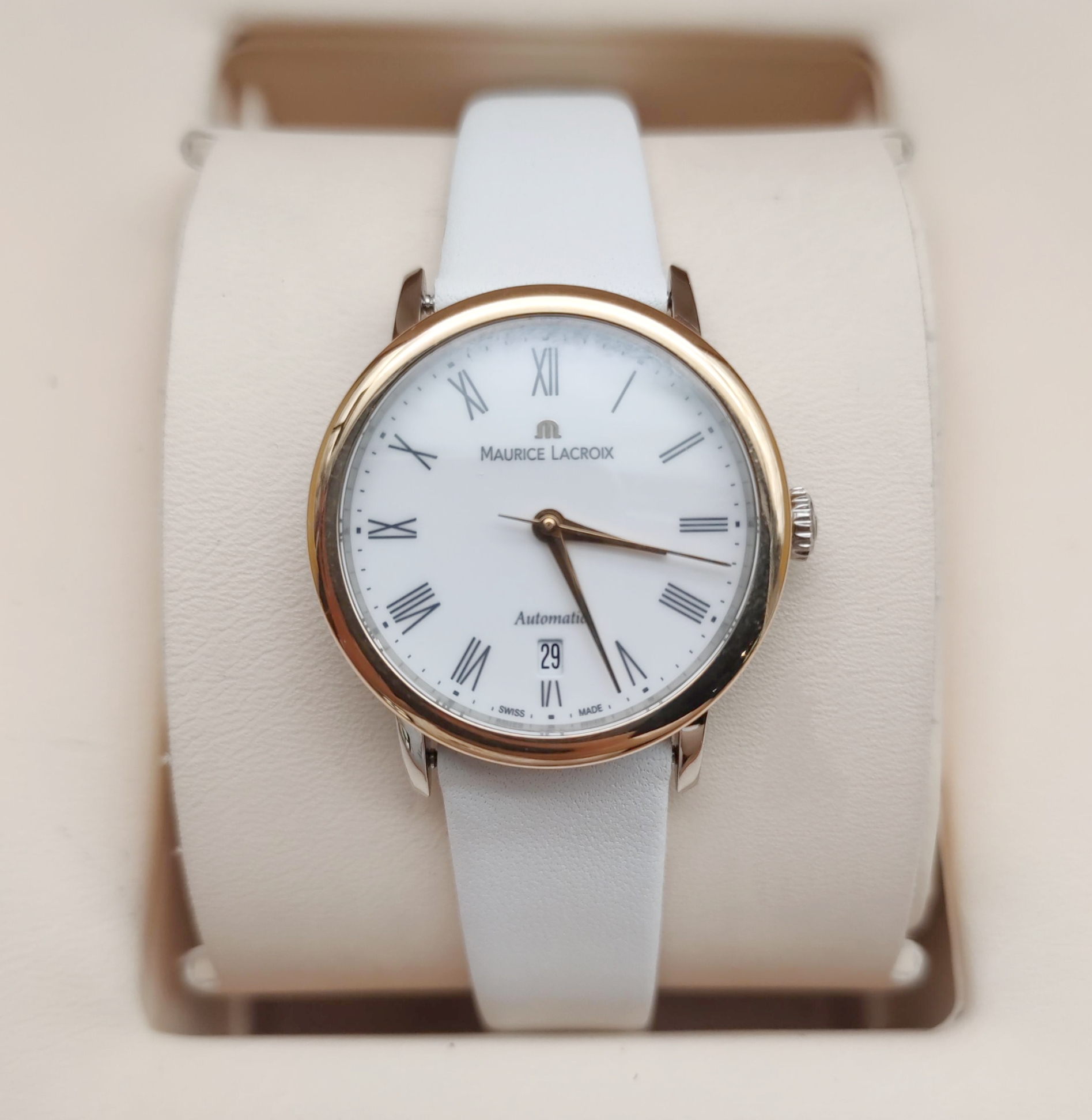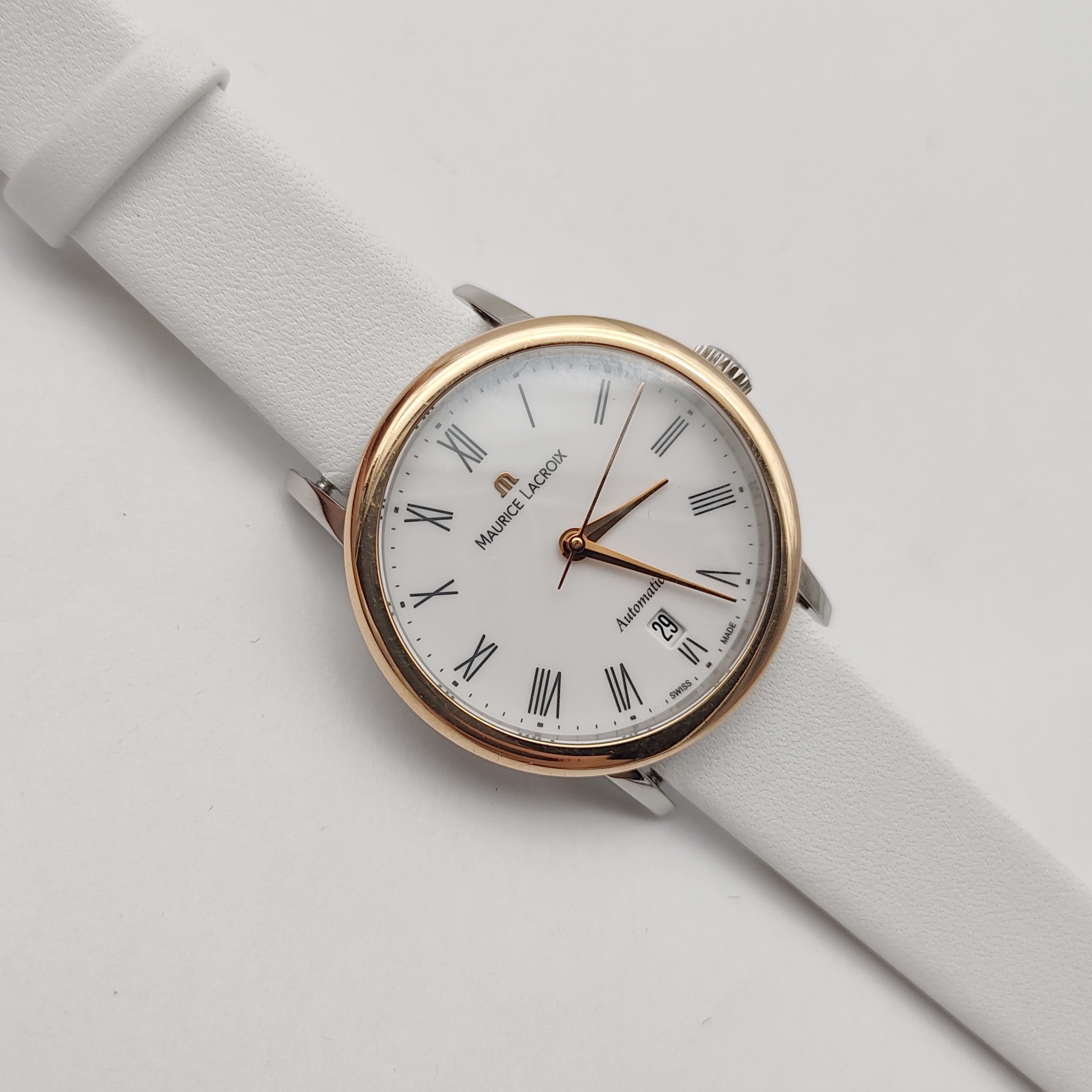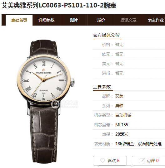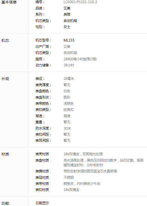 艾美典雅系列LC6063女款机械表,28mm表径,白色表盘,罗马数字刻度,精钢18K玫瑰金,双面抛光处理表壳,日期显示,9成新,附件无,专柜价23000,现好价