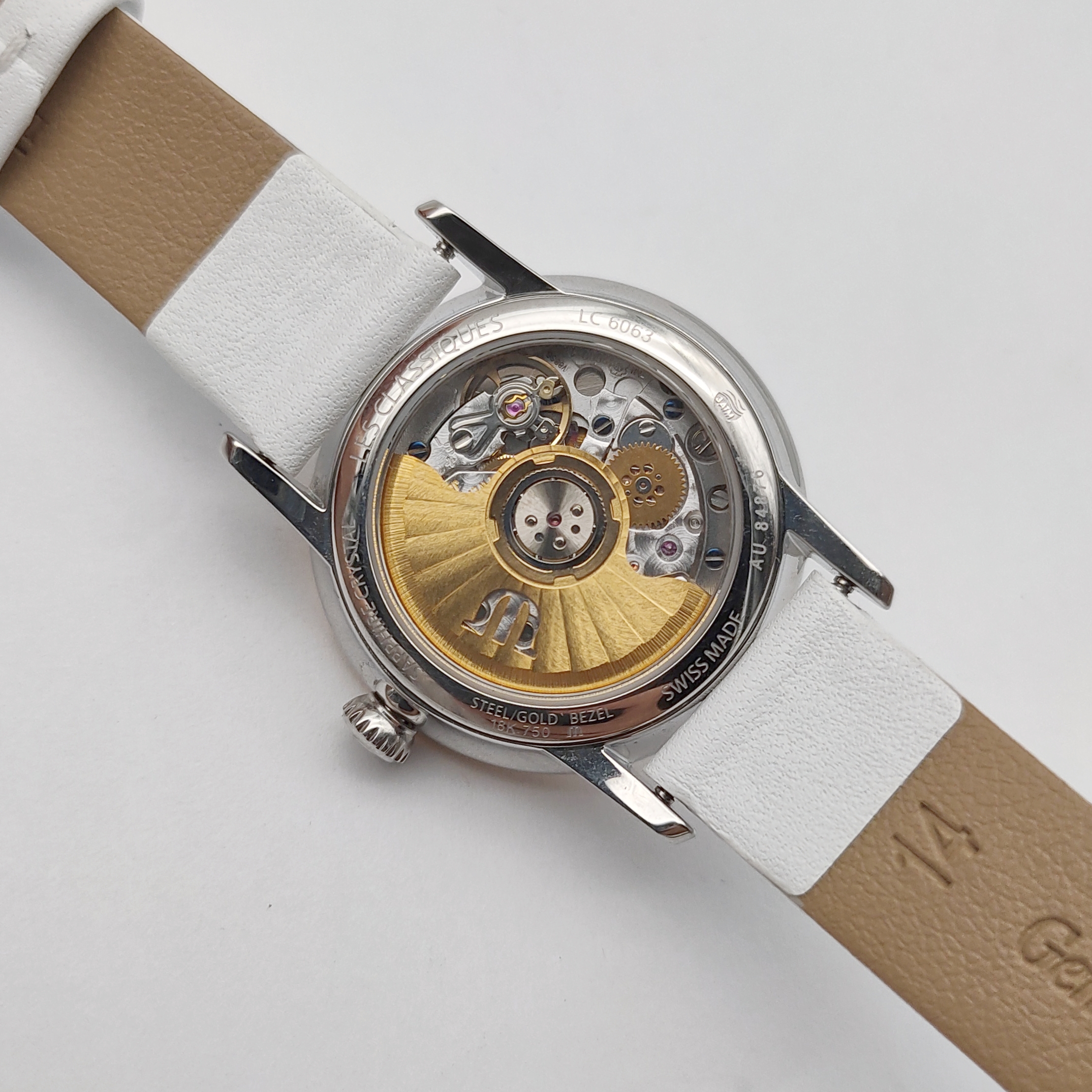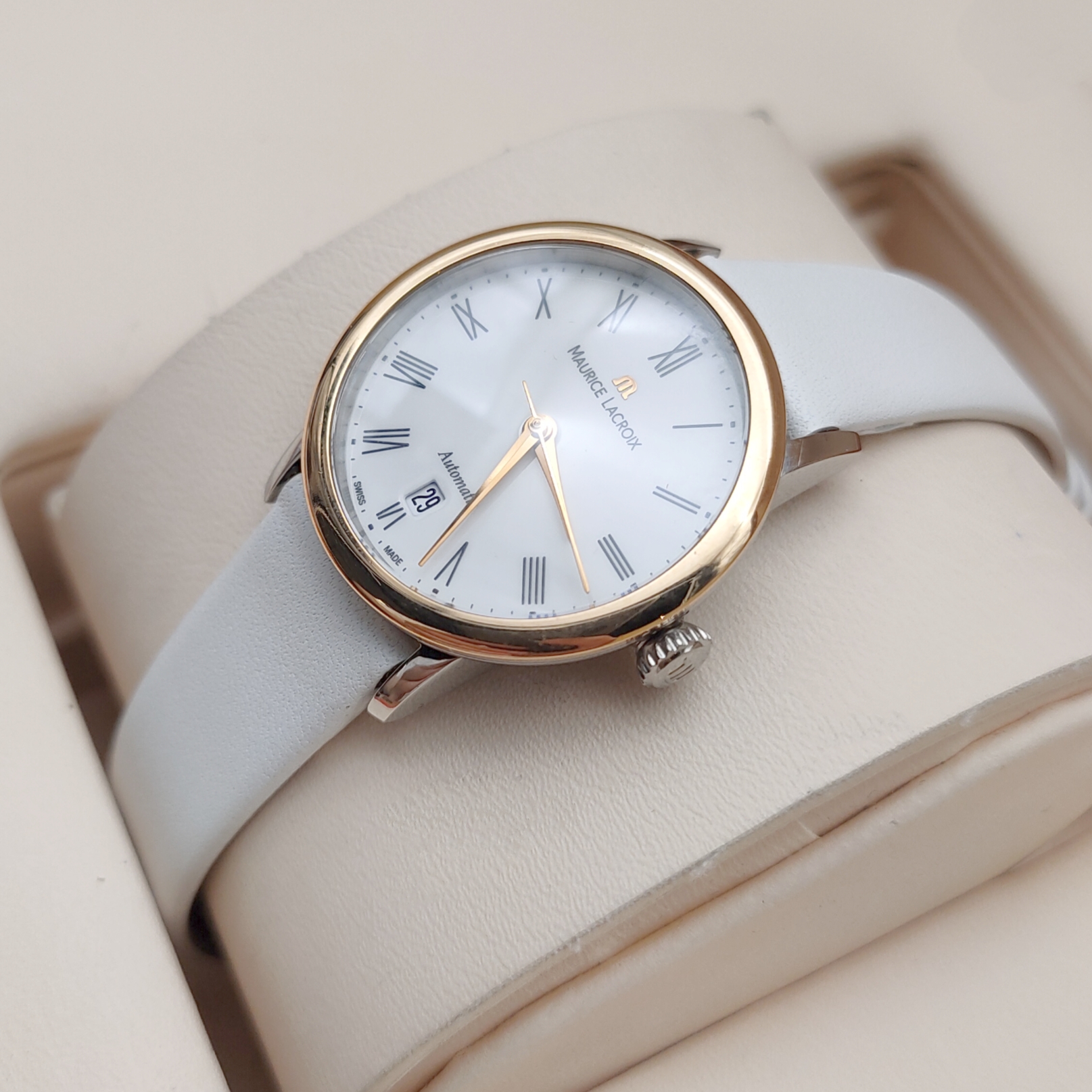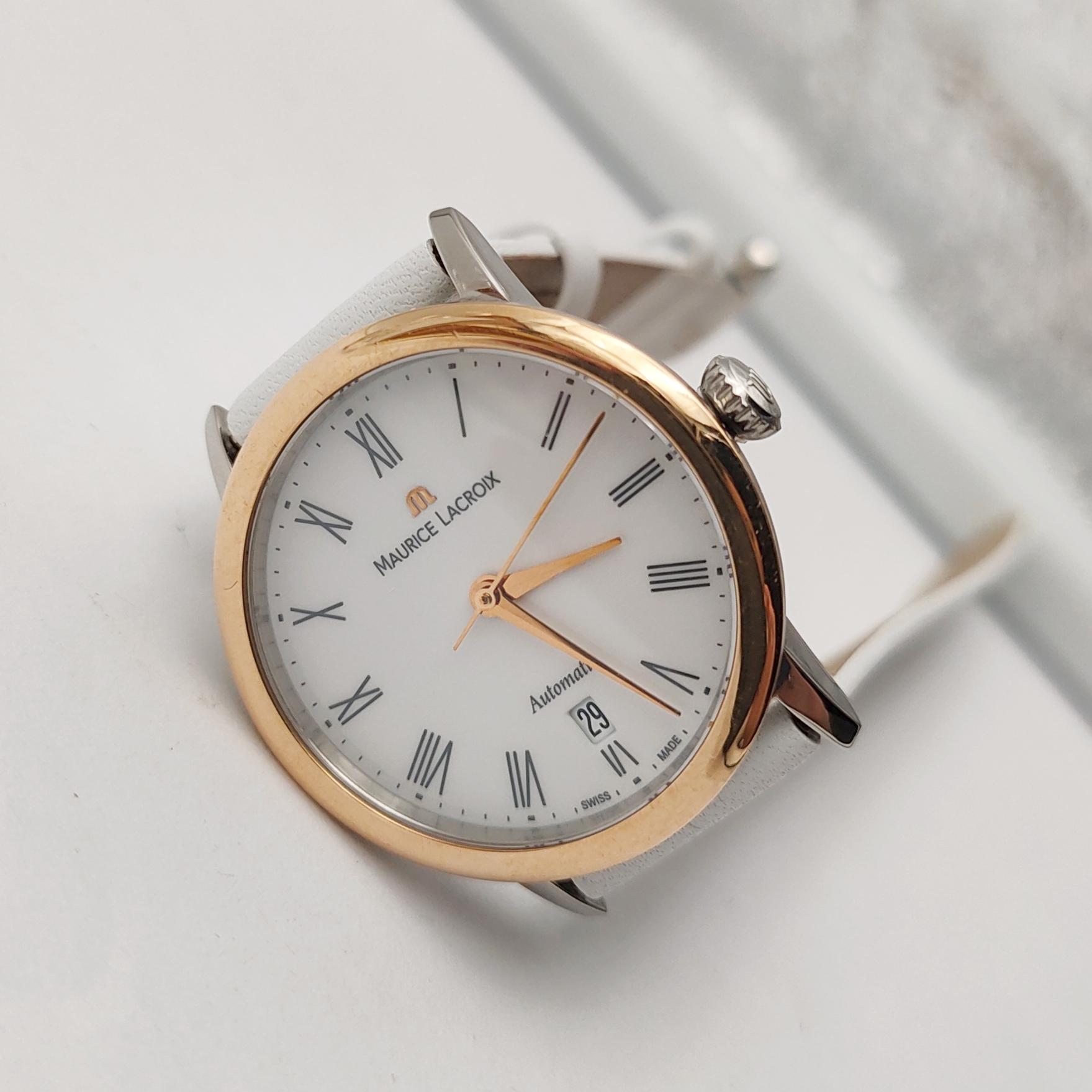 艾美典雅系列LC6063女款机械表,28mm表径,白色表盘,罗马数字刻度,精钢18K玫瑰金,双面抛光处理表壳,日期显示,9成新,附件无,专柜价23000,现好价