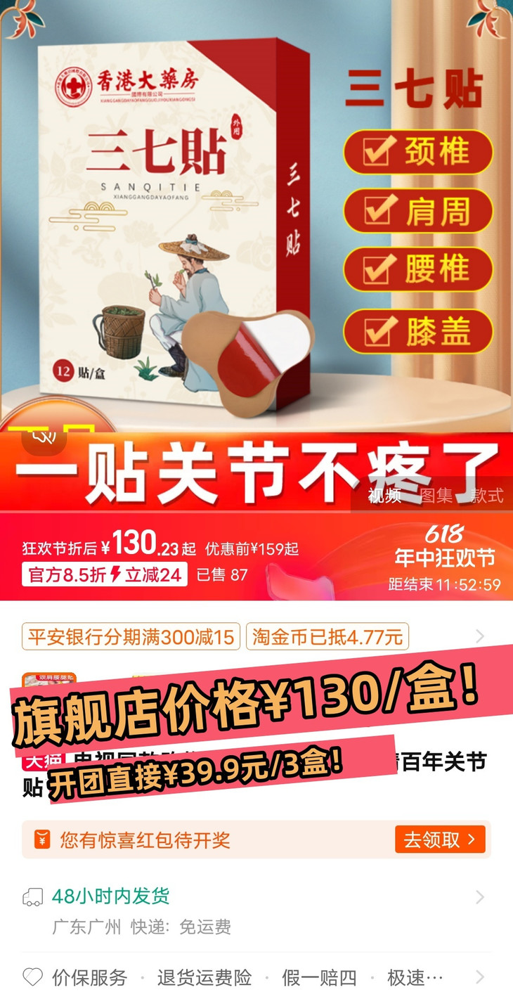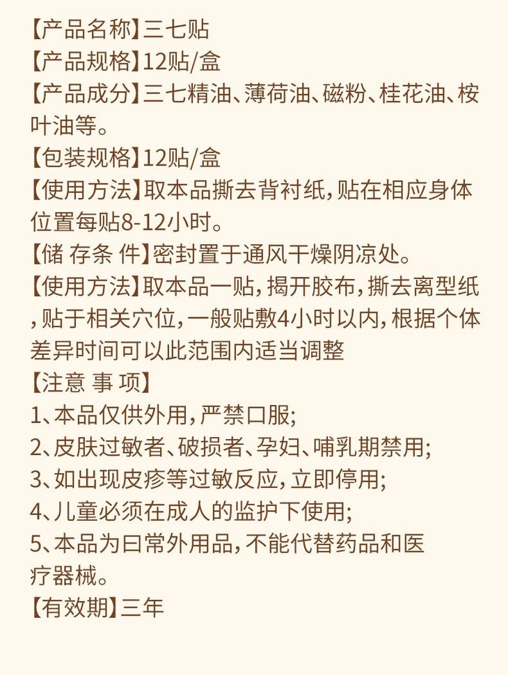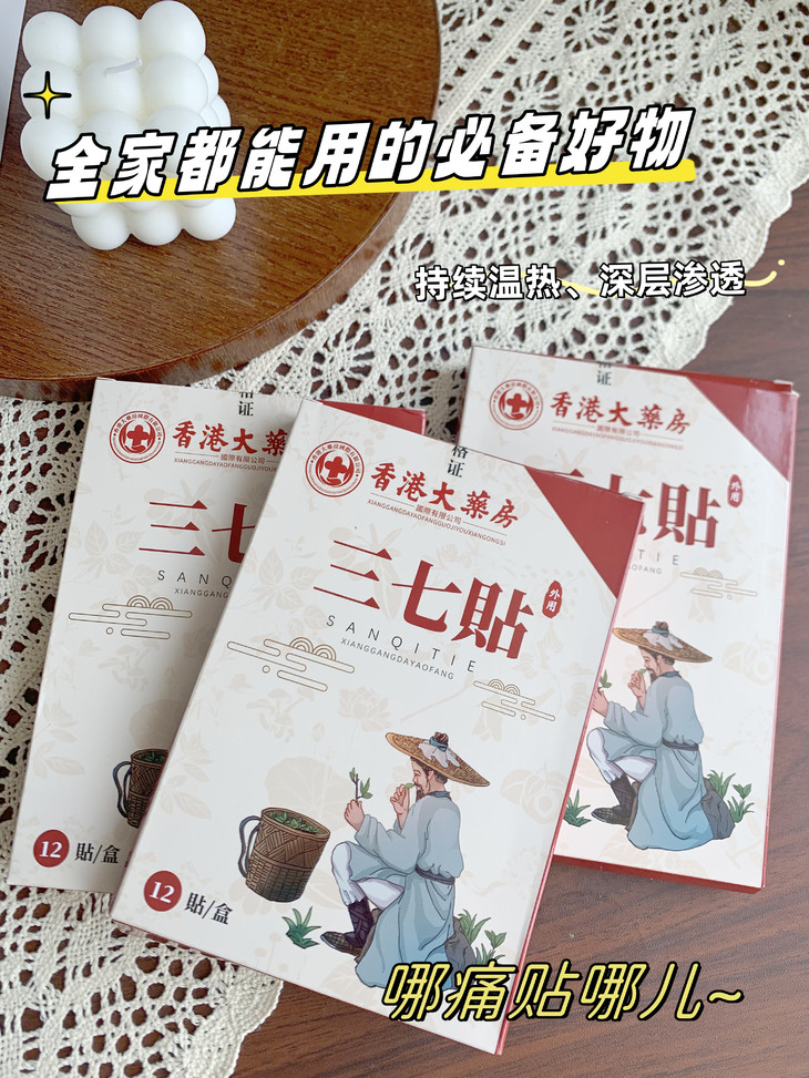 单一的液体止痛ji,效果总是不尽如人意 而香港大药房三七贴与众不同的地方在于 它不仅含有三七,还额外添加了种其他国药成分, 一整贴都是抽湿驱寒、活络通经、去肿去痛的神奇成分! 🌟🌟🌟它堪比专业艾灸2小时的效果, 每天贴一贴这个三七贴就能轻松实现! 湿气、毒素、寒气,贴走吸走! 无需专业手法、无需找穴位 无纺布透气工艺使用更加便捷, 🌟哪里难受直接撕一贴贴上,轻松又方便