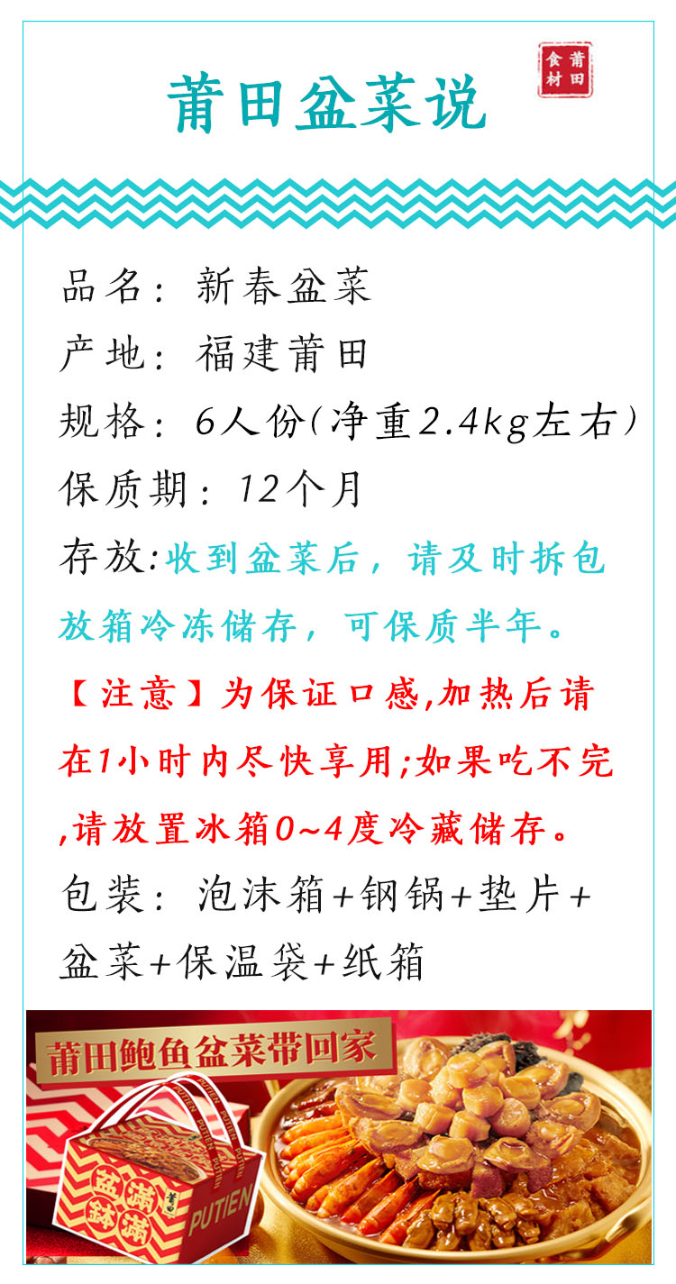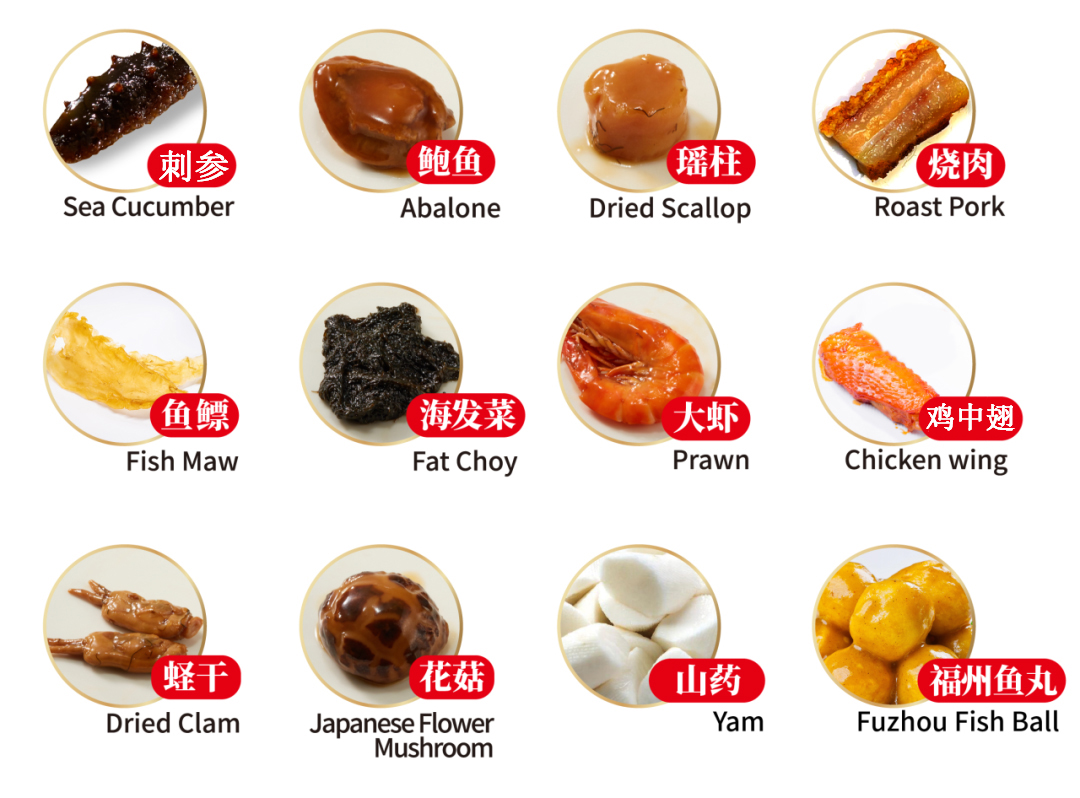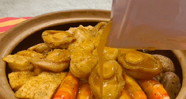盆菜汁经十几种原材料熬煮而成鸭掌、老母鸡、带皮五花肉、火腿、后腿肉、小粒青岛干贝、蚝干等似上汤般鲜美,又似羹汤般柔滑自福建莆田南日岛的鲍鱼小产区“海藻、紫菜等作为饲料原生态放养2-3年养出的南日鲍饱满肥厚带着独特香甜赋予了四海八方好食材有趣的灵魂。