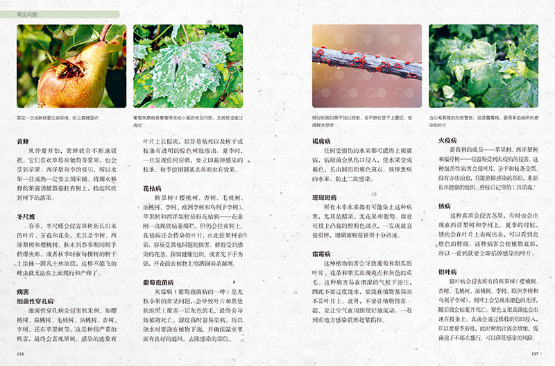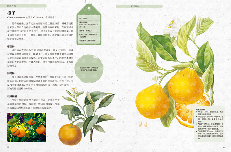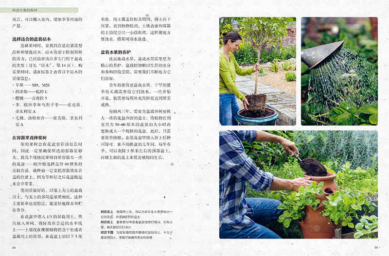 本书精选的常见的水果包括:多种多样的柠檬、枇杷、无花果、苹果、樱桃、石榴、猕猴桃、西瓜、草莓......也包含一些食用种子类的大果榛、核桃、扁桃等坚果类水果,既有家庭种植建议,也有打造家庭果园的妙招,既能满足多种水果互相呼应开花、结果的盛景,也能规划一年四季不同水果接连开花、丰收的盛况,总有一款水果适合你的窗台或庭院,一起来打造心仪的美丽果园吧!