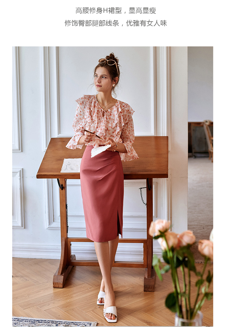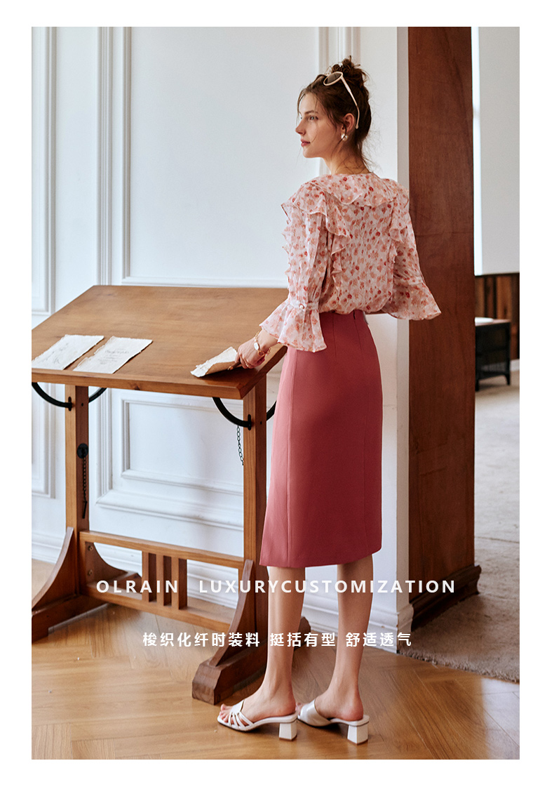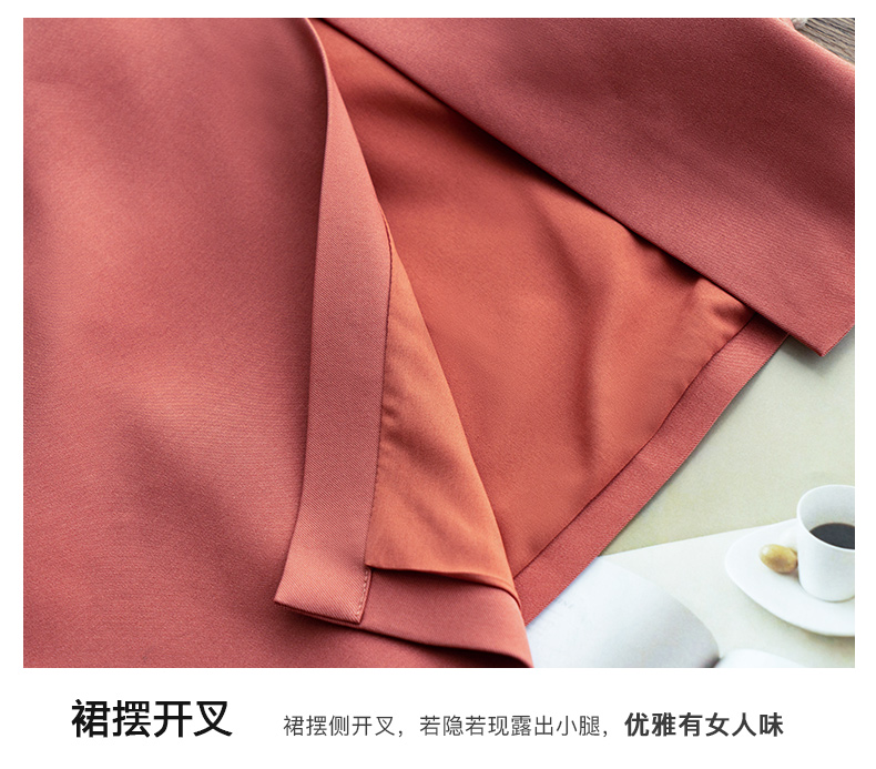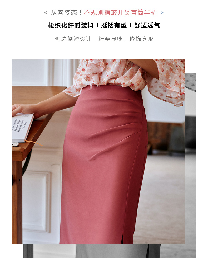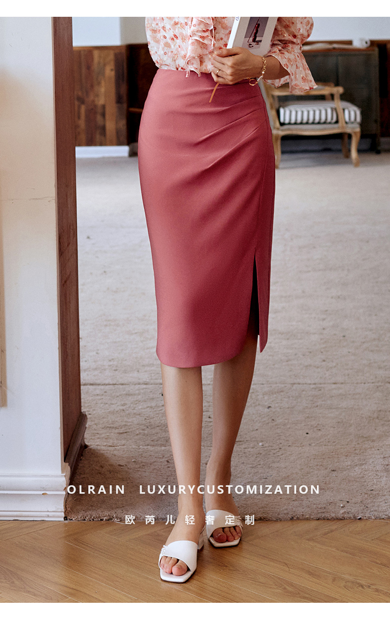 欧芮儿砖红色半身裙女2021新款高腰显瘦不规则褶皱开叉直筒裙