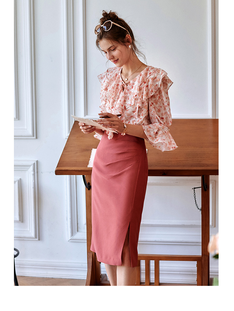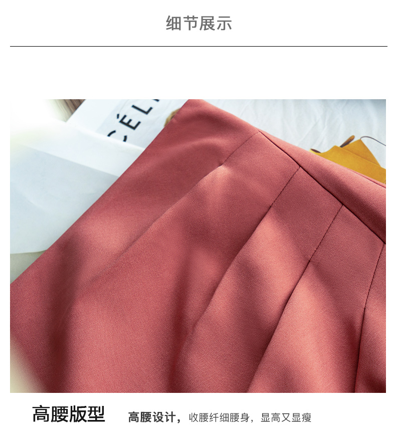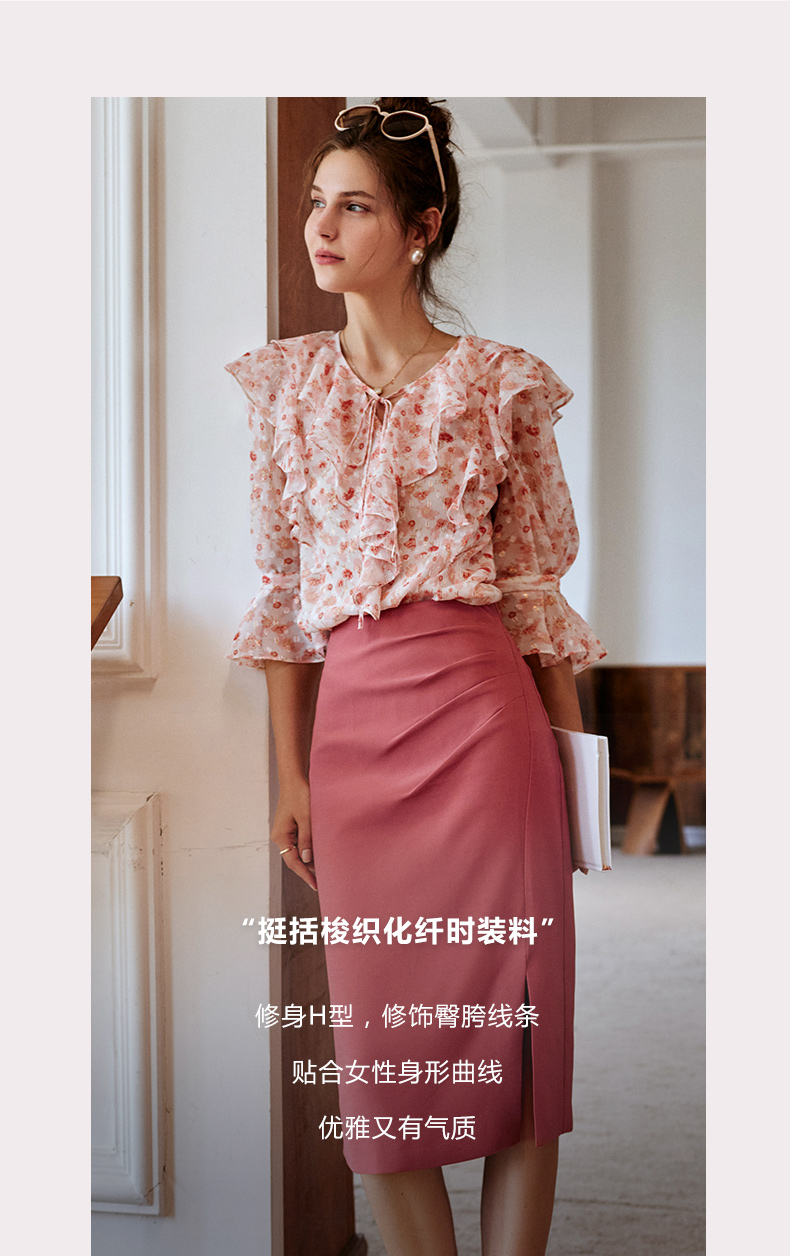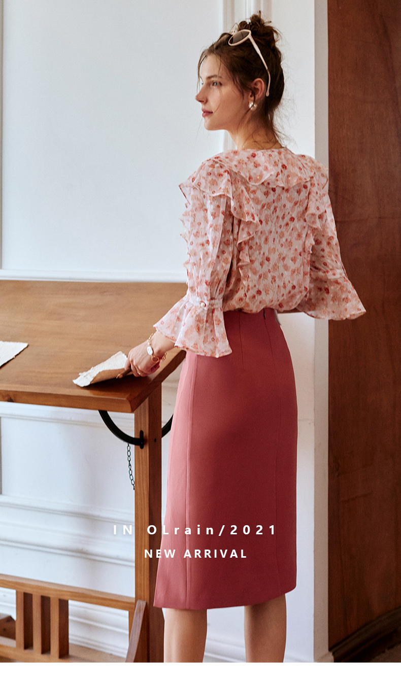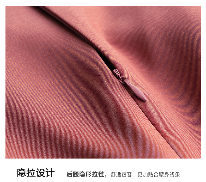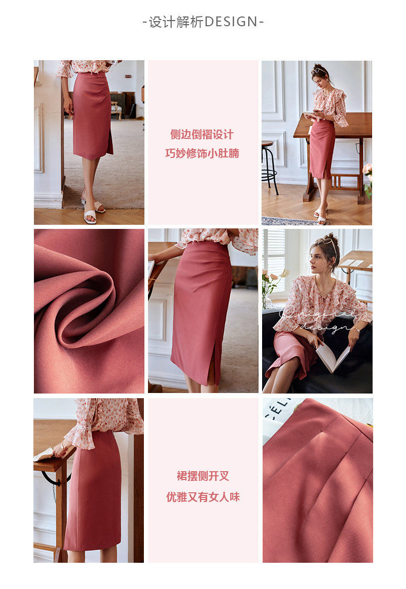 欧芮儿砖红色半身裙女2021新款高腰显瘦不规则褶皱开叉直筒裙