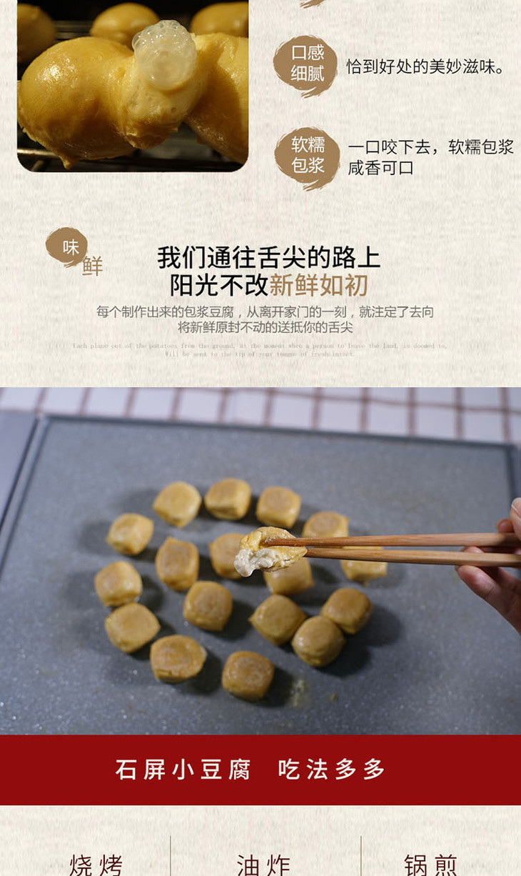 1.包浆豆腐是发酵性豆制品,变黄、有发酵臭味均为正常现象,不影响食用,介意慎拍哦。