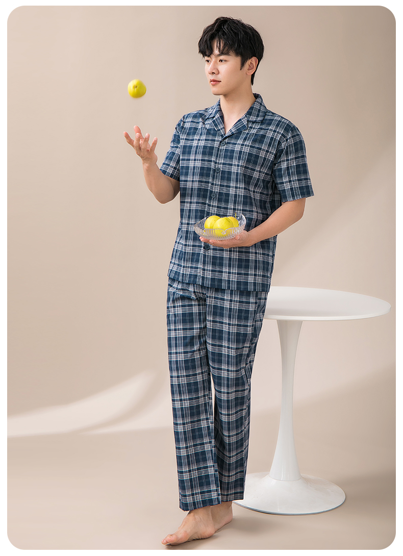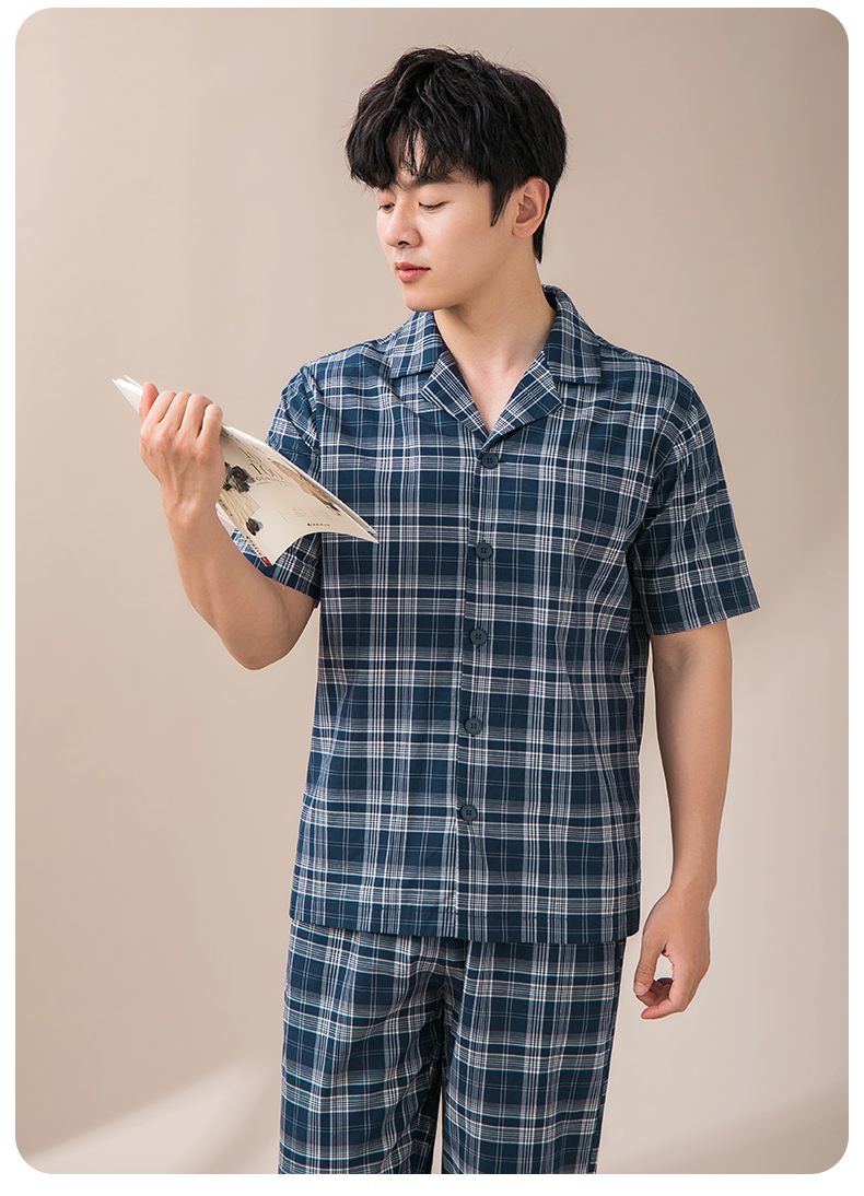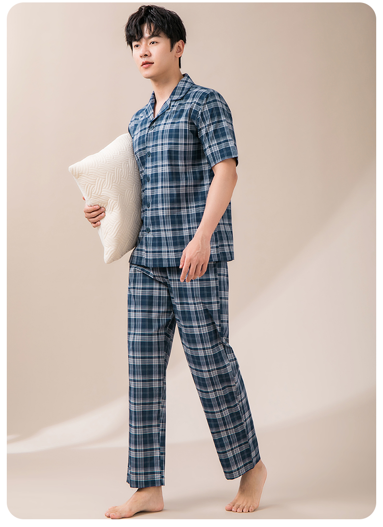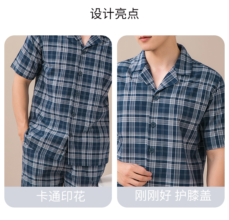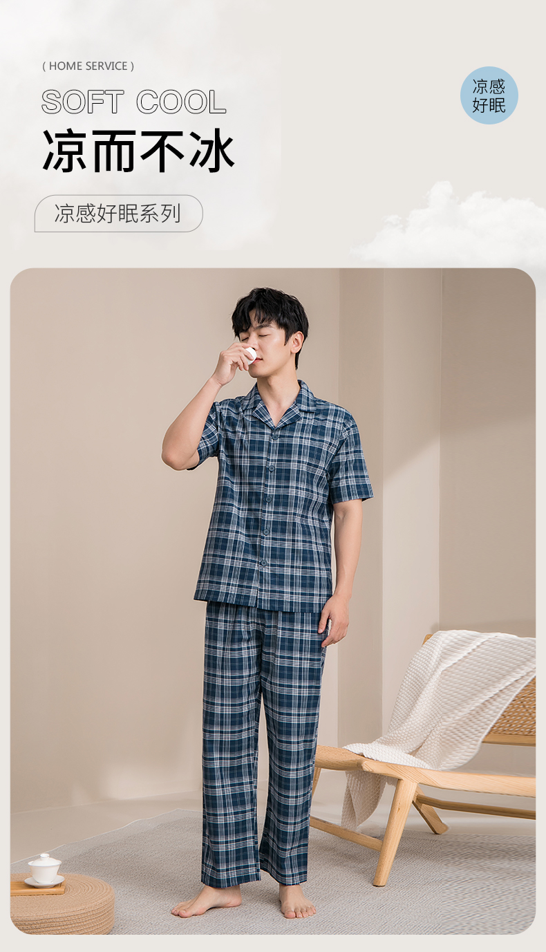 康妮雅2023春夏男士睡衣男式短袖长裤开襟套装