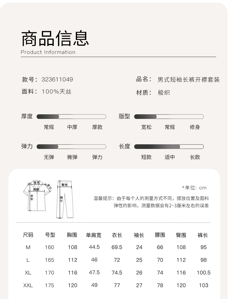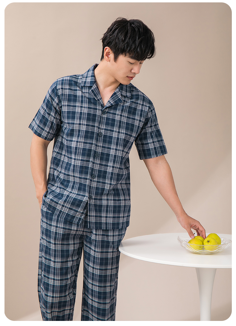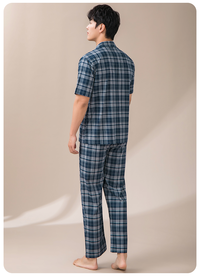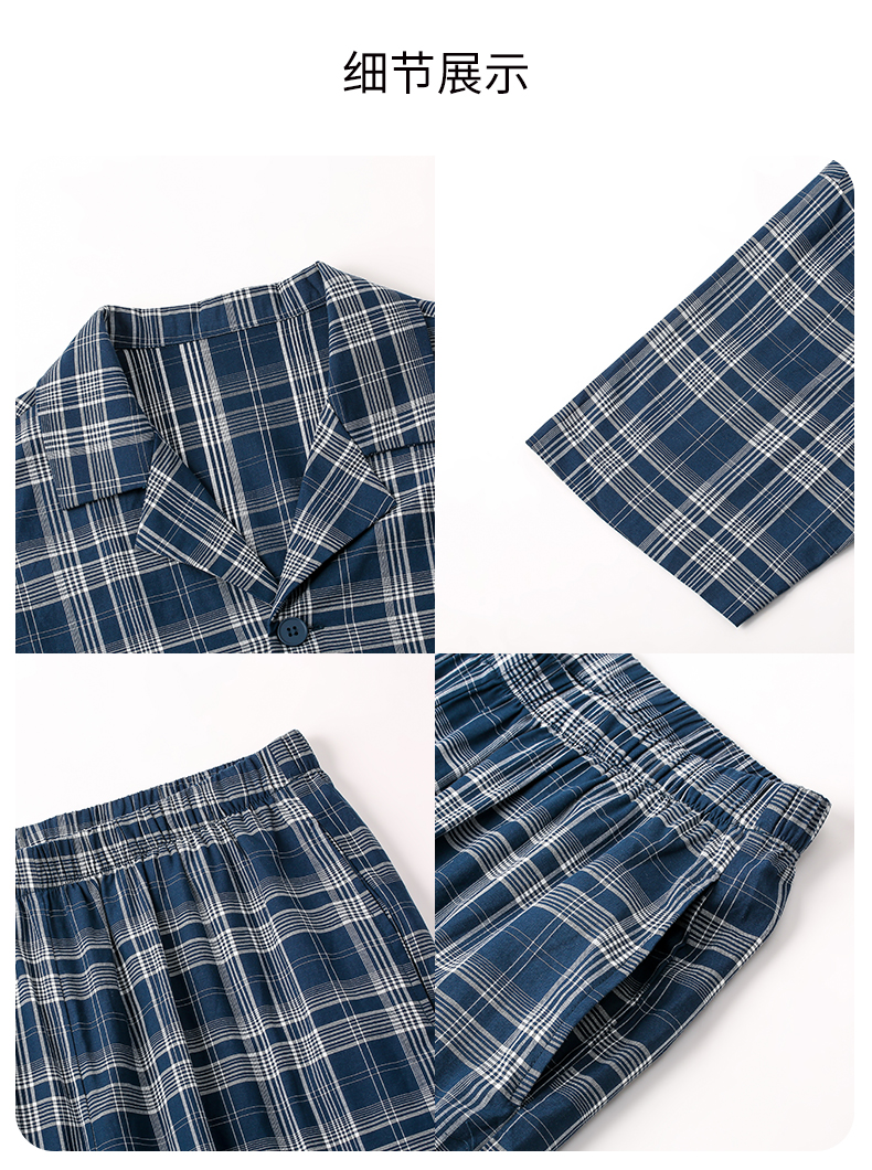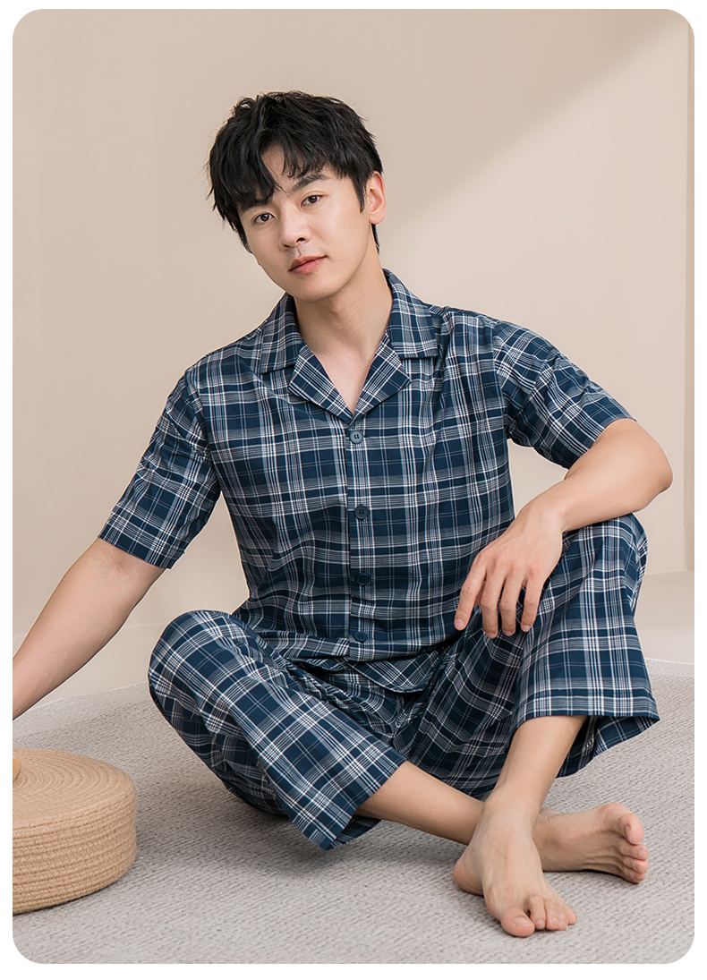 康妮雅2023春夏男士睡衣男式短袖长裤开襟套装