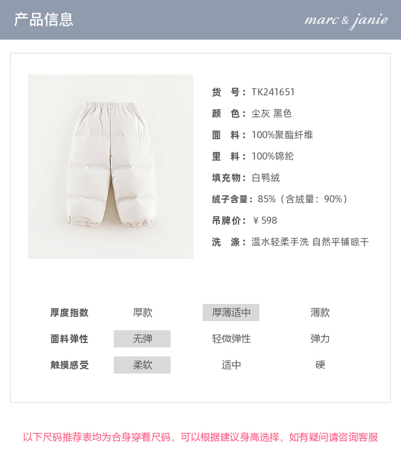【无缝羽绒裤】马克珍妮男女童户外三防束脚羽绒裤冬装新款241651