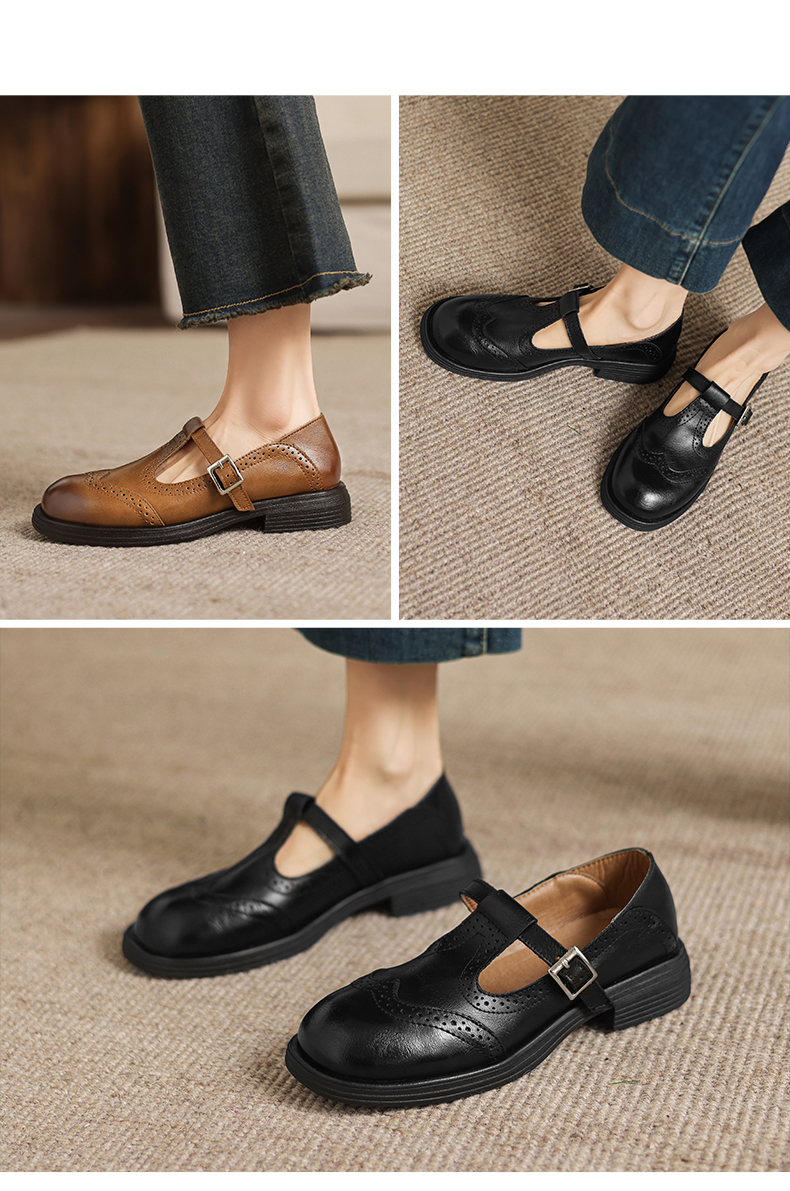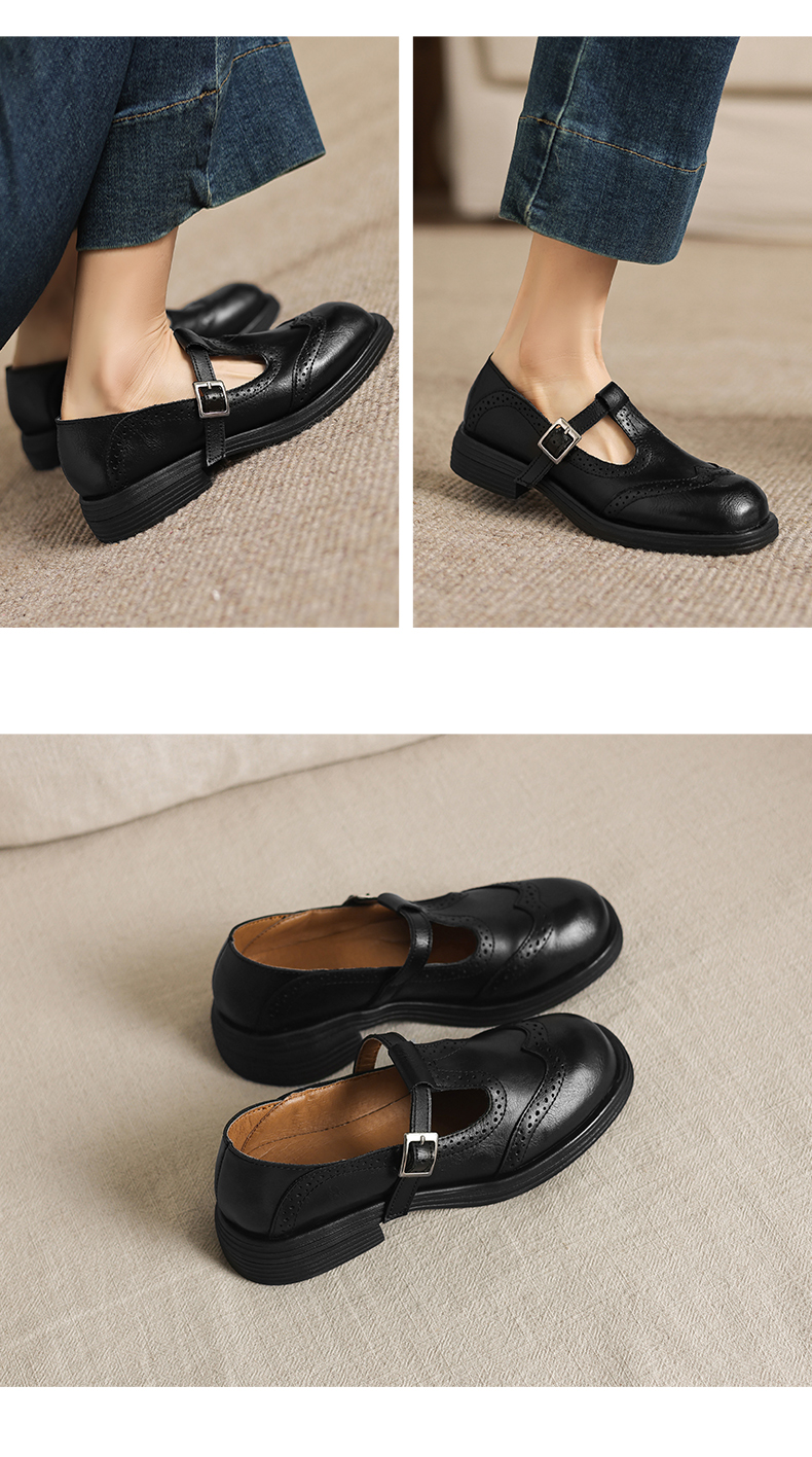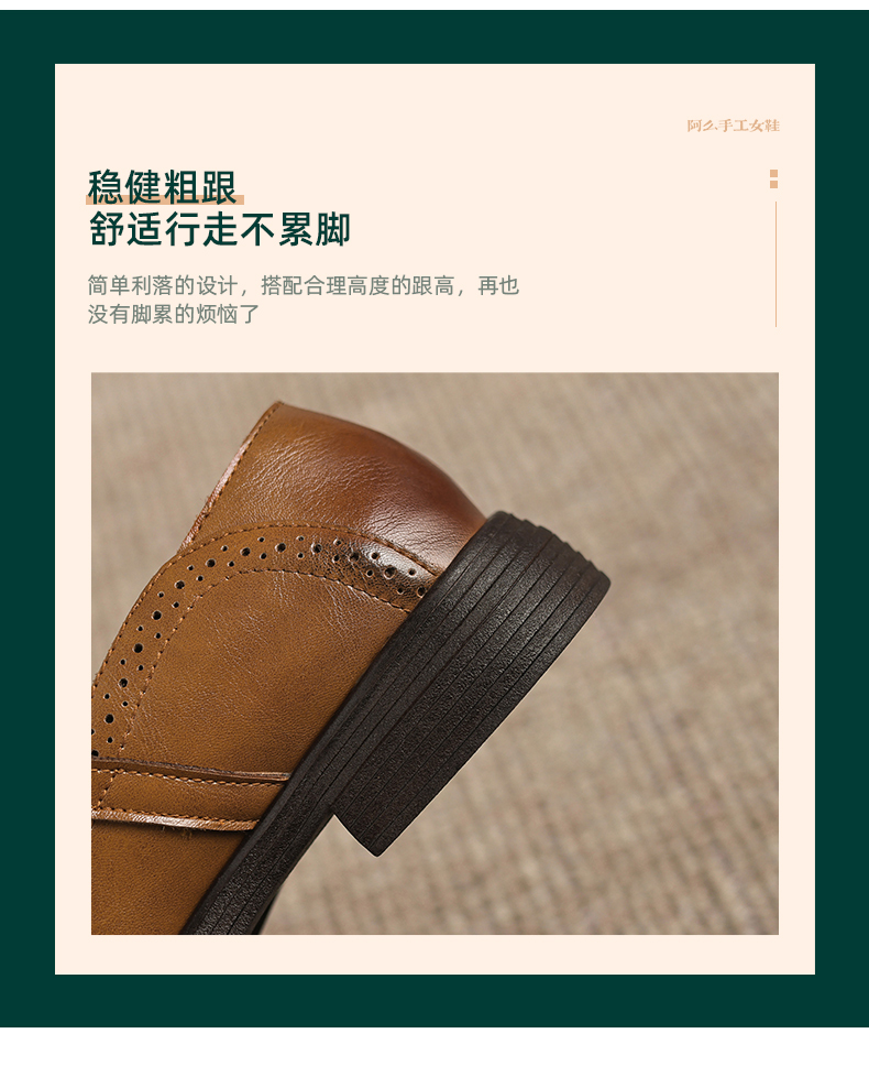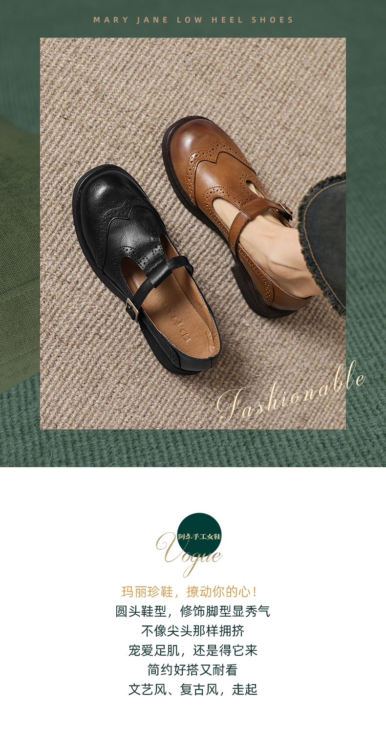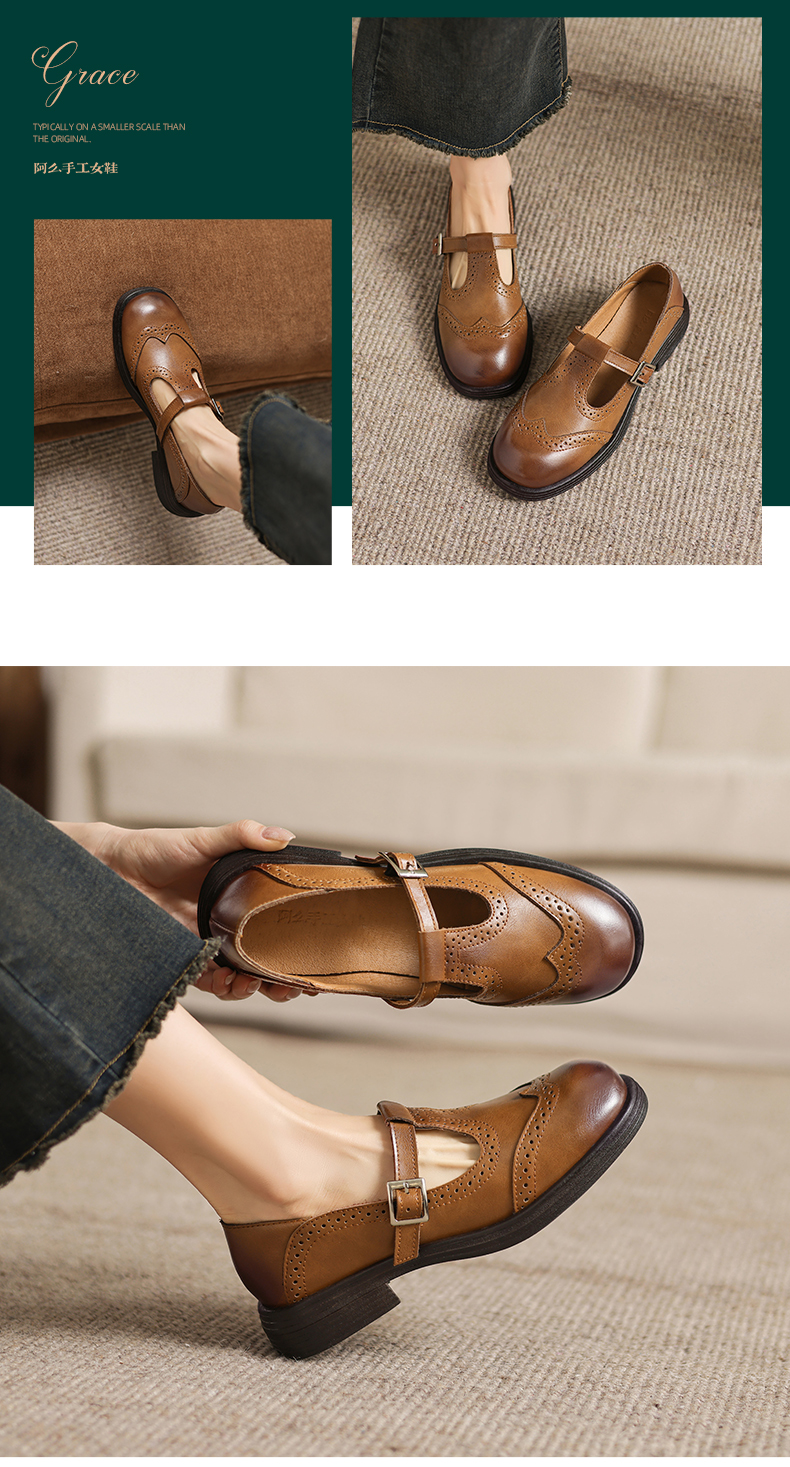 阿么手工女鞋春季百搭复古雕花真皮小皮鞋女英伦风丁字扣单鞋3CM