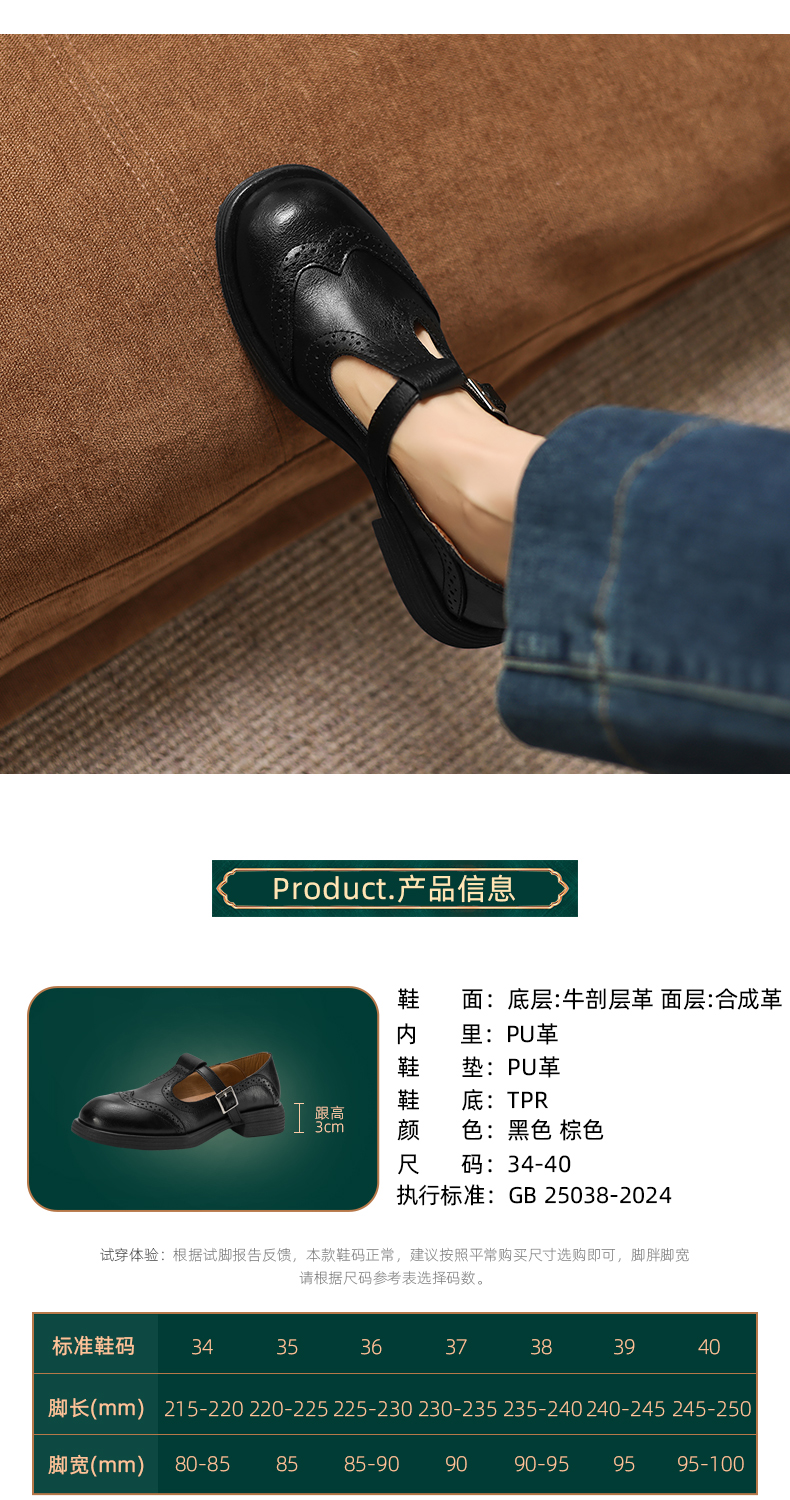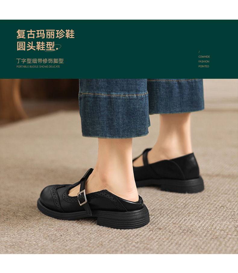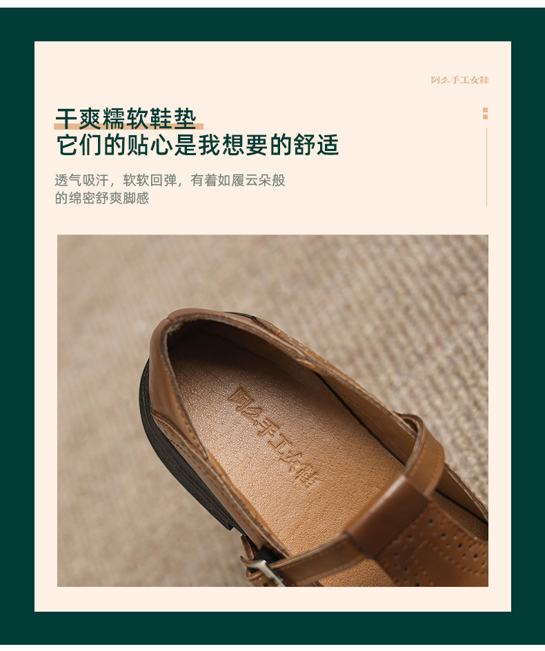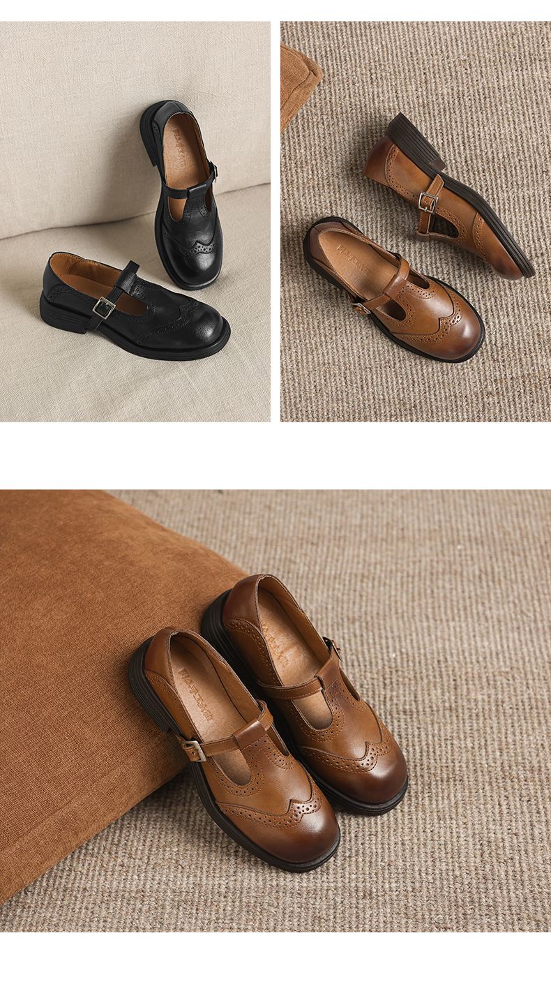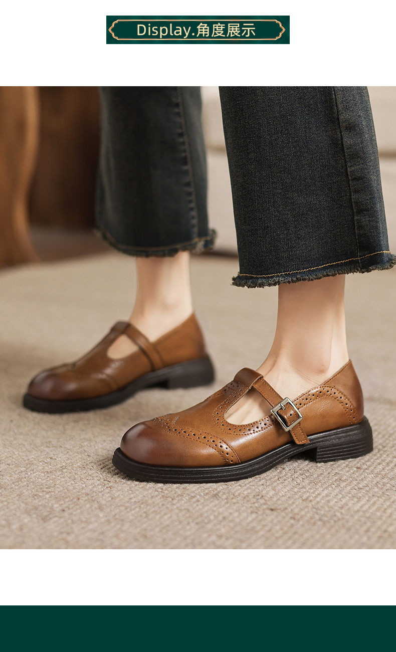 阿么手工女鞋春季百搭复古雕花真皮小皮鞋女英伦风丁字扣单鞋3CM