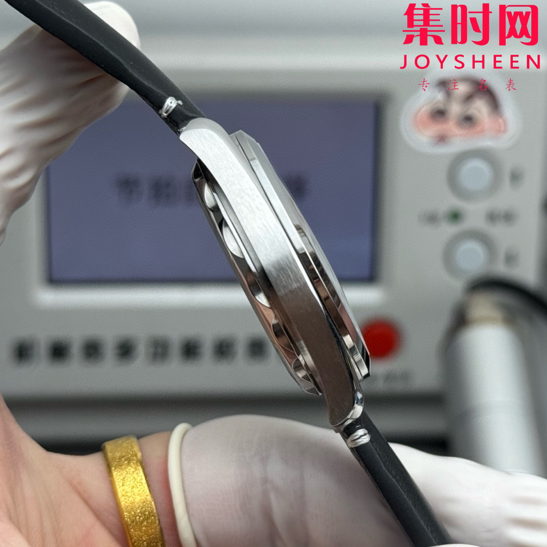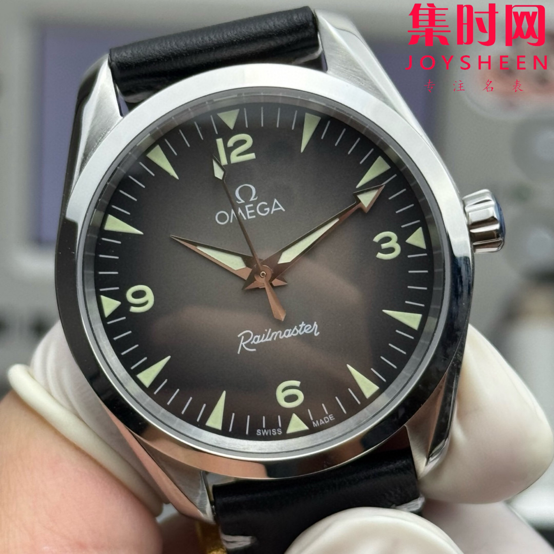 欧米茄 OMEGA 三针 Railmaster 铁霸系列 男士腕表 采用了与海马系列 Aqua Terra 相同的 38 毫米精钢表壳,厚度为 12.36 毫米,分别大三针与小三针两个版本。表盘为中心渐变过渡,哑光漆面效果,在三、六、九点位采用复古数字时标,搭配标志性的三角箭形指针,且刻度与指针均具备夜光效果。