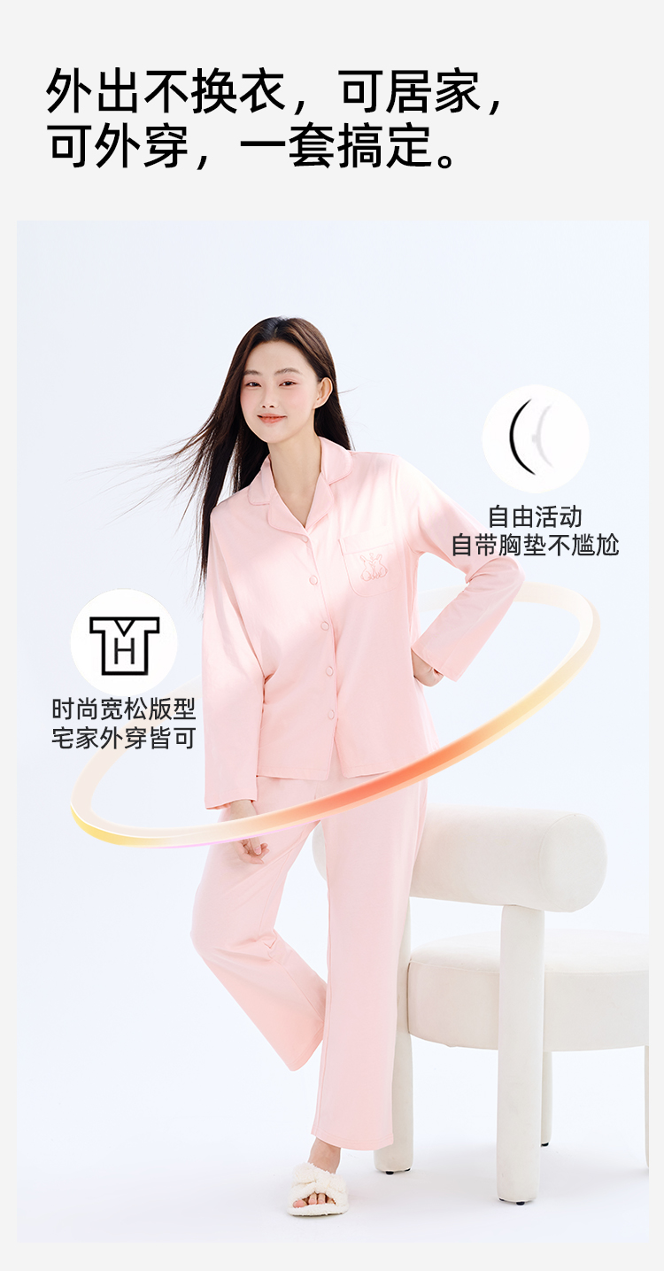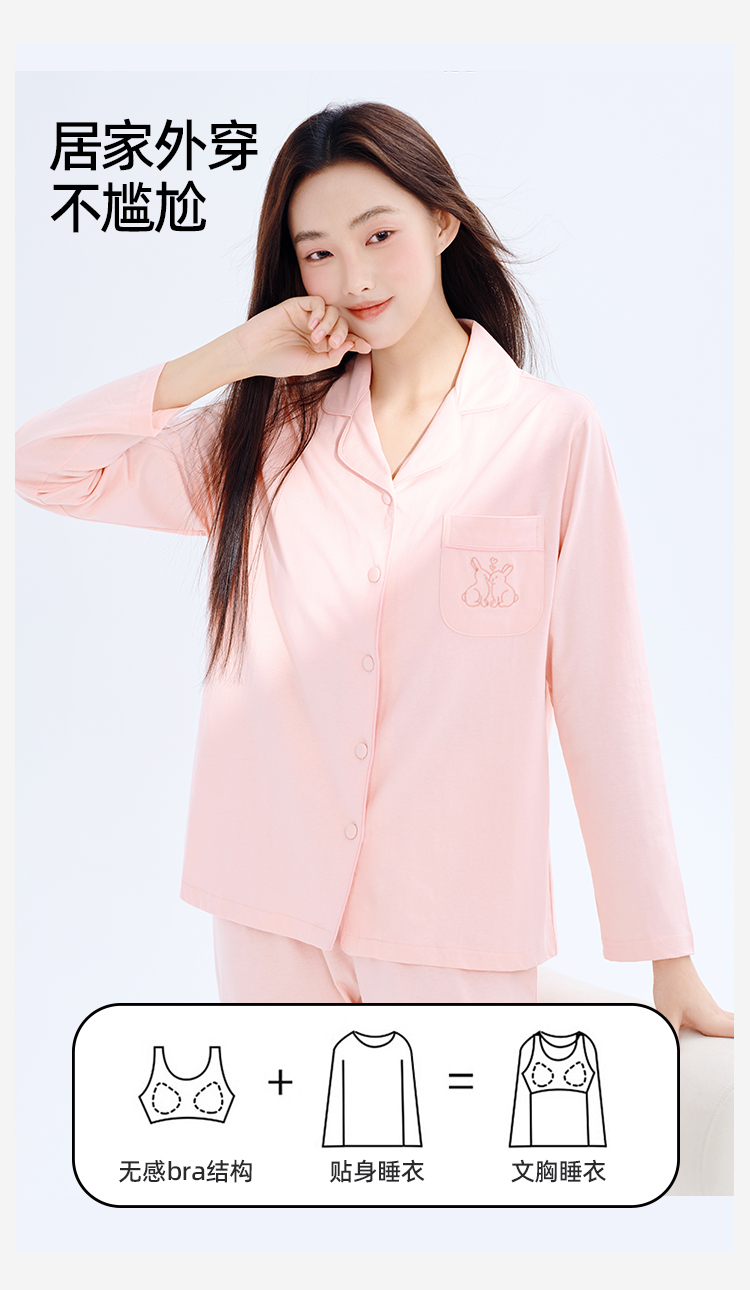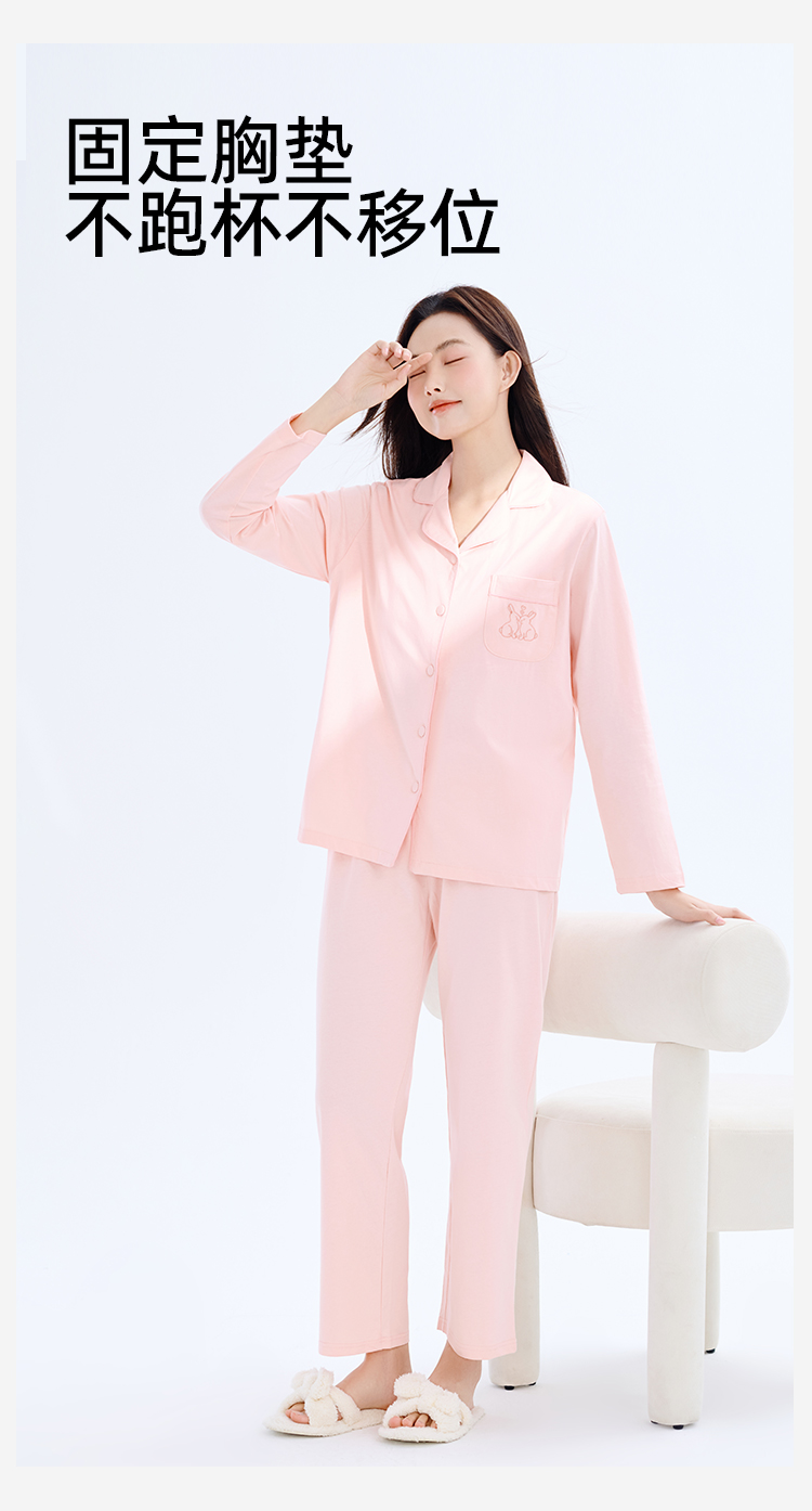 【带胸垫】熳洁儿 纯棉家居服女士开衫长袖长裤套装免穿文胸24753203