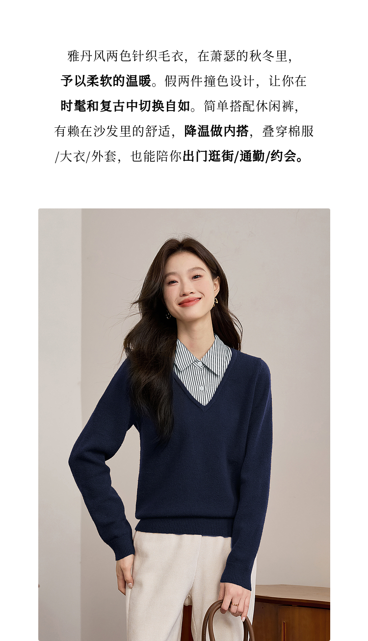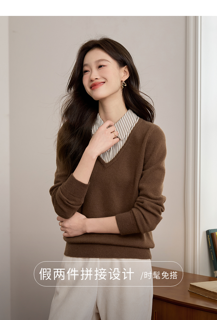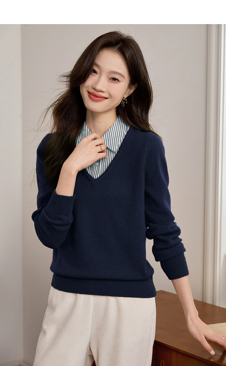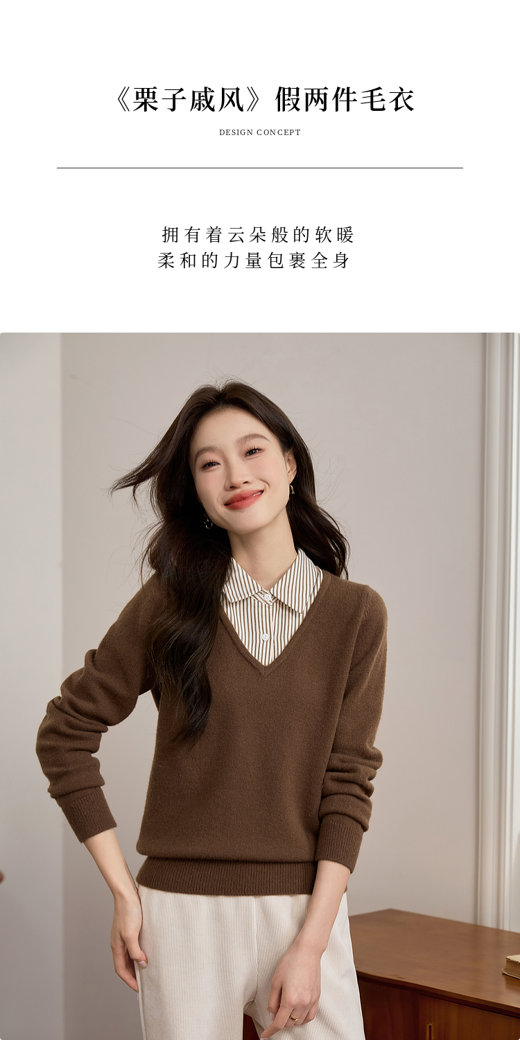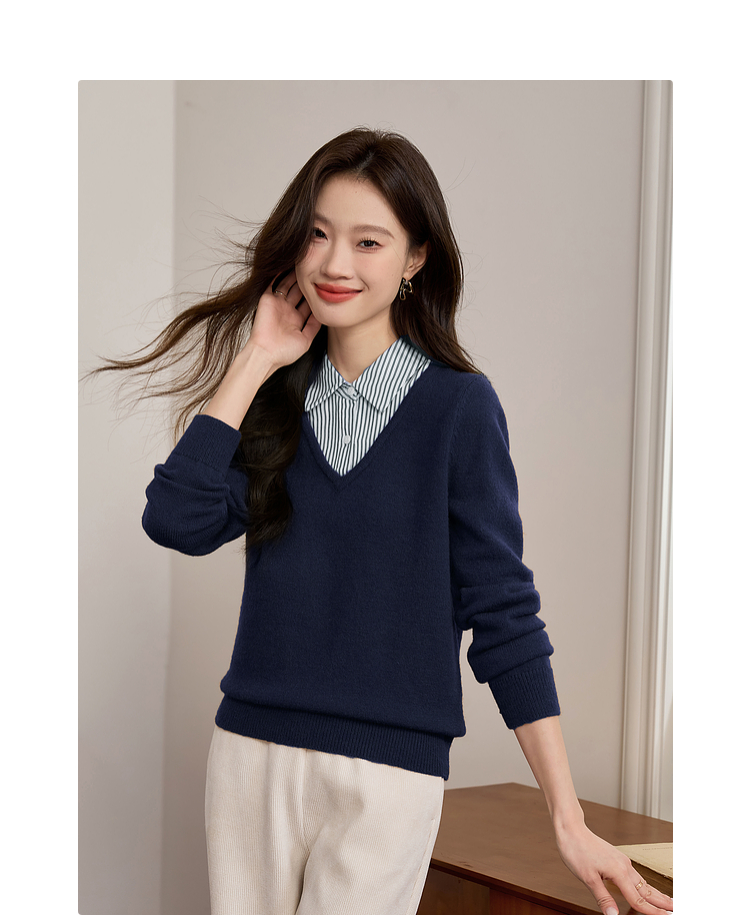 【专属特价】熙世界设计感条纹衬衫领拼接针织衫假两件打底毛衣女2025秋冬新款