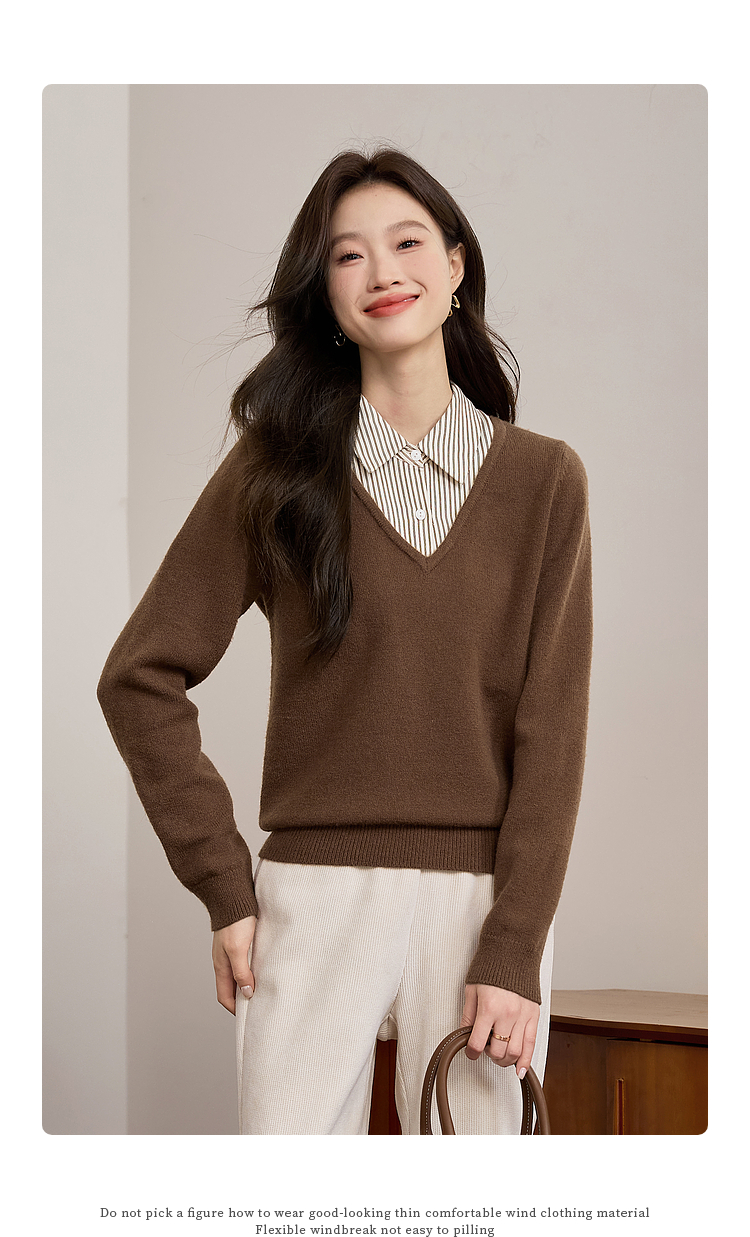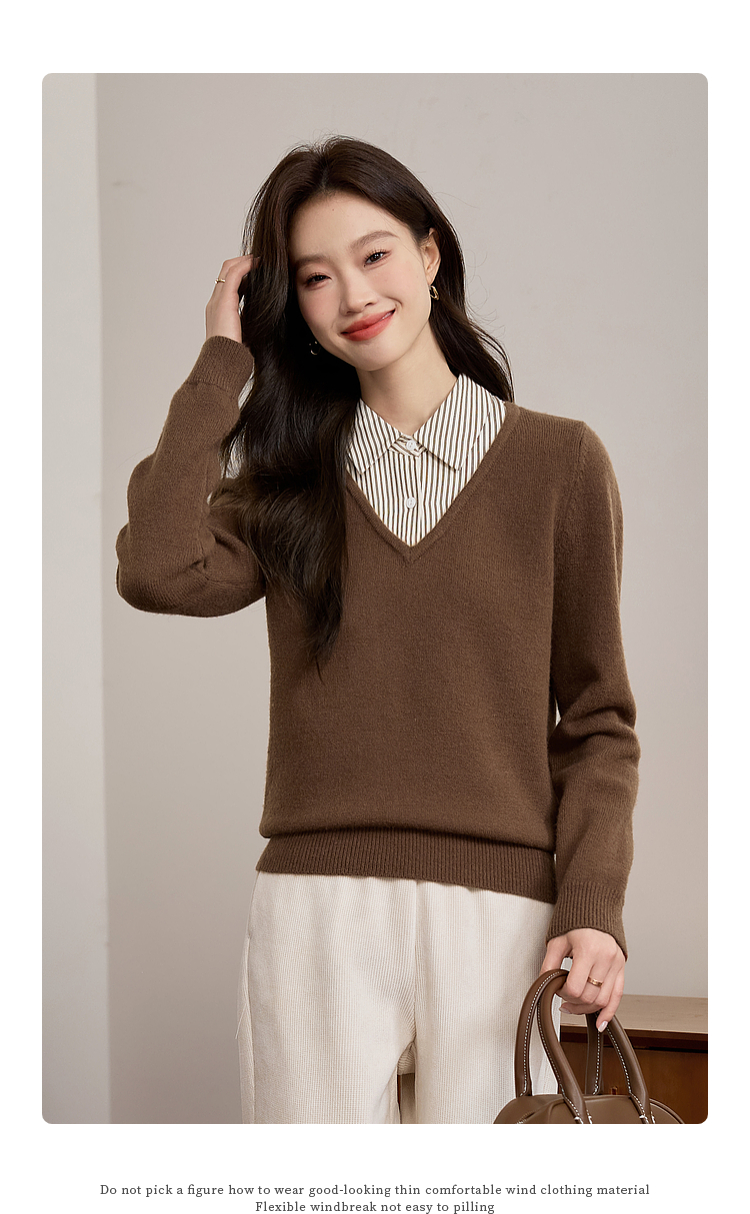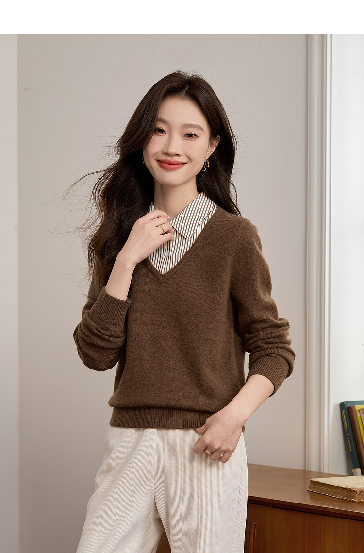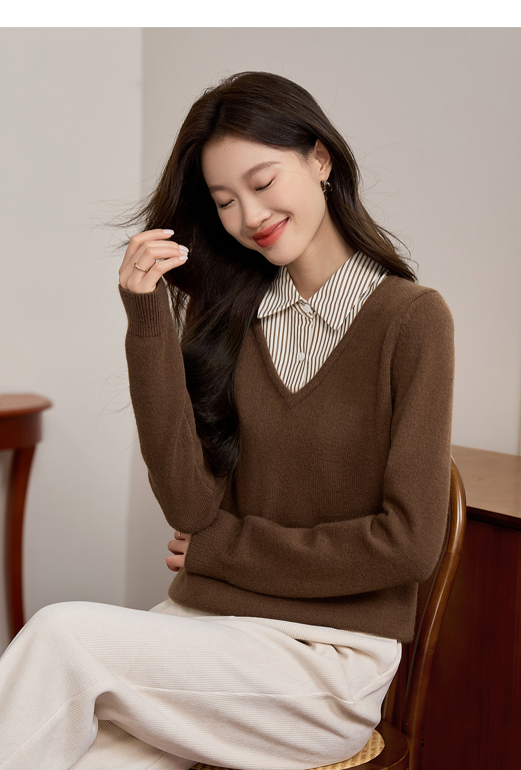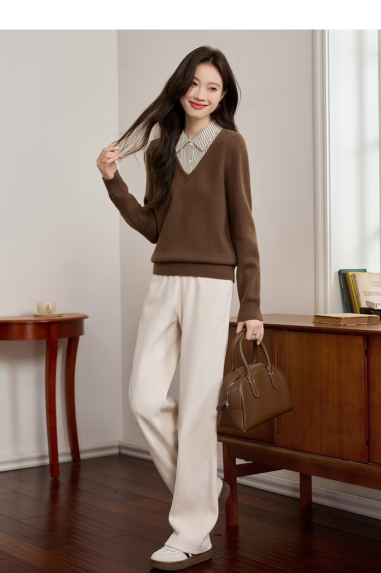 【专属特价】熙世界设计感条纹衬衫领拼接针织衫假两件打底毛衣女2025秋冬新款