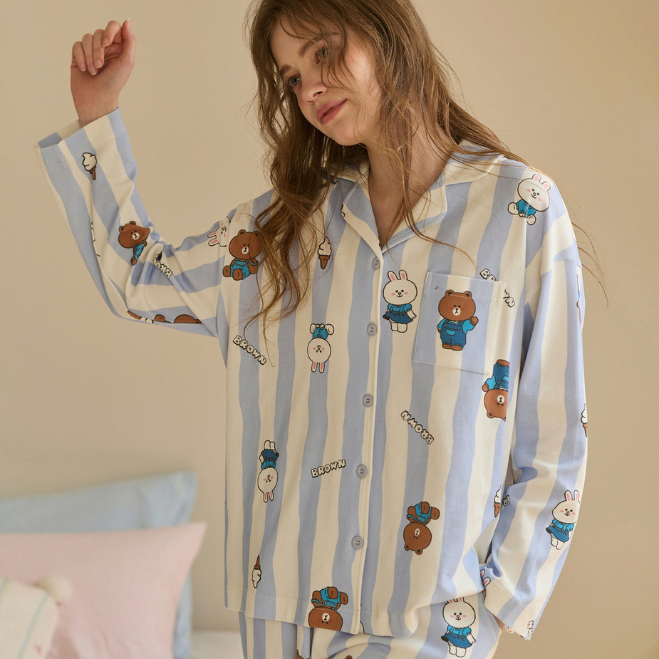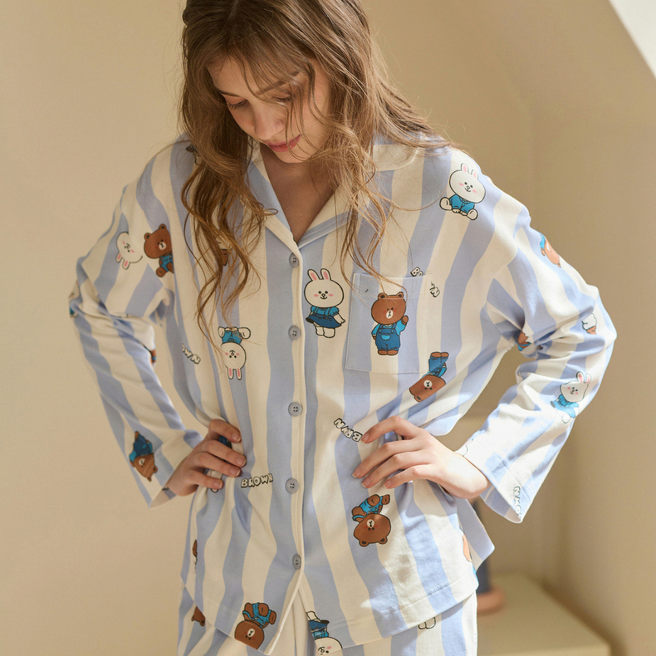【品牌直发 换季焕新】芬腾女士睡衣春秋季纯棉条纹长袖套装可爱布朗熊休闲舒适家居服女