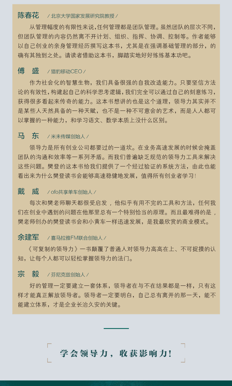 作为社会化的智慧生物的人,我们是具备很强的自我改造能力的,只要坚信方法论的有效性,构建起自己的科学思考逻辑,我们可以用自己对自己的刻意练习,去实现很多看起来传奇的能力。这本书想讲的也是这个道理,领导力其实并不是某些人天然具备的一种天赋,也不是一种不可意会的艺术,而是人人可以通过方法去掌握的一种能力,和语文、数学本质上没什么区别。