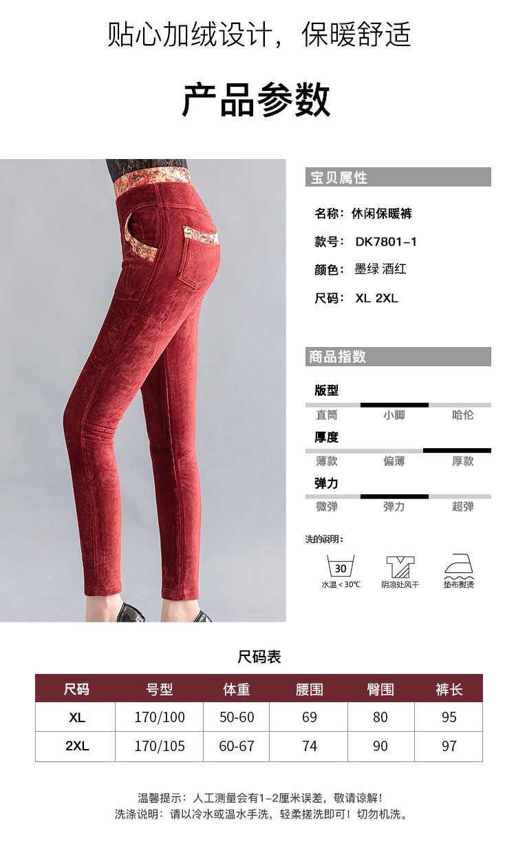 特价【清仓大促】洁丽雅女士灯芯绒时尚休闲保暖打底裤