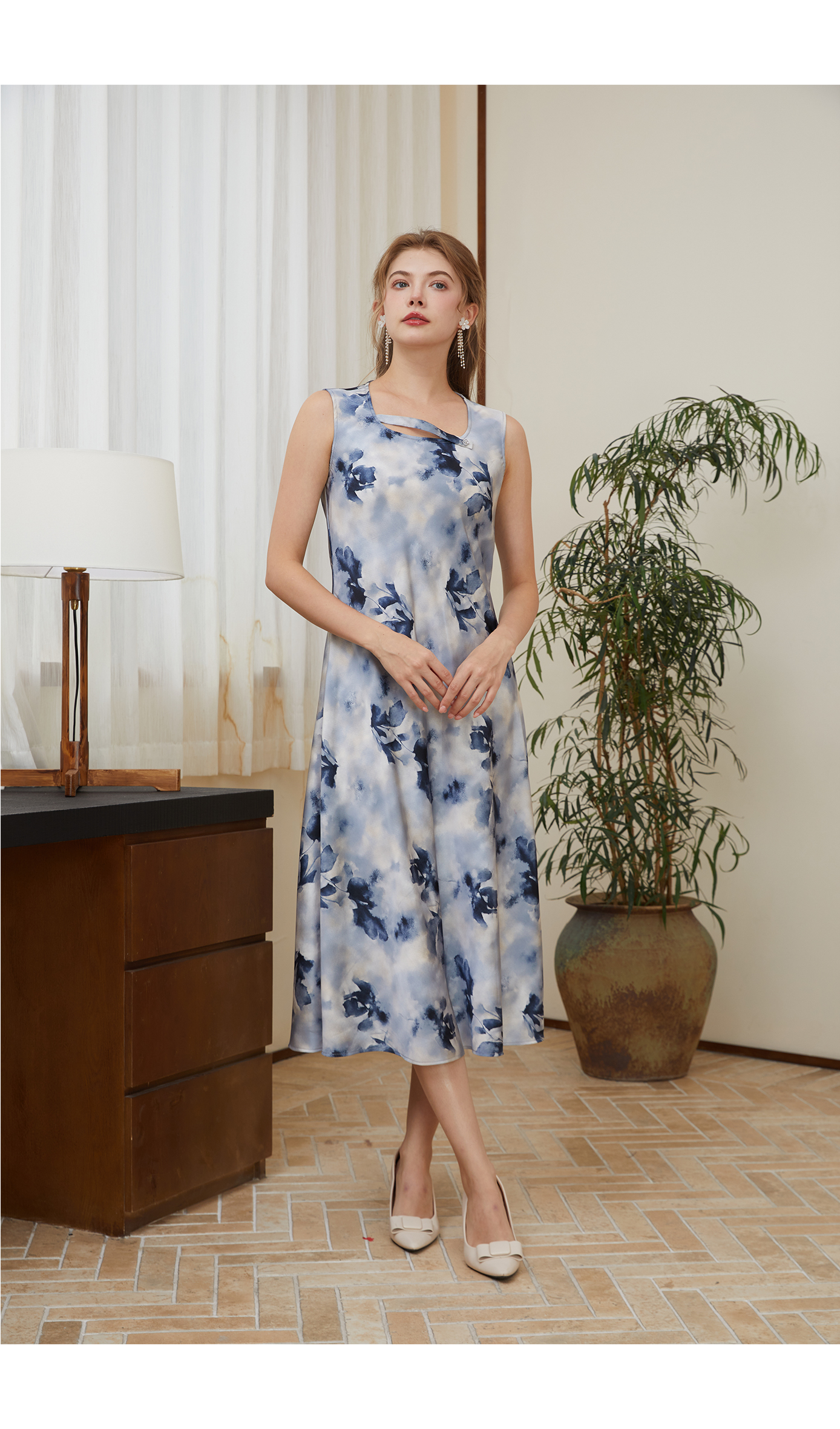 司歌飘逸网纱印花长袖连衣裙收腰A881067