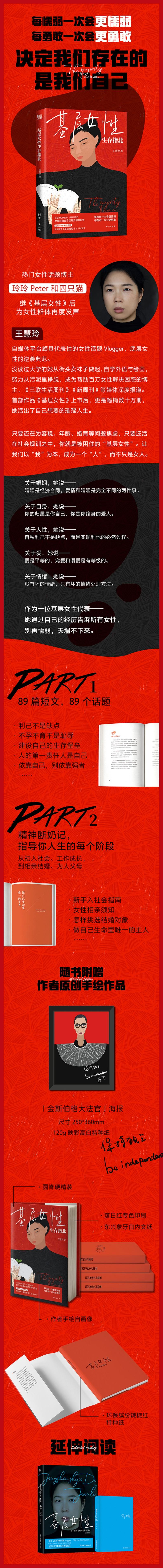 作者王慧玲是当下自媒体平台颇具影响力的女性话题Vlogger,是一位犀利的“基层女性”代表。没有读过大学的她从在街头卖袜子做起,自学外语与绘画,努力从污泥里挣脱,如今成为帮助上百万女性解决困惑的博主,她的图书《基层女性》上市一年销量数十万册——她活出了自己想要的璀璨人生。王慧玲在书中以一种亲历者的眼光,体察女性群体在家庭、职场、生活中可能遇到的种种困境,用自己出身底层、从农村打拼到城市的切身经历,总结出实际可行的应对方法,与广大女性分享如何才能挖掘内在的力量,实现物质与精神层面的双重独立。书中饱含着作者身为一名基层女性对自身命运的觉察与自省,以及她对女性群体的思考和关注。